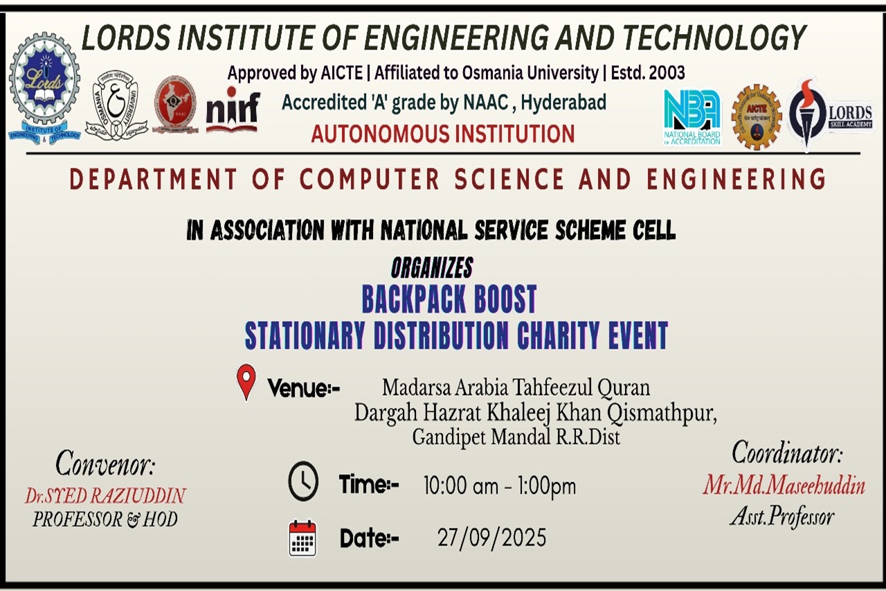 Backpack Stationary Distribution The Backpack Boost event is a stationery distribution drive organized by the Department of CSE – Data Science at Lords Institute of Engineering and Technology, in association with the National Service Scheme (NSS) Cell. It will be held at the Knowledge School of Ambition on 29th July 2025, from 10:00 AM to 01:00 PM. The initiative aims to support students by providing essential educational supplies and fostering learning through community outreach.