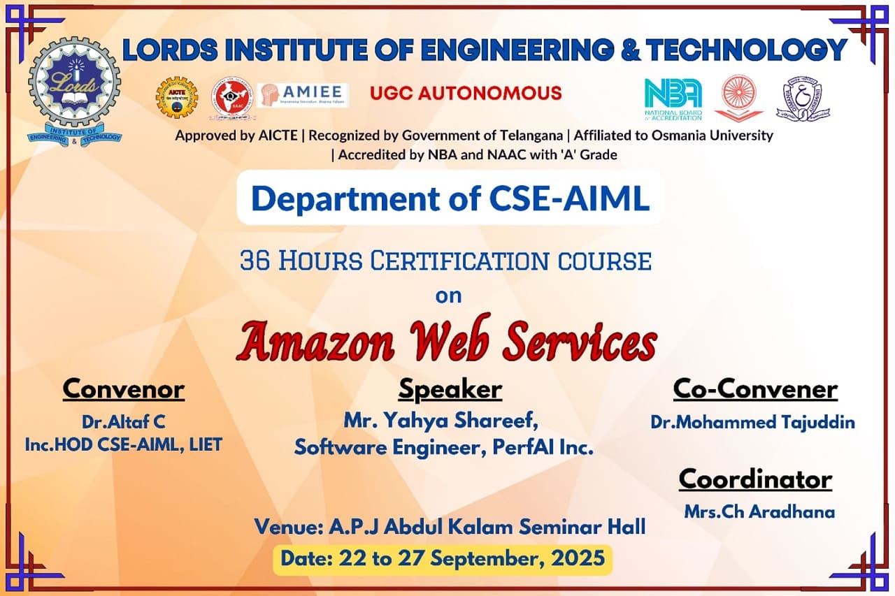 Certification Course on AWS Department of CSE-AIML is conducting a 36 Hours Certification course on “Amazon Web Services” from 22nd to 27th Sep,2025