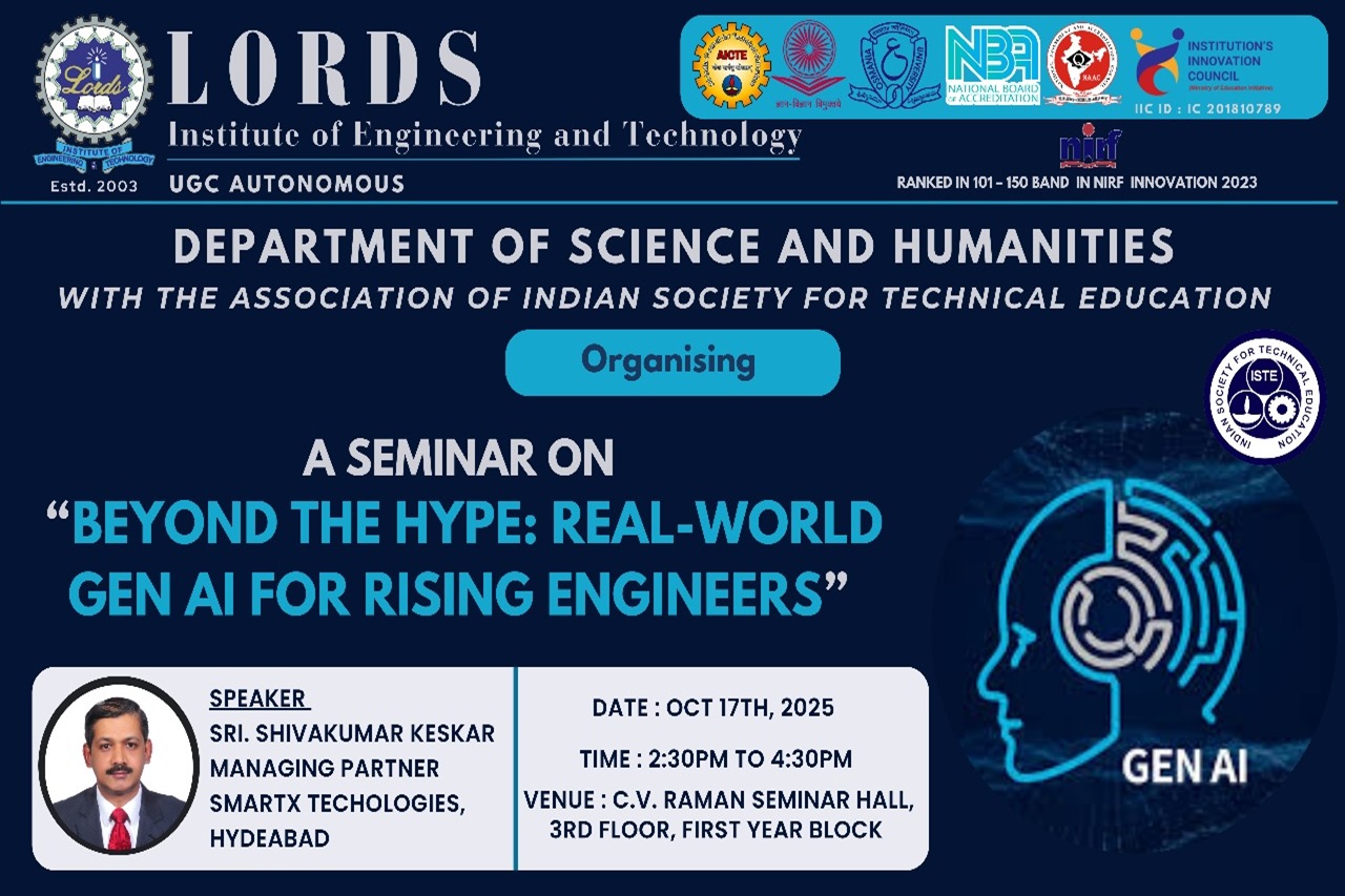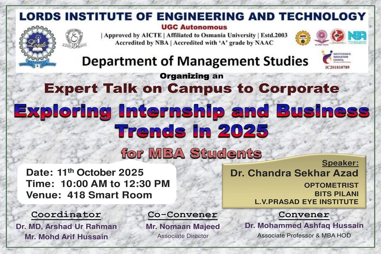 Expert Talk on “Nurturing New Ventures The Department of ECE, Lords Institute of Engineering & Technology(A), presents an Expert Talk on “Nurturing new ventures: The power of startup mentoring” by Prof. (Dr.) K. Jaya Sankar,Professor- ECE& Dean – R & D,Methodist college of Engineering and technology on 12-09-2025 on the 5th floor, ECE seminar hall.