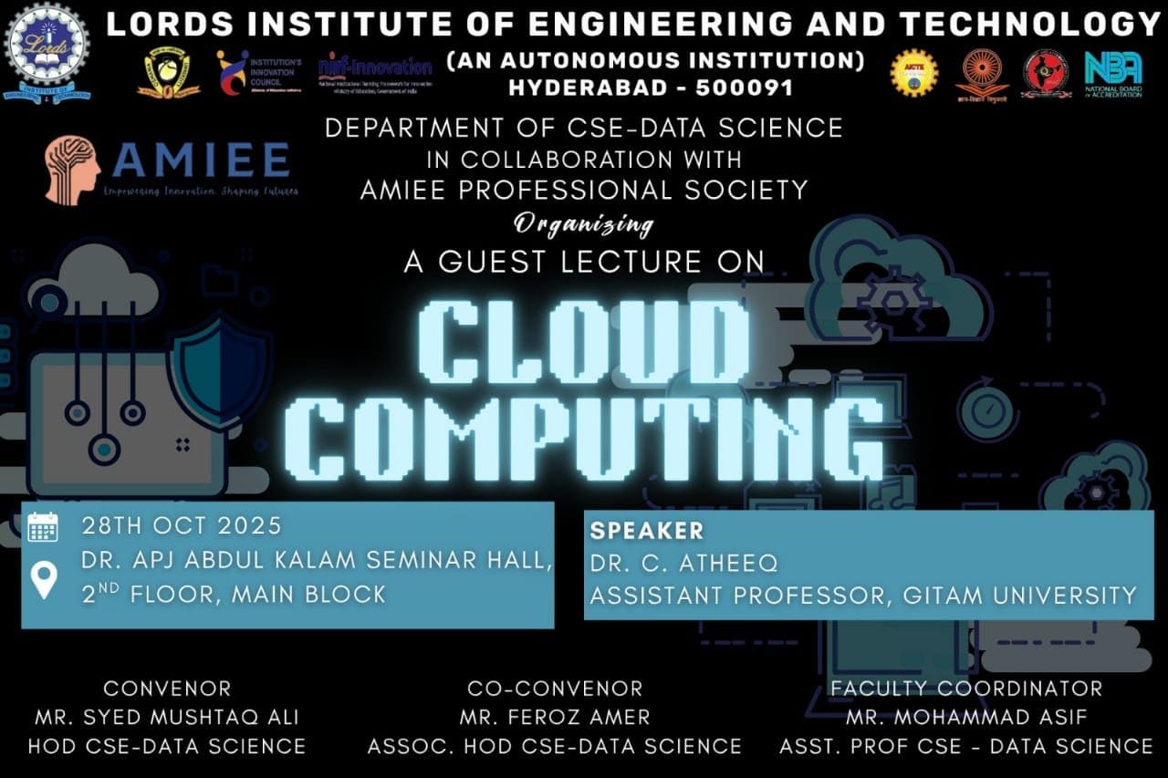 Guest Lecture on Cloud Computing The Department of CSE – Data Science, in collaboration with the AMIEE Professional Society, is organizing a Guest Lecture on Cloud Computing on 28th October 2025 at Dr. APJ Abdul Kalam Seminar Hall, 2nd Floor, Main Block.