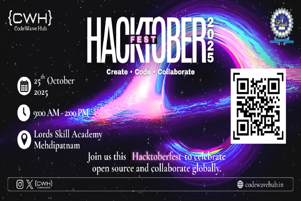 Hacktober Fest 2025 “CodeWave Hub (CWH) of Lords Institute of Engineering and Technology proudly presents Hactober Fest 2025 on 25th October 2025, empowered by Lords Skill Academy. This exciting coding event aims to ignite innovation, creativity, and collaboration among tech enthusiasts. Join us at Mehdipatnam, Hyderabad, for a day full of learning and hacking excellence!”