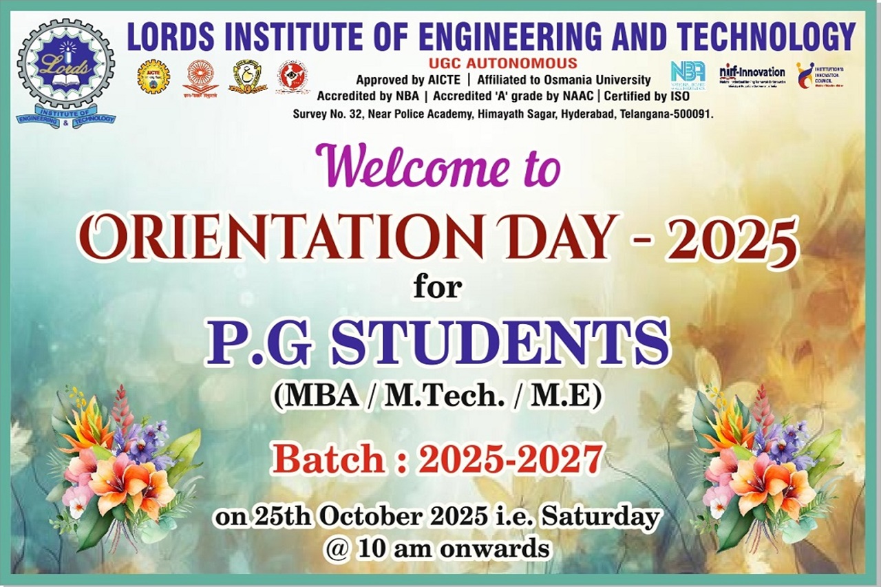 Orientation programme 2025 The Lords Institute of Engineering and Technology is organizing two grand events. The Orientation Programme for the 2025–2029 batch will be held on 28th August 2025 at 9:30 AM. Graduation Day-2025 will be celebrated on 29th August 2025 at 3:00 PM, welcoming students, parents, and staff with pride.