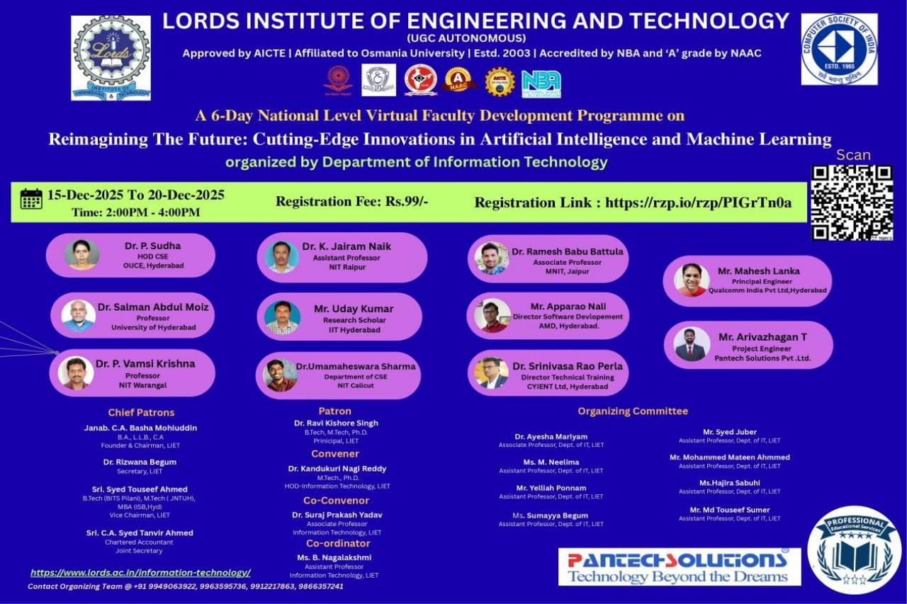 6-Day Virtual FDP on Reimaging the future Department of Information Technology in association with PANTECHSolutions has Conducting A 6 – Day Online FDP on “Reimagining the future: Cutting-edge innovations in Artificial intelligence and Machine learning” on 15-12-2025 to 20-12-2025 from 02:00PM to 04:00 PM Virtual mode at, LIET.