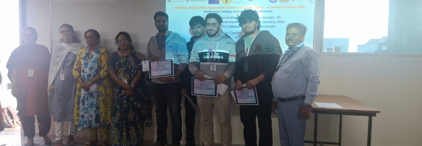 Congratulations to the following 3rd Year Information Technology students for securing First Prize in the National Hackathon conducted as part of the India–AI Impact Summit 2026. The event was jointly organized by Vardhaman College of Engineering, Hyderabad, and Rajeev Gandhi Memorial Engineering College, Nandyal, and held on 21st–22nd January 2026 at Vardhaman College of Engineering, Shamshabad, Hyderabad. 1) Mr. Azam Amaan Khan 2) Mr. Amer Anus Thonder 3) Mr. Shams-uz-Zama Khan 4) Mr. Mohammed Yousha Khan