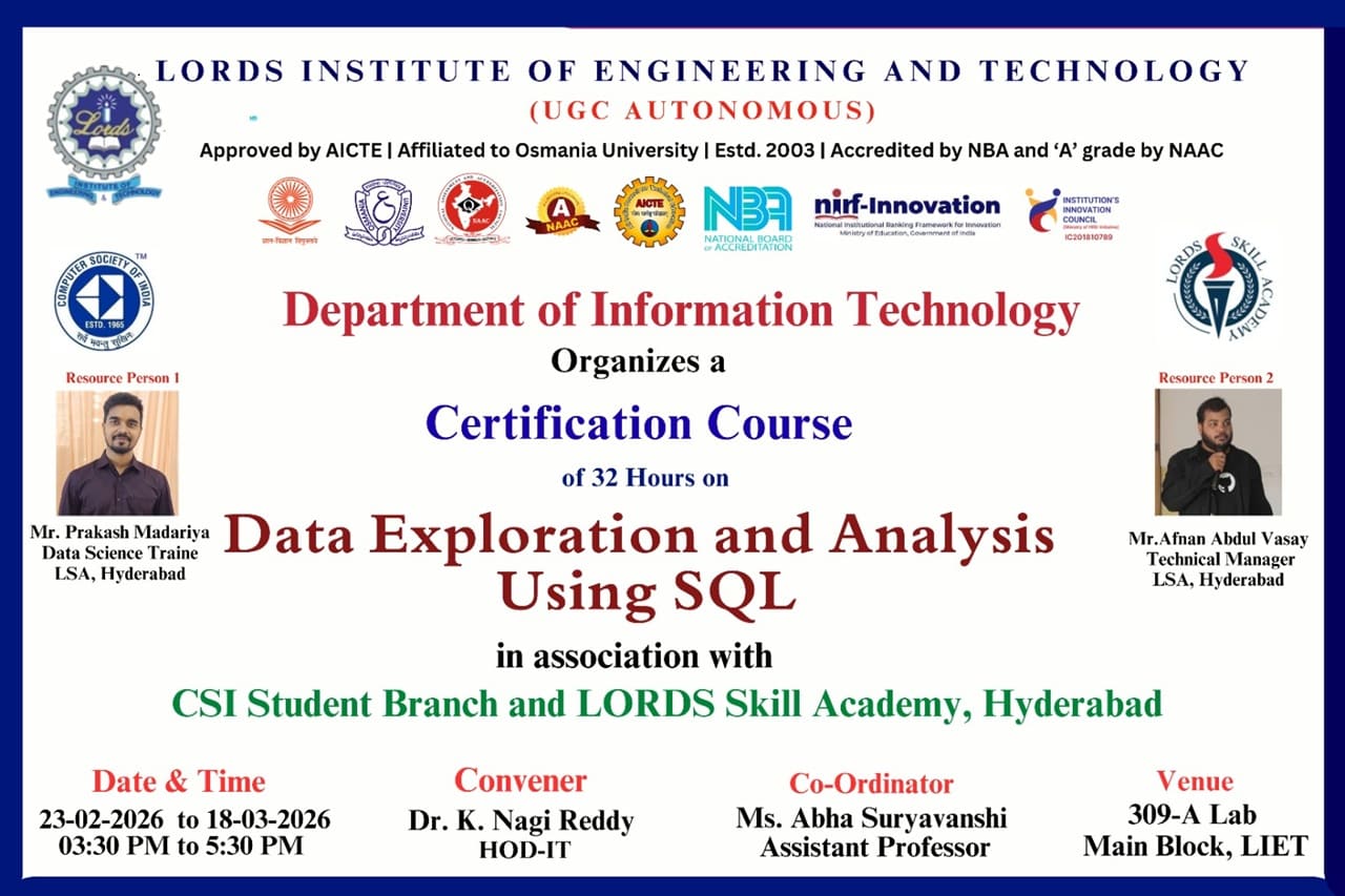 Certification Course on Data Exploration and Analysis The Department of Information Technology in association with CSI Student Branch and LORDS Skill Academy, Hyderabad, is organizing a 32-Hour Certification Course on “Data Exploration and Analysis Using SQL” from 23-02-2026 to 18-03-2026, scheduled daily from 03:30 PM to 05:30 PM in offline mode at 309-A Lab, Main Block, LIET.