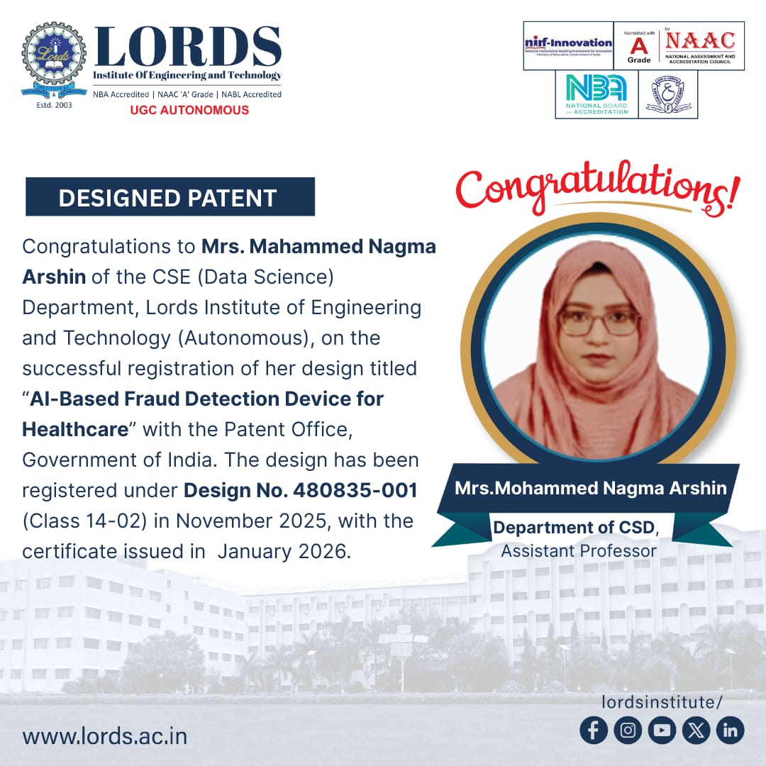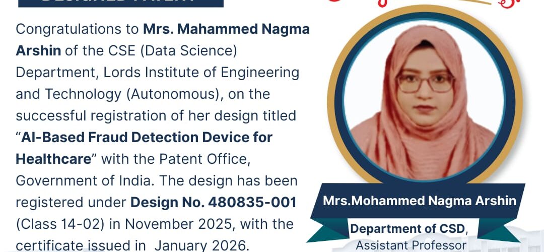 Congratulations to Mrs. Mahammed Nagma Arshin of the CSE (Data Science) Department on the successful registration of her design titled “AI-Based Fraud Detection Device for Healthcare” with the Patent Office, Government of India. The design has been registered under Design No. 480835-001 (Class 14-02) in November 2025, with the certificate issued in January 2026.