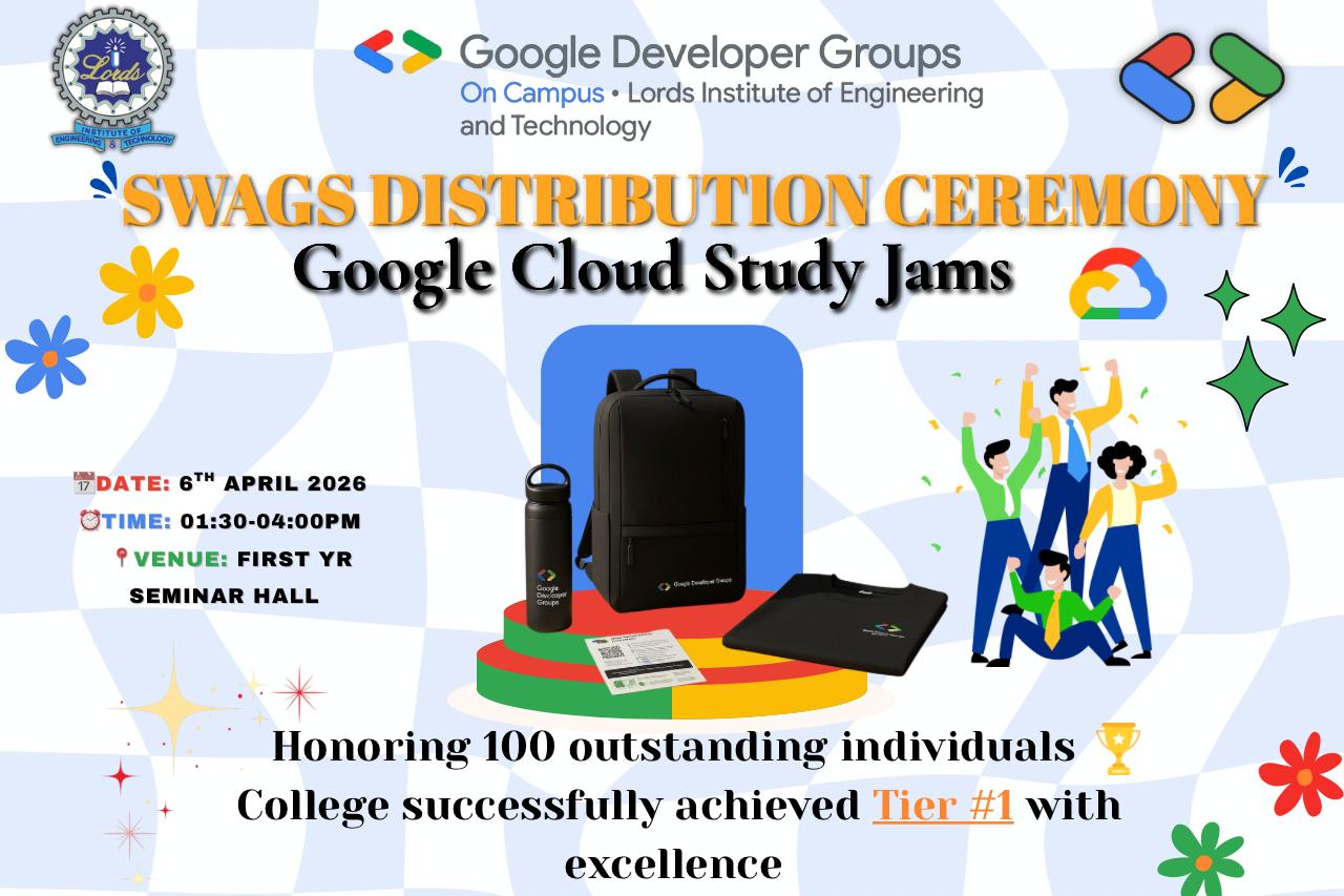 Join the Google Cloud Study Jams 2025 at Lords Institute of Engineering and Technology on 23rd September from 3:00 PM to 4:30 PM in the First Year Seminar Hall. Learn hands-on Google Cloud skills, win exciting goodies and swags! Register by 25th September 2025.