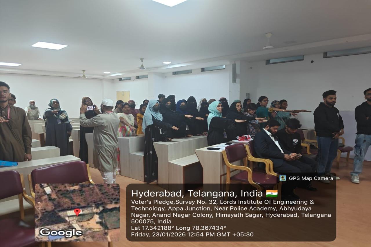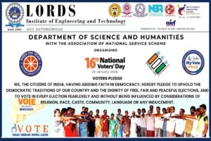 Description: The Department of Science and Humanities, in association with the National Service Scheme (NSS), organized the 16th National Voters’ Day on 23rd January 2026 at Lords Institute of Engineering and Technology. The program aimed to create awareness about the importance of voting and to strengthen democratic values among students and staff. Participants took the Voters’ Pledge, reaffirming their commitment to free, fair, and peaceful elections. The event highlighted responsible citizenship, electoral awareness, and active participation in the democratic process.