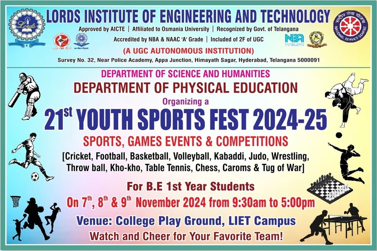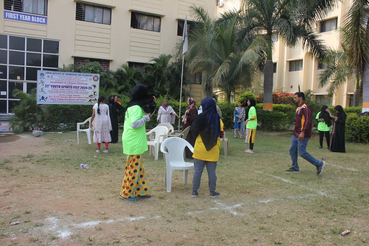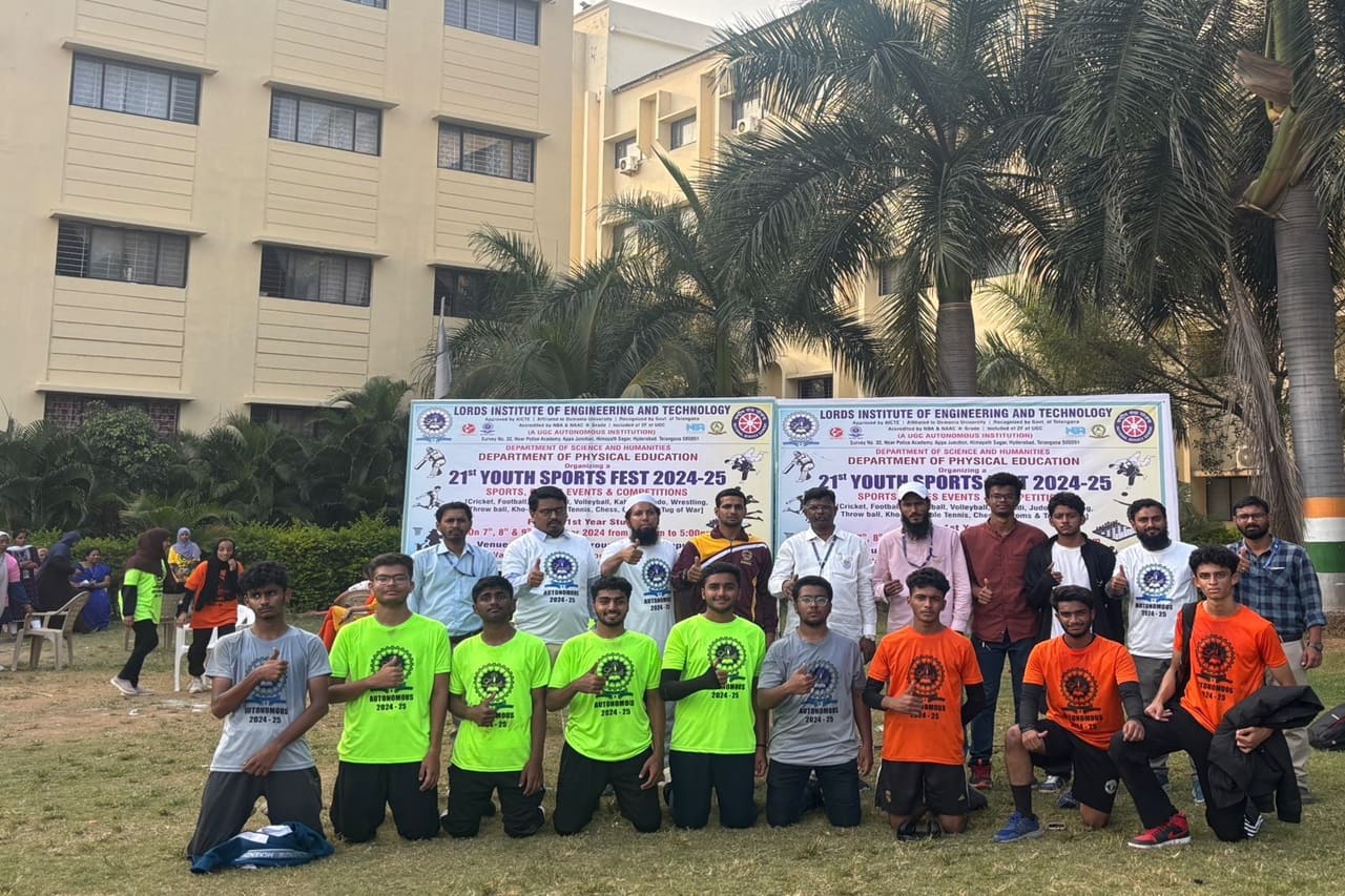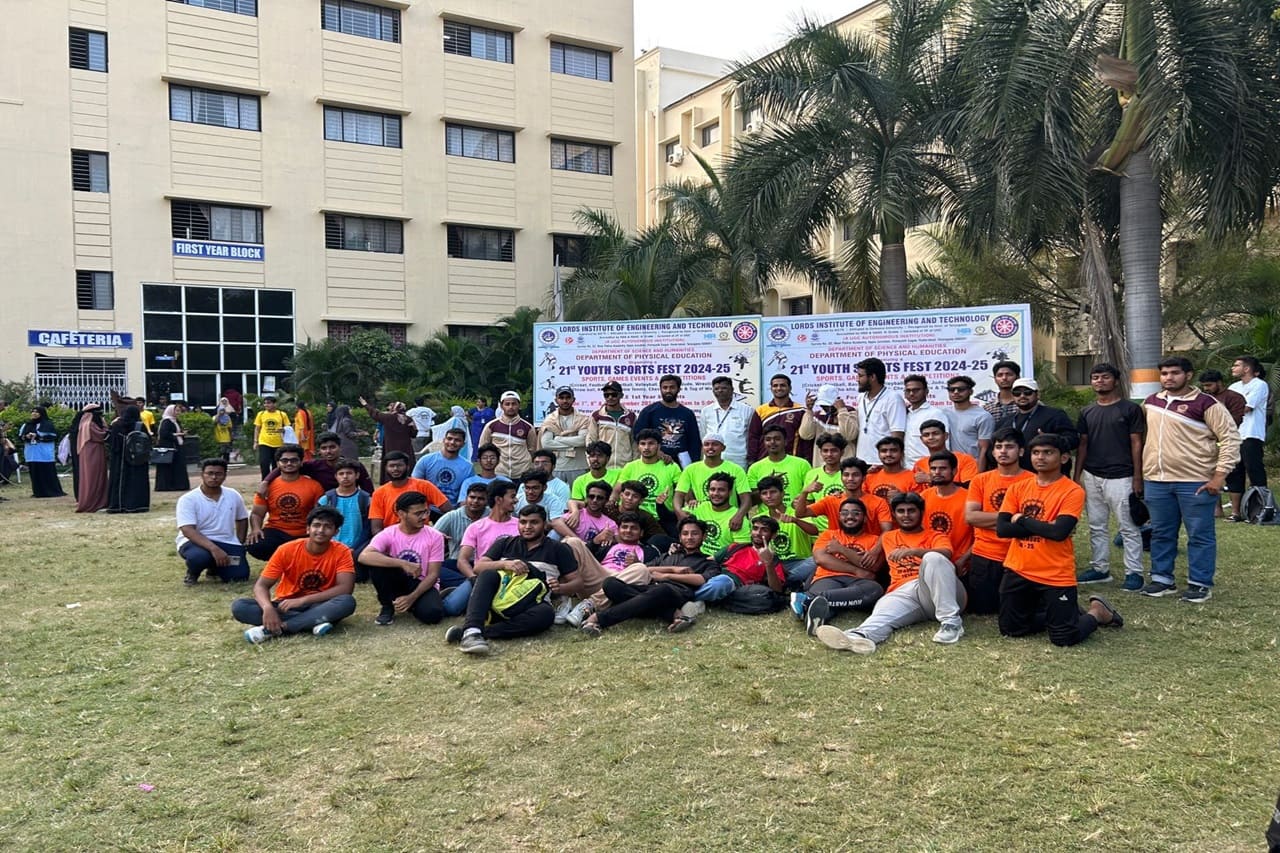 Description: The 21st Youth Sports Fest exclusively for B.E. 1st year students at Lords Institute of Engineering and Technology, hosted by the Department of Physical Education, sports & Game cell & Science, and Humanities, took place from 07th to 9th, November 2024 .running daily from 9:30 am to 5:00 pm. The fest witnessed active participation from numerous students in a wide array of sports, games, and competitions, including cricket, football, basketball, volleyball, kabaddi, judo, Karate, wrestling, throw ball , kho-kho, table tennis, chess, carom, and Tug of war. The primary goals were to nurture specific athletic skills, promote teamwork, improve physical fitness, and familiarize participants with the collegeβs campus.