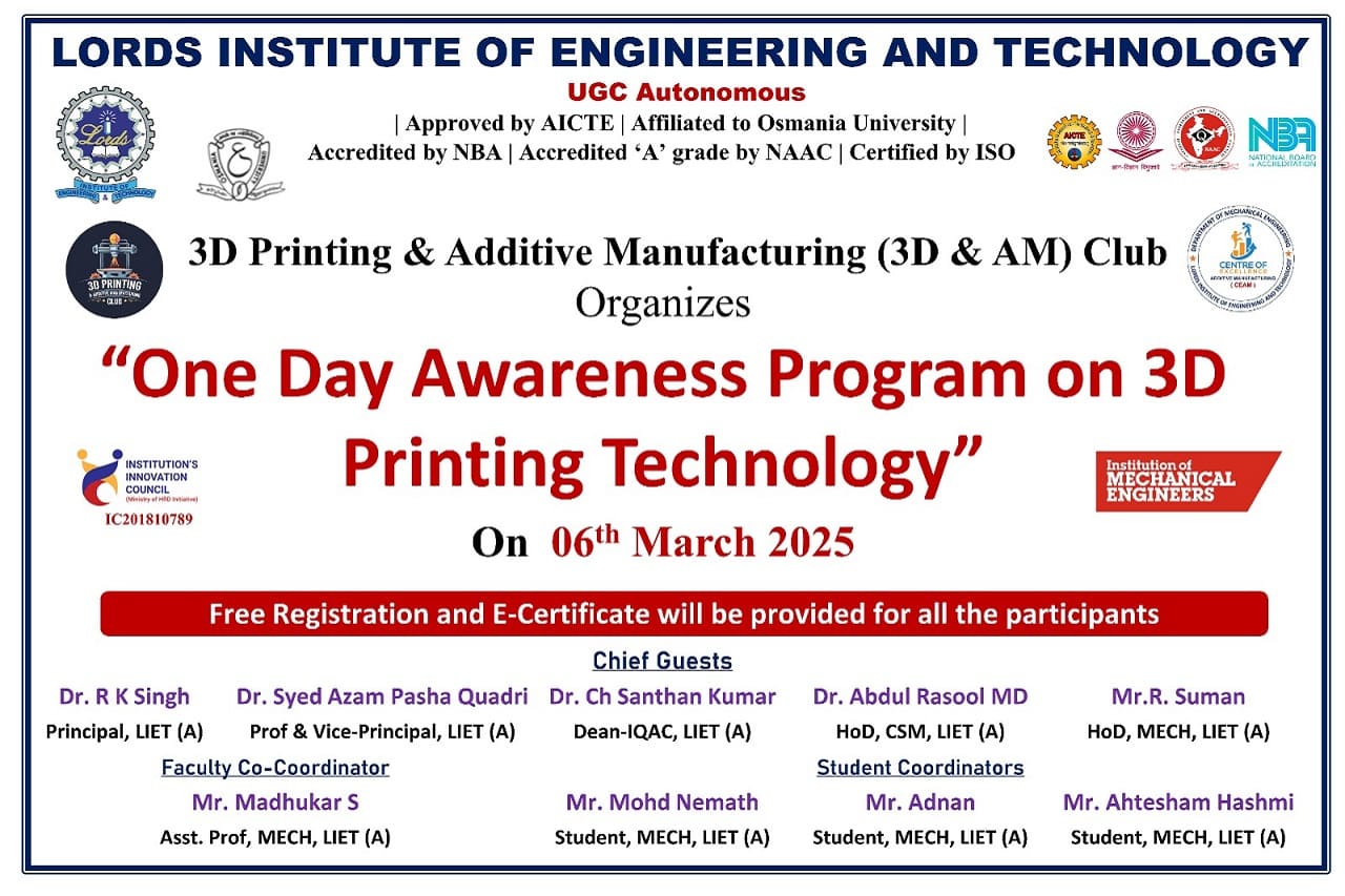 Description about the event (50 Words): An Awareness Program on 3D Printing Technology was successfully conducted, attracting 90 enthusiastic participants. The session highlighted the fundamentals, applications, and future potential of 3D printing across various industries. Experts demonstrated live printing, sparking curiosity and engagement. The event empowered attendees with knowledge to explore innovative manufacturing solutions.