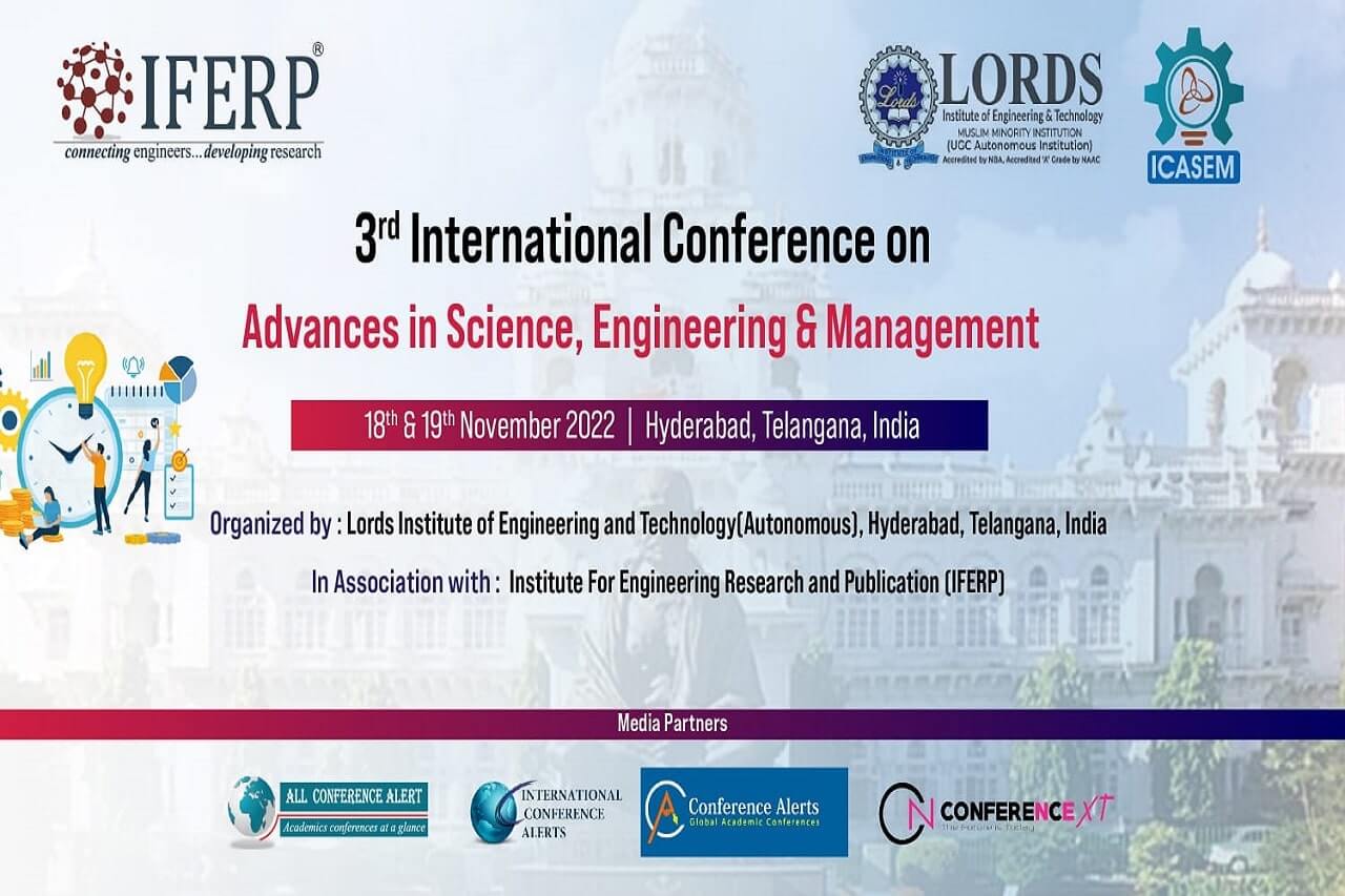 LORDS Institute of Engineering and Technology organized 3rd International conference on Advances in Science, Engineering and Management (ICASEM-2022) during 18-19 November 2022 in association with IFERP in hybrid mode.