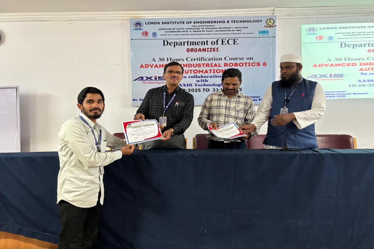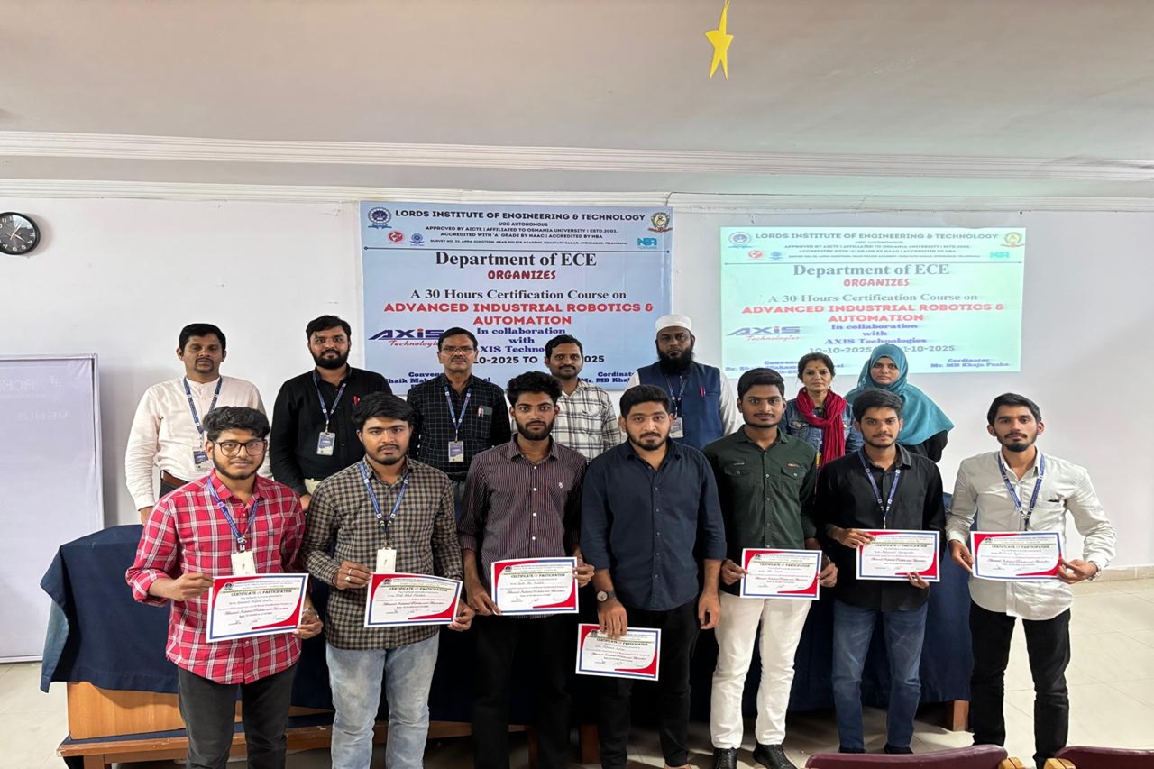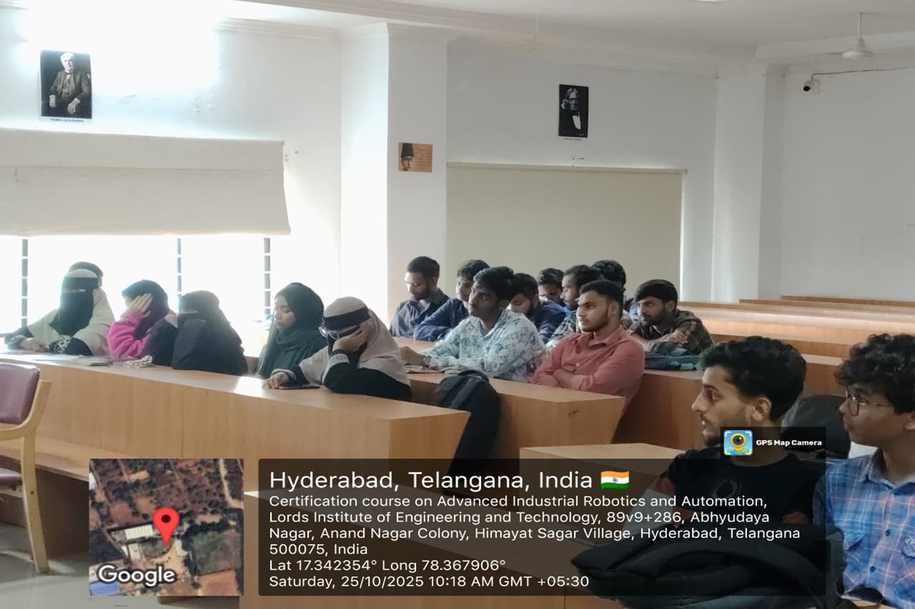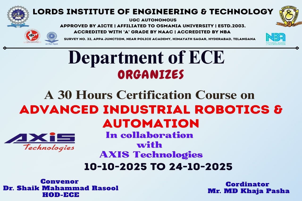 Description: The Department of ECE at Lords Institution of Engineering and Technology (Autonomous) successfully completed A 30-Hours Certificate Course on Advanced Industrial Robotics and Automation in collaboration with Axis Technologies from 10-31October 2025 at Maulana Abul Kalam Azad seminar hall 5th floor main block.The sessions were delivered by