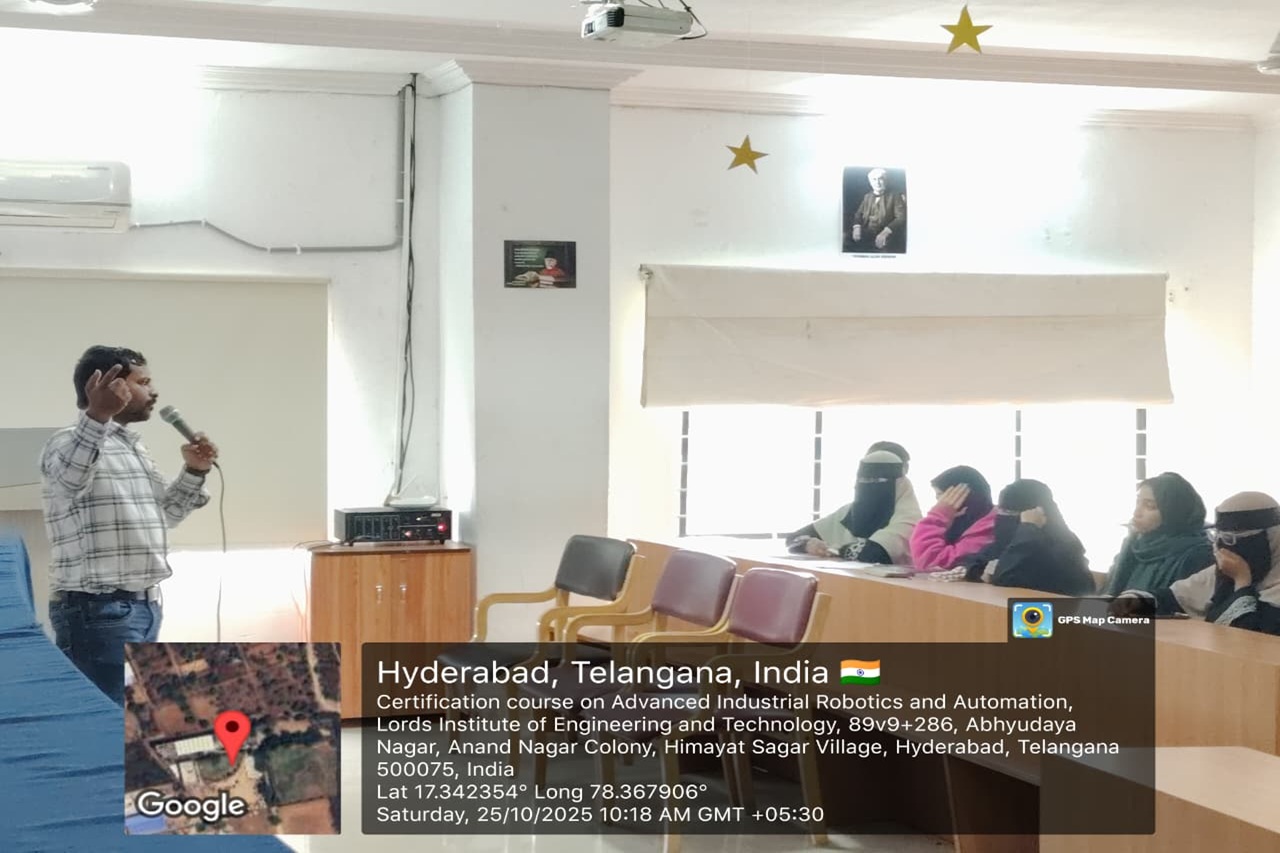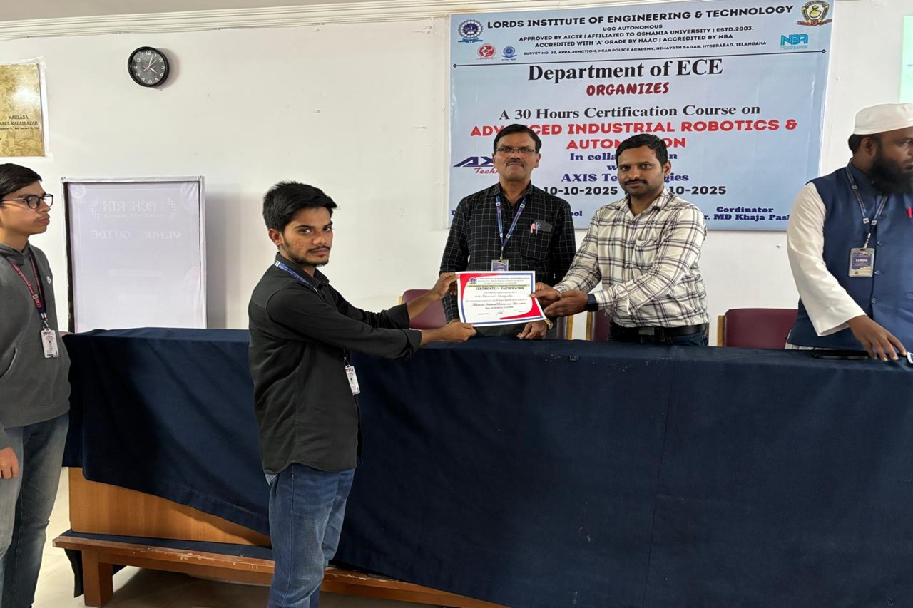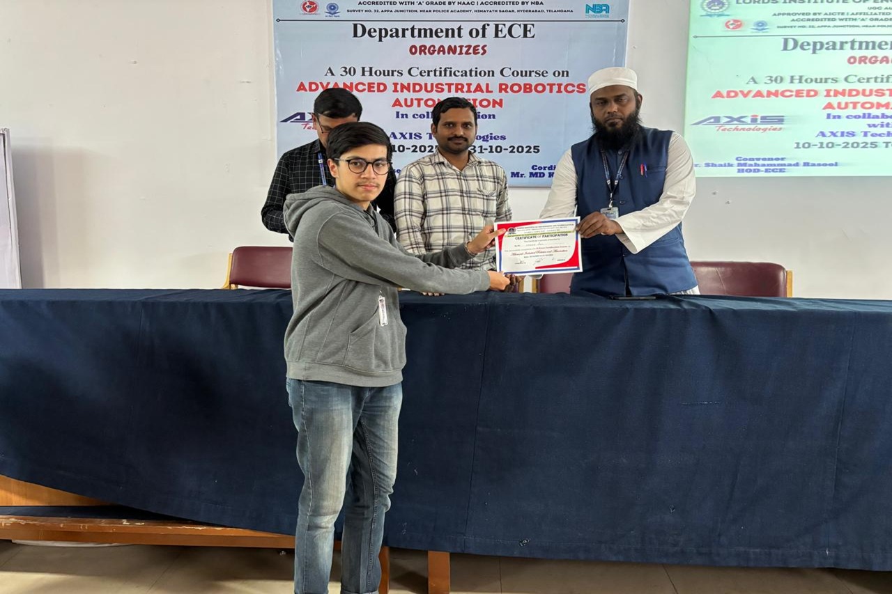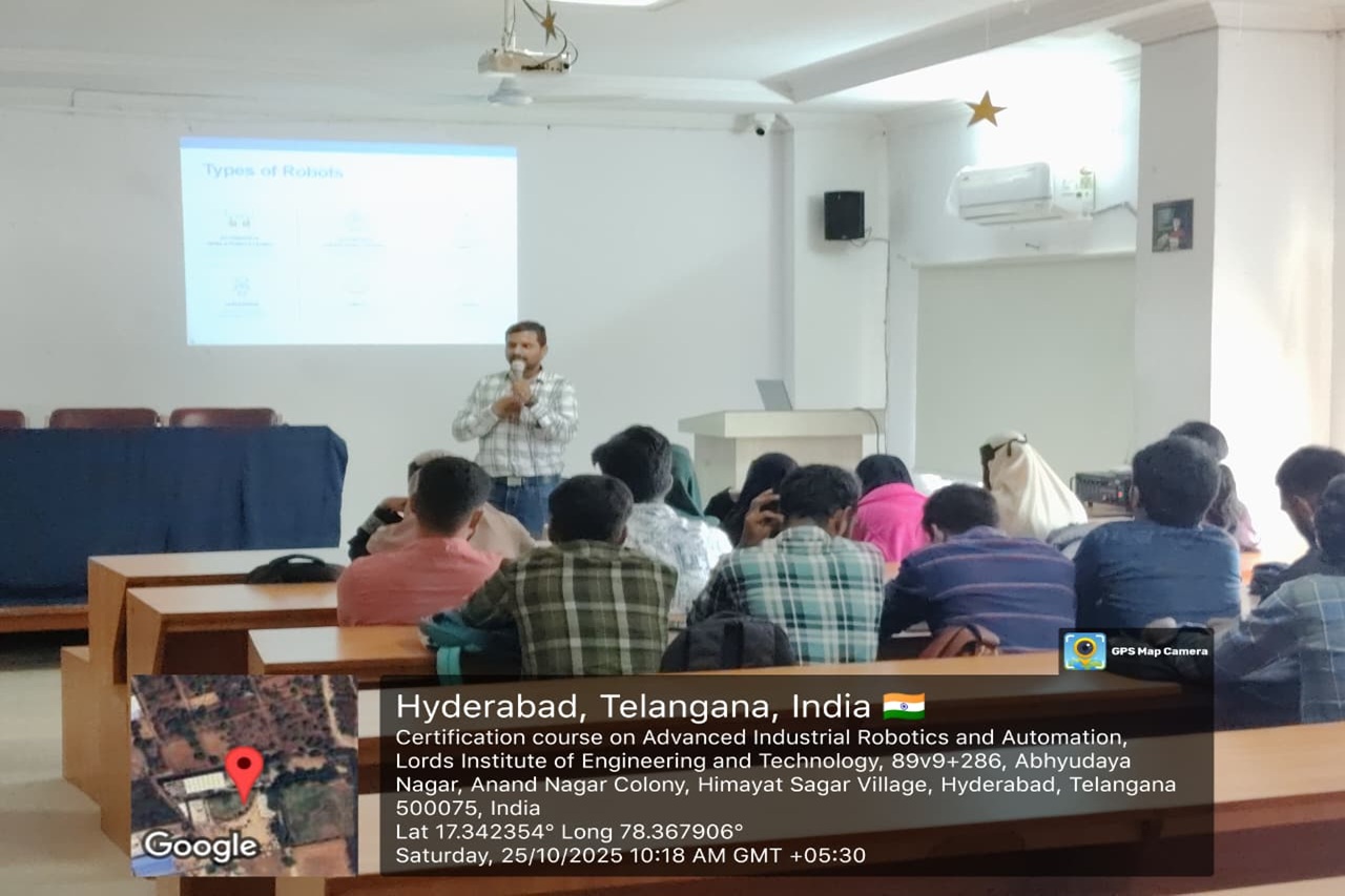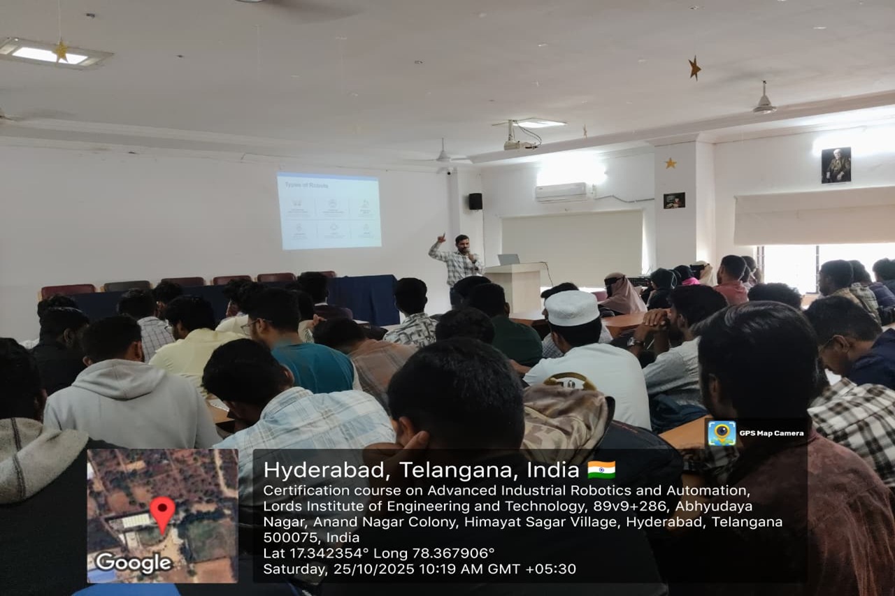 Description: The Department of ECE at Lords Institution of Engineering and Technology (Autonomous) successfully completed A 30-Hours Certificate Course on Advanced Industrial Robotics and Automation in collaboration with Axis Technologies from 10-31October 2025 at Maulana Abul Kalam Azad seminar hall 5th floor main block.The sessions were delivered by