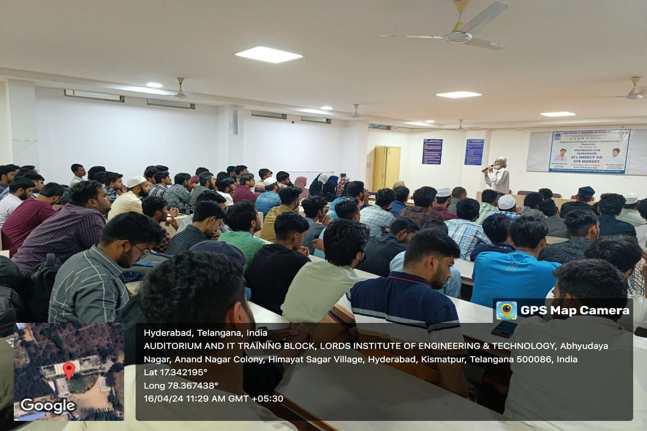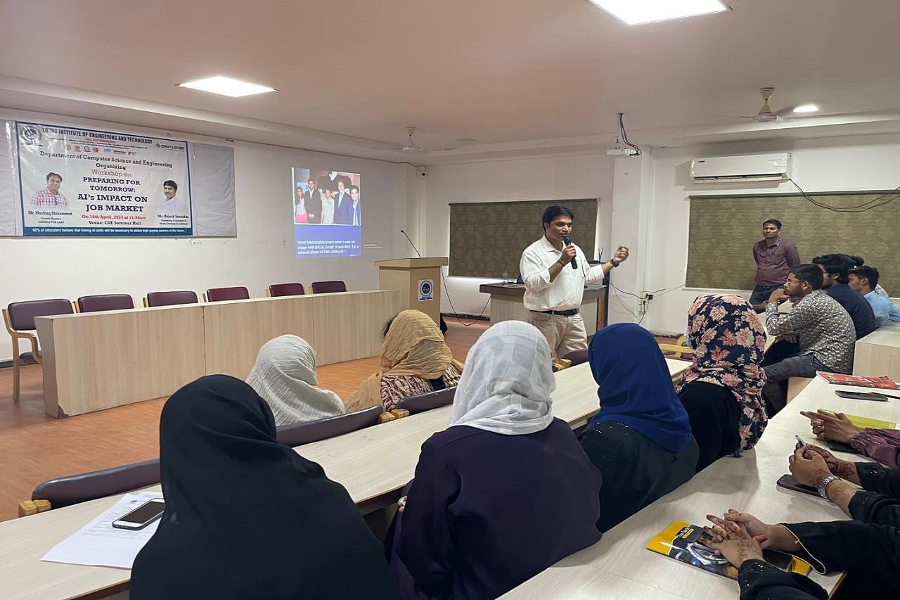 Description about the event (50 Words): Program initiated on 16.04.2024 Dr. Shaik Shavali , Dean HoD , CSE has welcomed the Guest Speakers and all the participants and told the workshop importance of Ai’s Impact for coming Job Market and Guest Speaker Mr. Mustaq Ahmed , Growth Hacker from Cantilever Labs has given valuable input’s on the Preparing for Tomorrow on ” AI’ s Impact on Job Market and has shared his various experiences and the AI’s Impact on the market later Mr Rajesh Savankar, Marketing Consultant from Media Strategy Consultant has shared his experiences on Innovation, Incubation and invited for T-Hub to know briefly about the startups and shown his practical activities which he has involved through presentation.