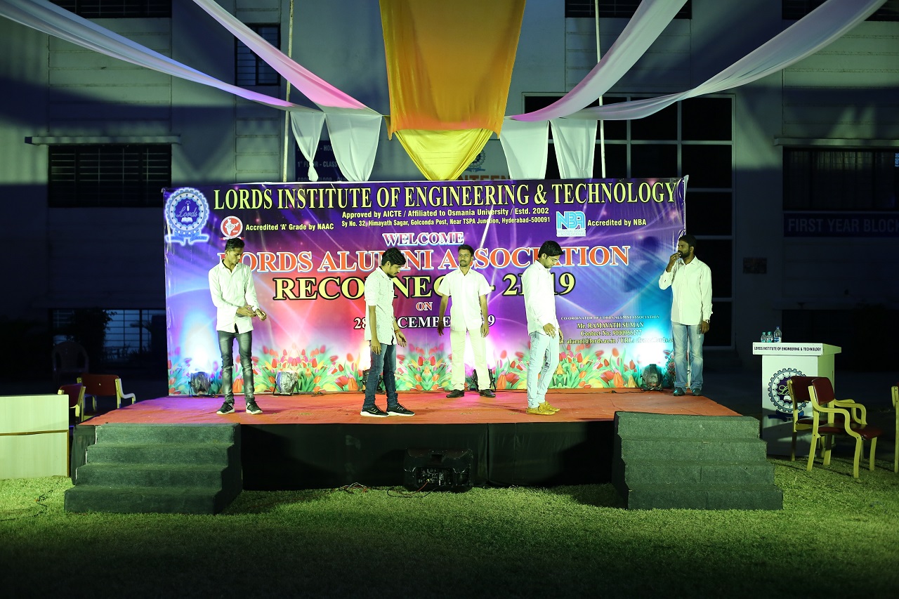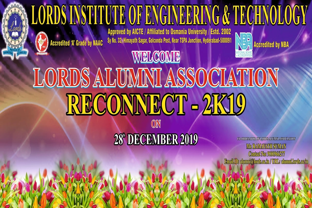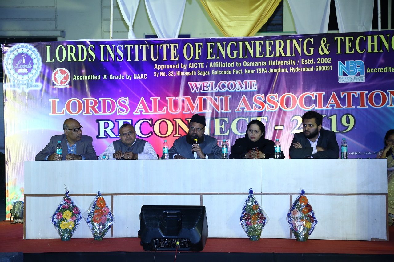 Events Alumni Association Reconnect-2K19 admin December 29, 2019 Title of event : Lords Alumni Association Reconnect-2K19 Chief Guest : Mr. Basha Mohiuddin, Chairman, LIET Department / Cell: Alumni Cell Date: 28/12/2019 ← One Day Workshop-MBA A Guest lecture on Kinematics of Machines →