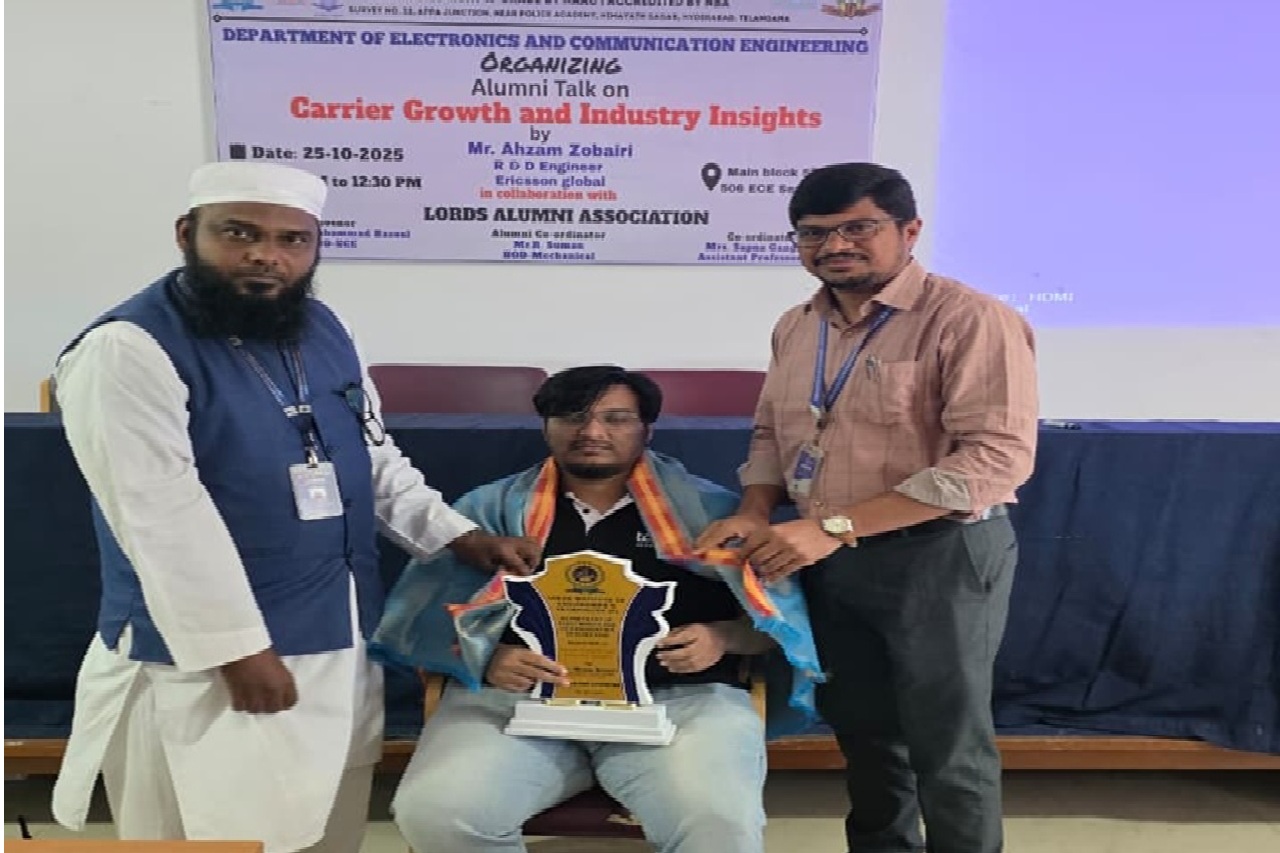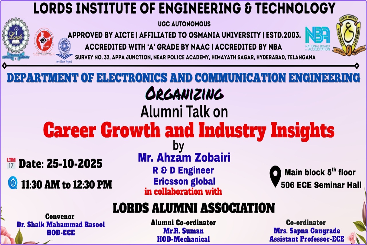 Description: The Department of Electronics and Communication Engineering at LIET organizing the Alumni Talk in collaboration with Lords Alumni Association on Career Growth and Industry Insights by Mr. Ahzam Zobairi,R&D Engineer, Ericsson Global , Hyderabad on 25th October 2025 from 11;30 am to 12:30 pm with 105 students participating offers a great opportunity to explore real world exposure for career growth and industry insights in Electronics and Communication field.