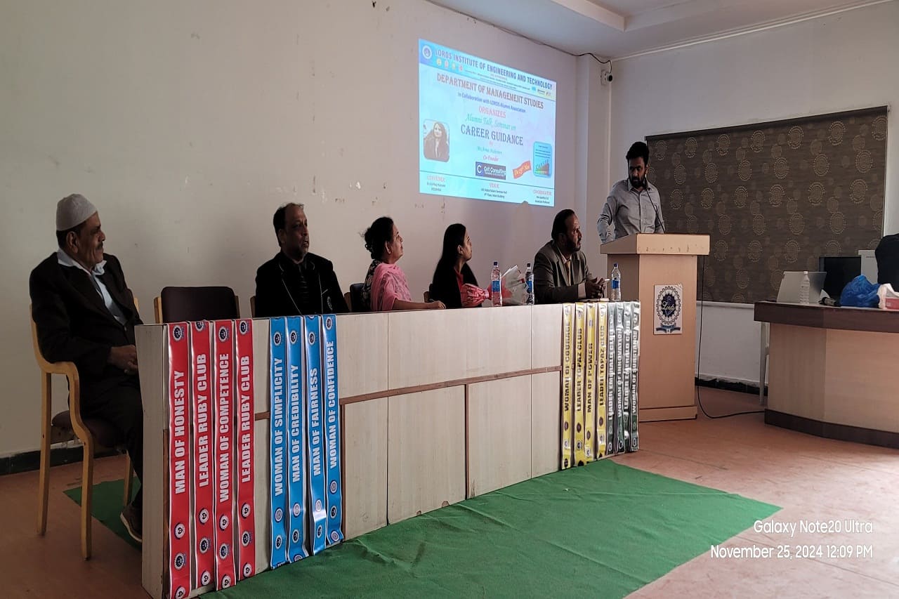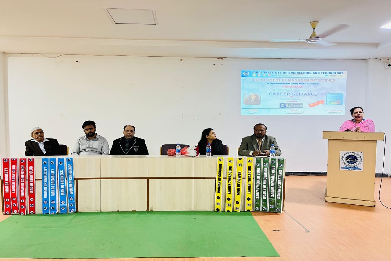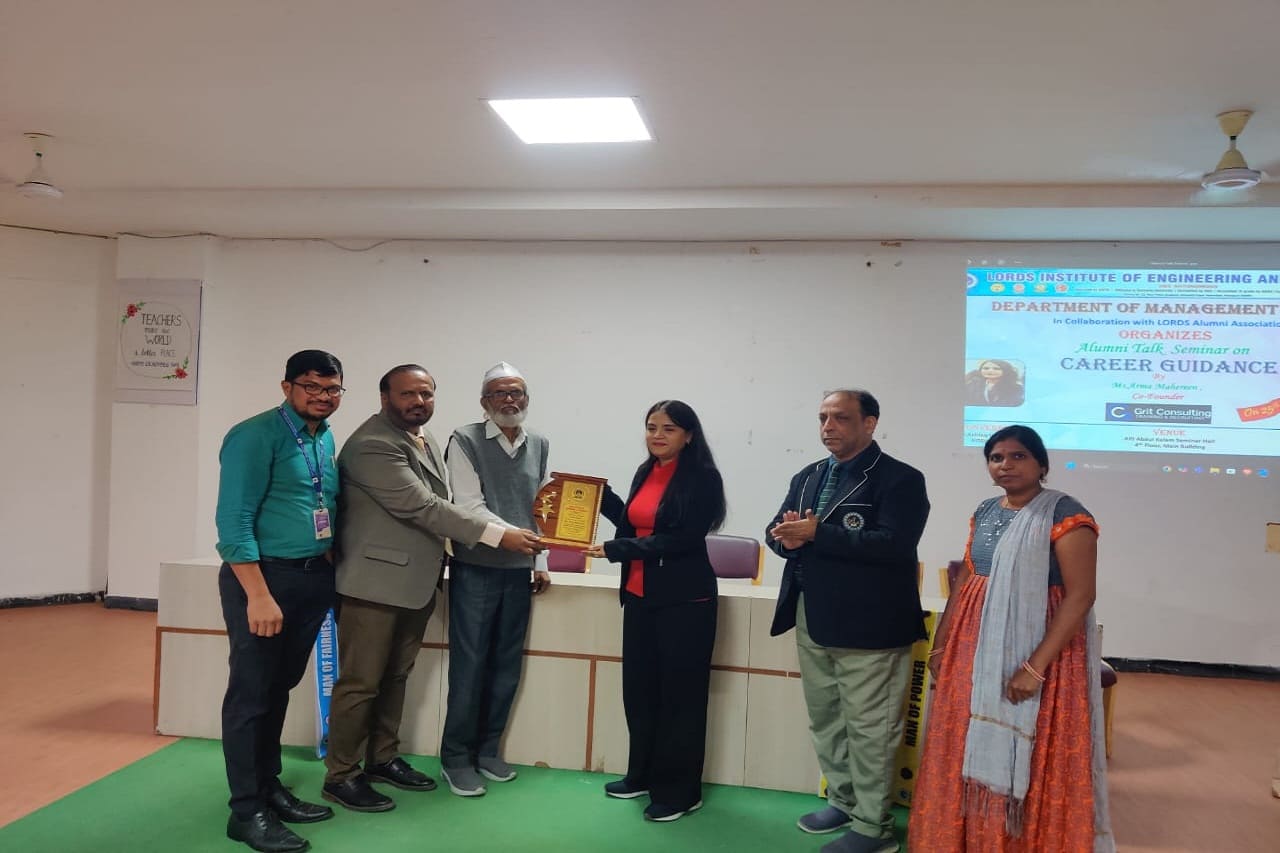 Description about the event: The Department of Management Studies, in collaboration with LORDS Alumni Association, organized an Alumni Talk on Career Guidance on 25th November 2024 at the A.P.J. Abdul Kalam Seminar Hall. The Guest of Honour was Mr. Syed Hameed Sir, Ex-Principal of Indian Embassy School-Jubail, and the speaker was Ms. Arma Mahereen, MBA 2021 batch alumna and Co-Founder of GRIT Consulting, Training and Recruiting. The session inspired 100 students, offering invaluable advice on career paths, networking, continuous learning, and adaptability.