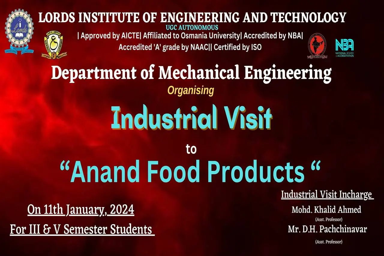 Department of Mechanical Engineering at Lords Institute of Engineering and Technology (A) conducted an Industrial Visit to Anand Food Products Pvt. Ltd(Parle G Biscuits Manufacturing Unit) on 11-01-2024. The event witnessed the participation of 60 students from B.E II and III Year, along with the presence of 5 facultyย members.