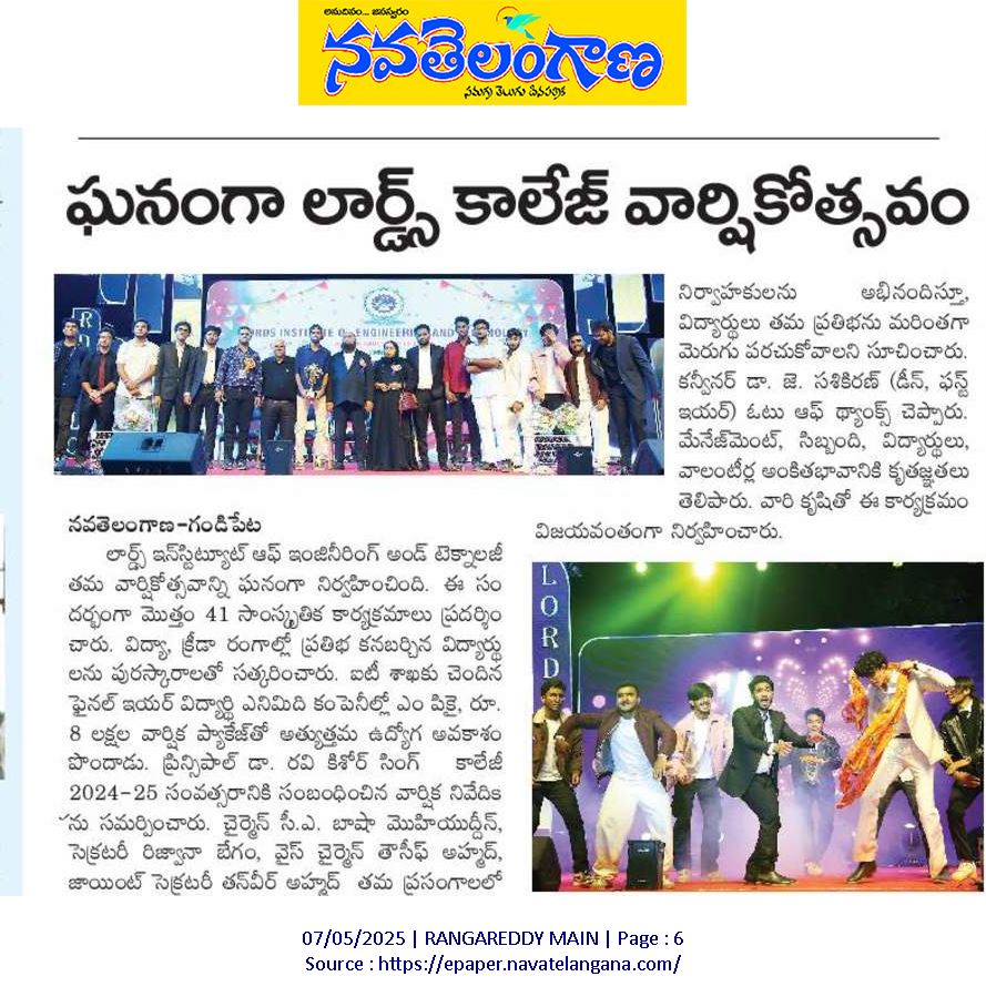 Description: Lords Institute of Engineering and Technology (Autonomous) celebrated its 23rd Annual Day with grandeur and enthusiasm on Saturday, 3rd May 2025, at the Lords Cricket Ground. The campus was elegantly adorned with festive lights, symbolizing the pride and accomplishments of the academic year. Commencing at 5:00 PM, the event witnessed the active participation of over 900 attendees and showcased a colorful array of cultural performances, including dance, singing, mime, shayari, skits, and stand-up comedy. Motivational messages delivered by esteemed dignitaries inspired students to strive for excellence and aim higher in their pursuits. The Management, Principal, faculty, and students came together to celebrate the occasionβs resounding success, which concluded on a joyful and memorable note.