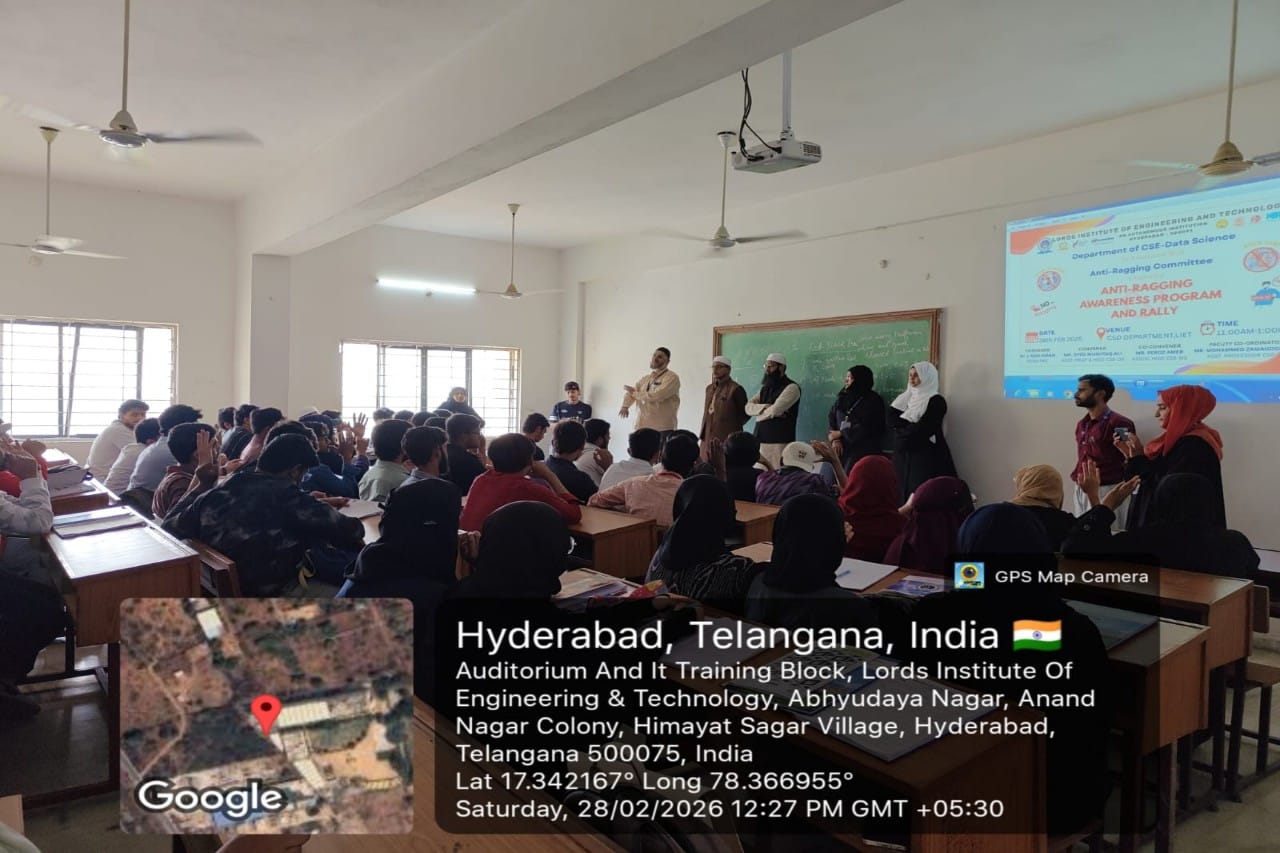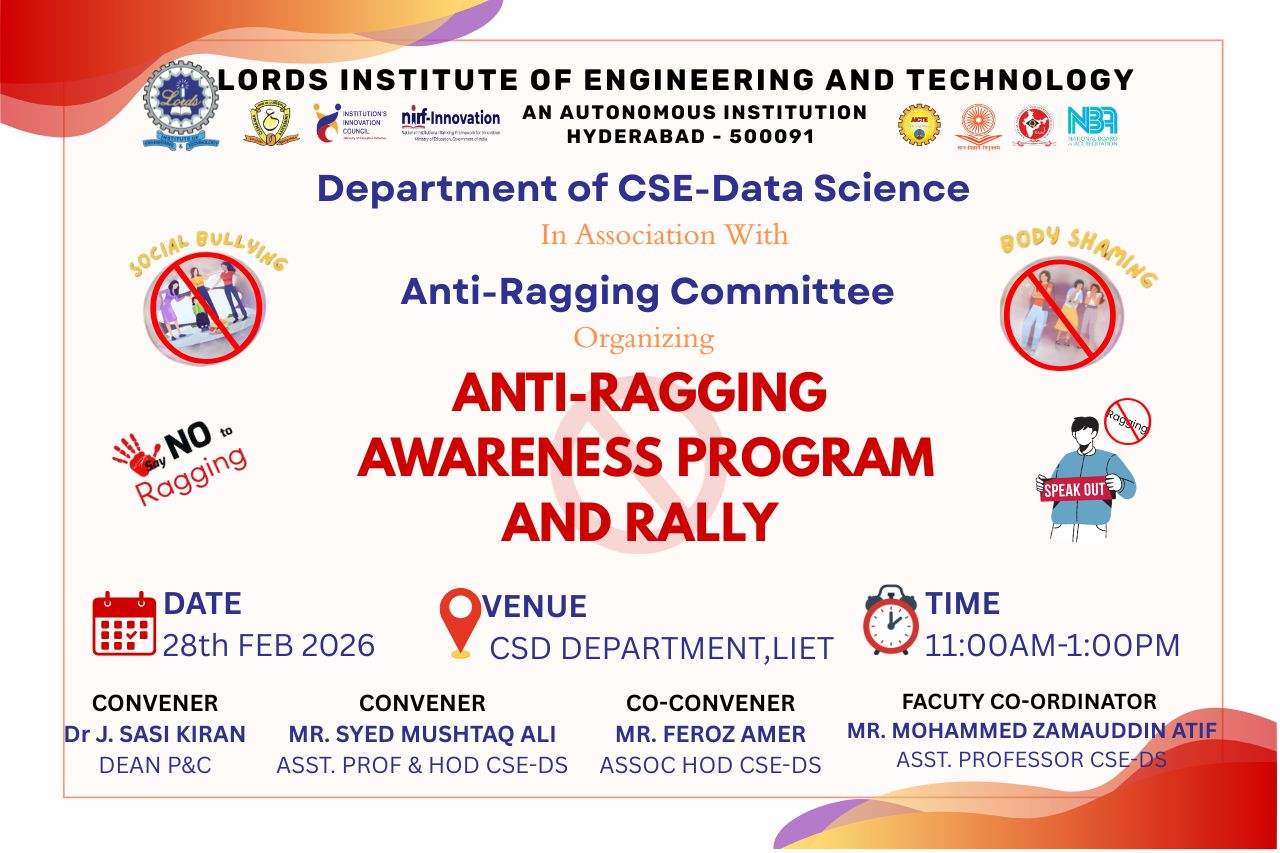 Description: The Department of CSE – Data Science, in association with the Anti-Ragging Committee, organized an Anti-Ragging Awareness Program and Rally for students on 28th February 2026 at the CSD Department, LIET. The program aims to create awareness about the adverse effects of ragging, social bullying, and body shaming, and to promote a safe, respectful, and inclusive campus environment. The session focused on educating students about institutional policies, legal consequences of ragging, and the importance of mutual respect and empathy. The rally further reinforces the message of “Say No to Ragging” and encourages students to speak up against any form of harassment, thereby fostering a positive academic atmosphere.
