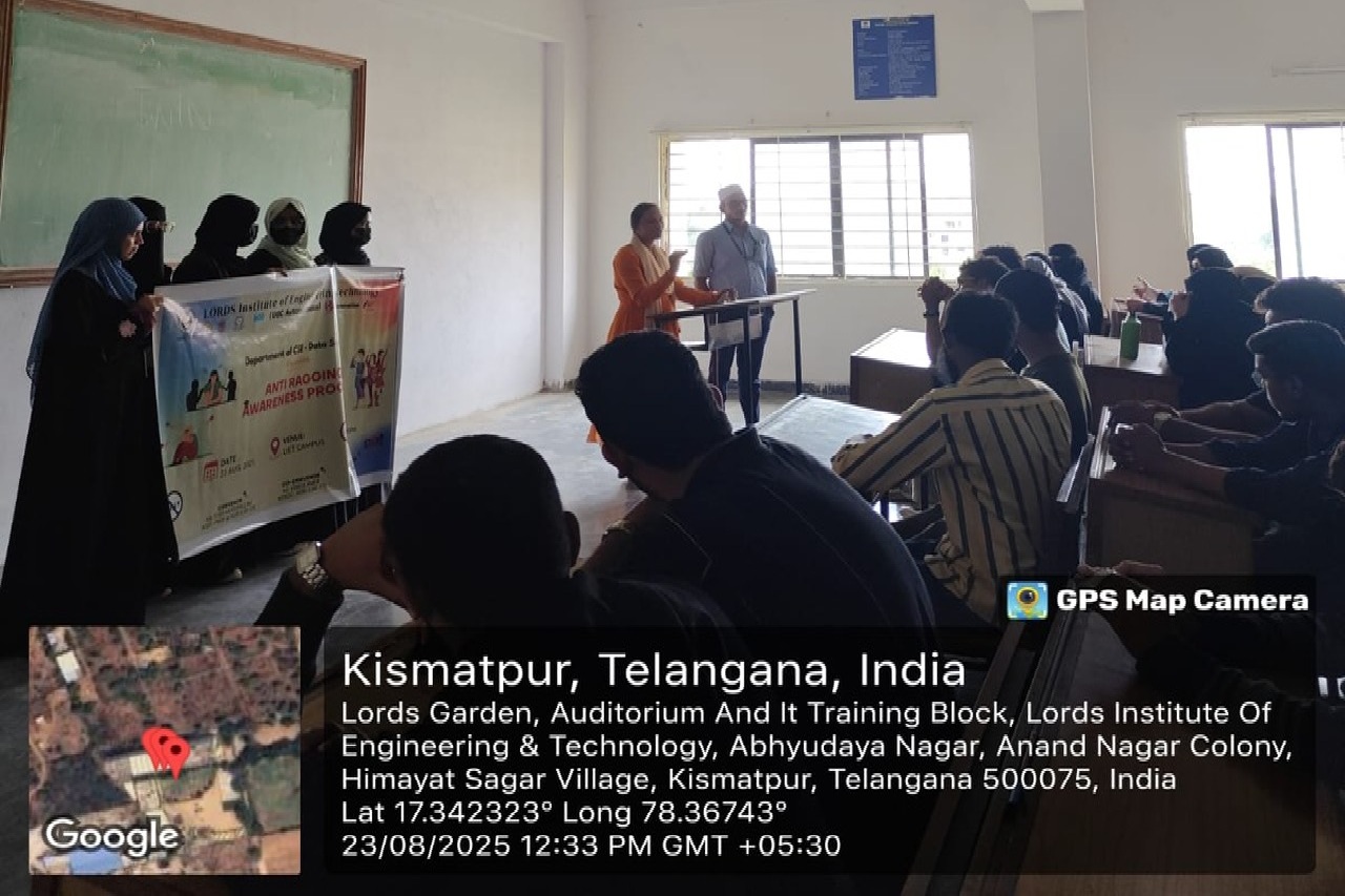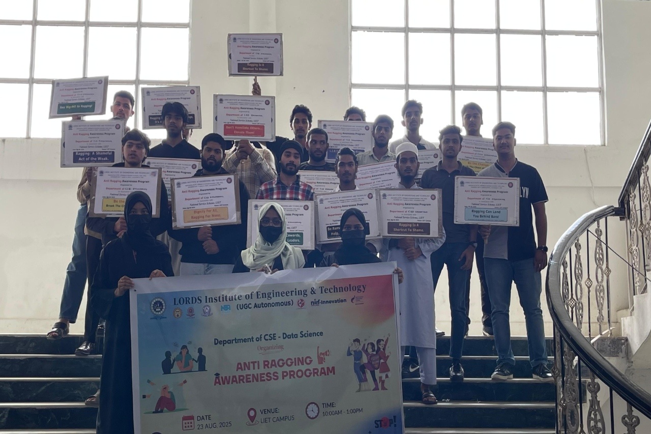 Description: Department of CSE-Data Science in association with NSS, LIET has organized an Anti -Ragging Awareness Program on 23/08/2025 to make students aware about the adverse scenarios of Ragging. Student Coordinators & Volunteers along with the faculty Coordinator have engaged themselves in creating awareness among the II,III & IV Year students of LIET.