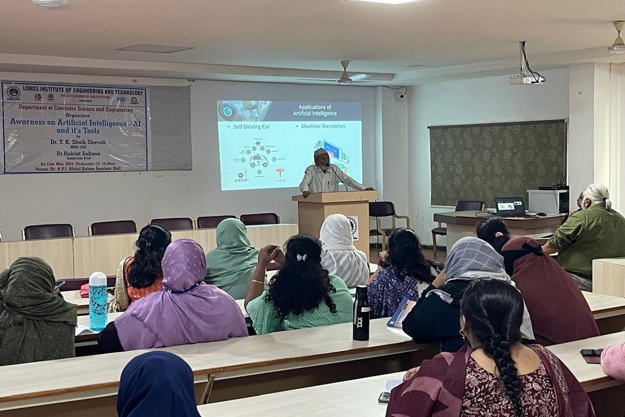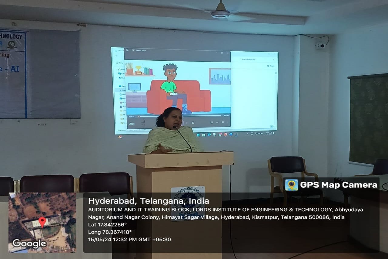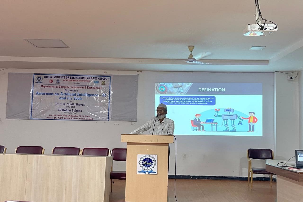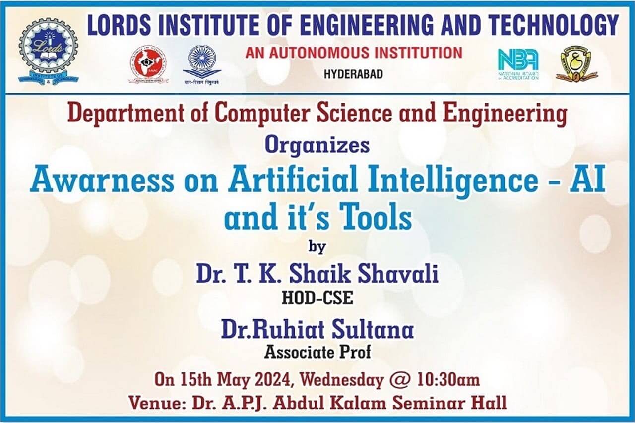 Description: The Department of CSE at Lords Institute of Engineering and Technology (A), organized a day seminar titled “Awareness of Artificial Intelligence-AI and its Tools” on May 15, 2024. The seminar aimed to bring awareness of AI tools to faculty members, and to utilize those tools as teaching aids to present their lectures interactively and innovatively. The session successfully equipped 35 participating students.