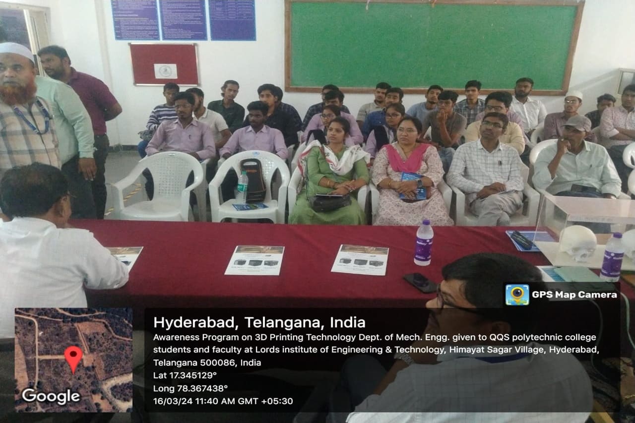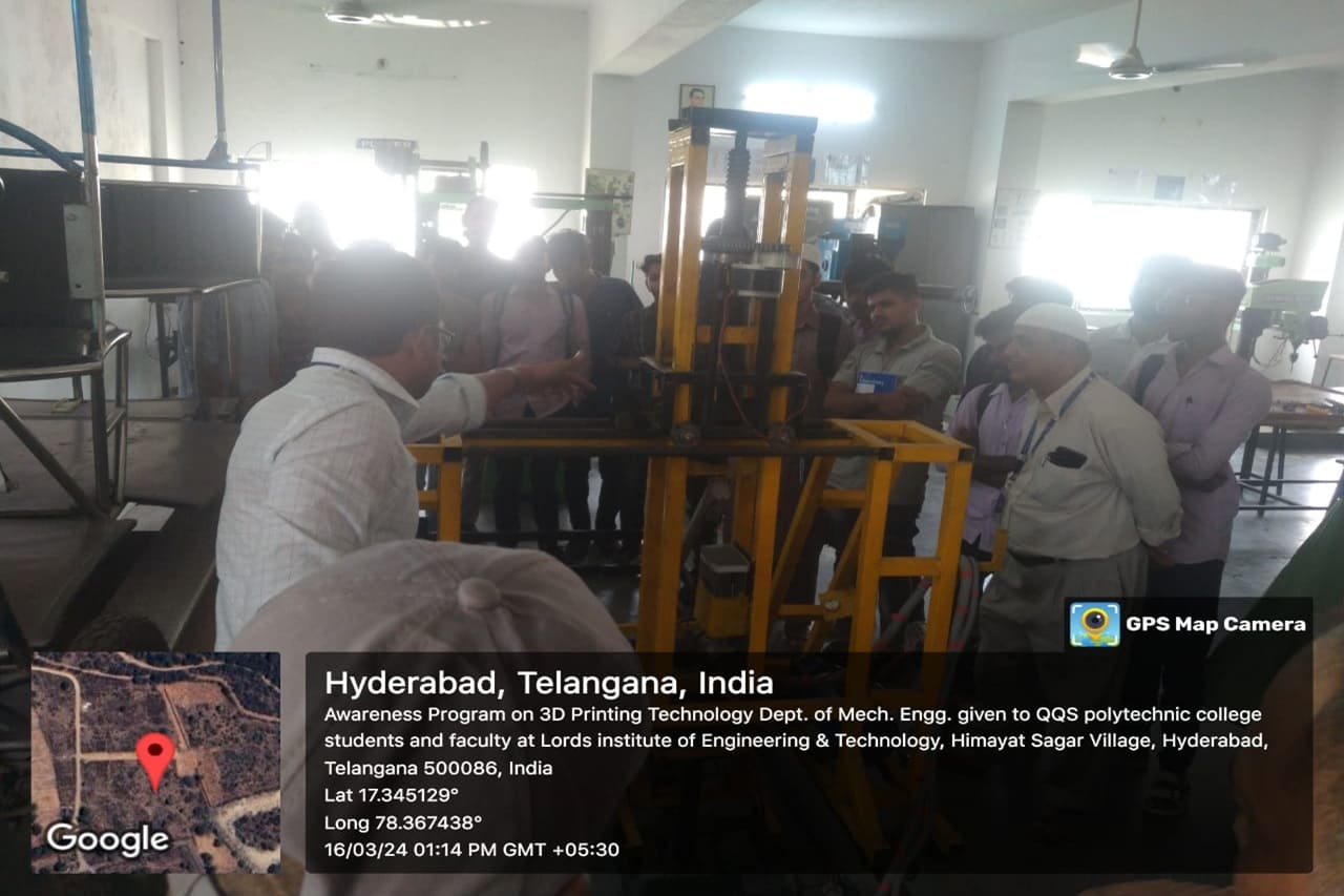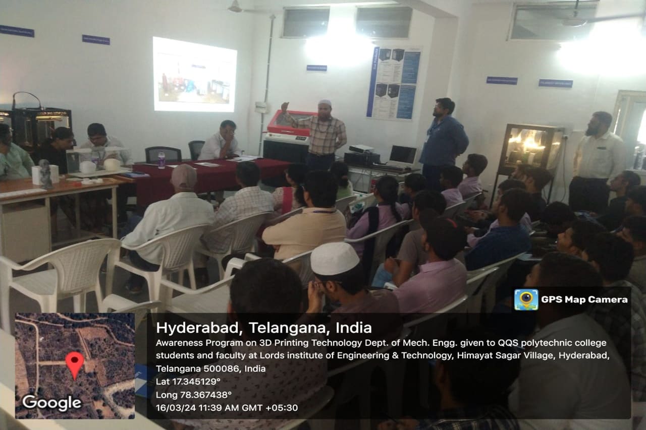 Description: Mechanical Engineering department of Lords Institute of Engineering and Technology(A) hosted an “Awareness Program on 3D Printing Technology” at campus on March 16, 2024 for third-year students of Quli Qutub Shah Polytechnic College, Hyderabad. Twenty-two students attended the program, gaining both knowledge and real-time exposure to 3D printing technology.