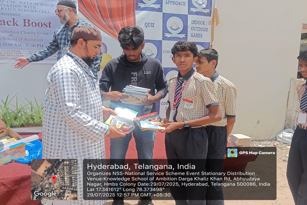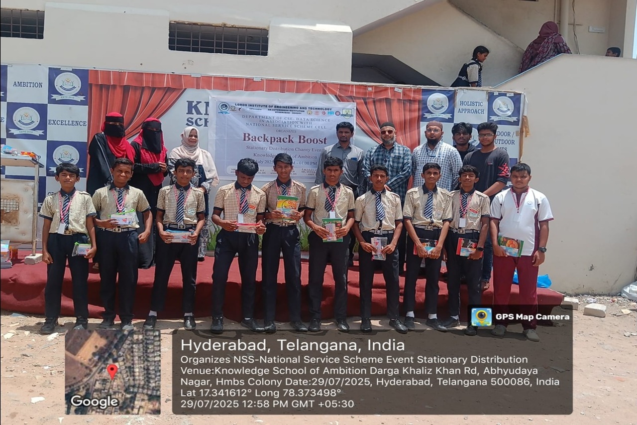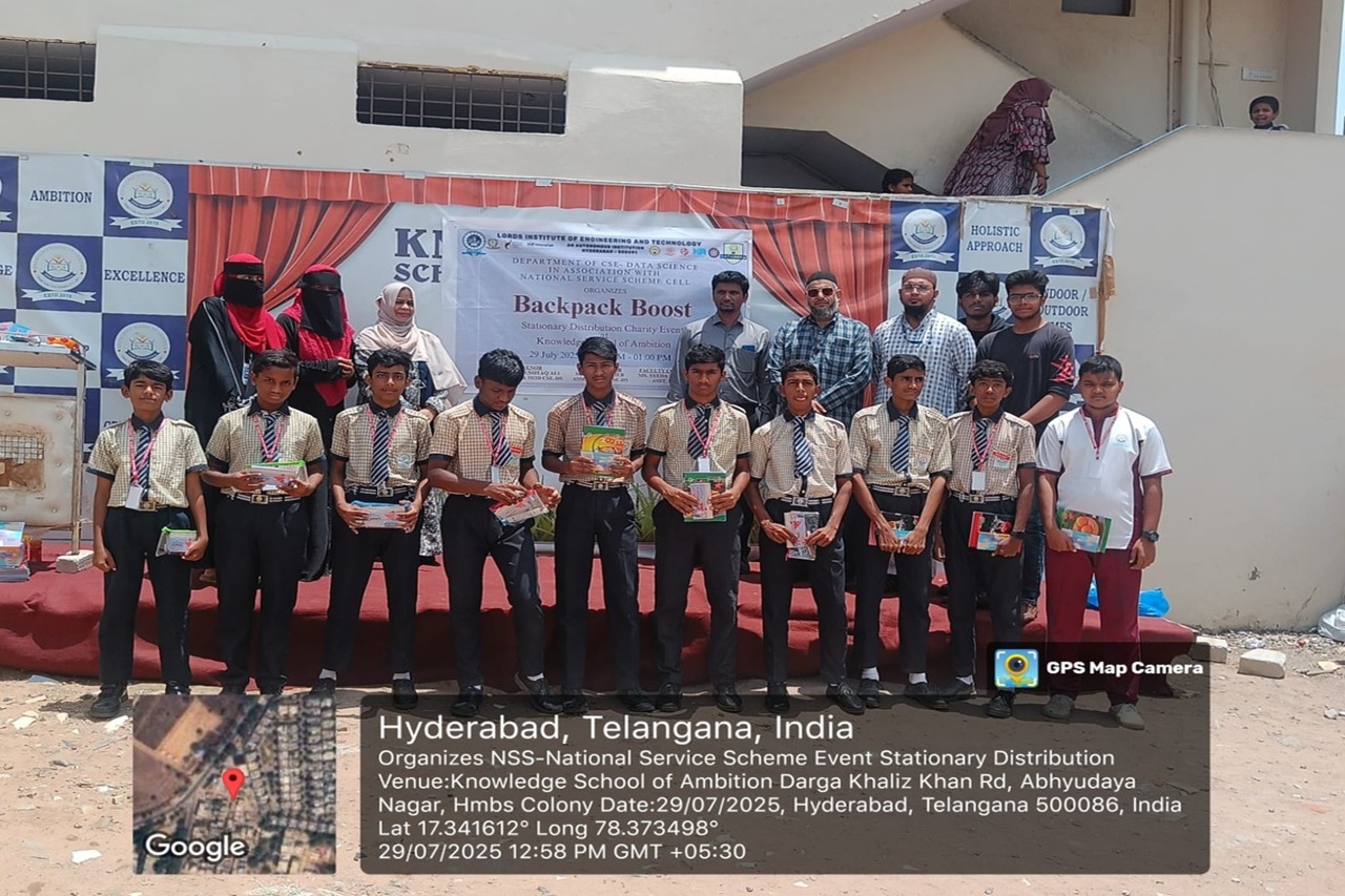 Description: The Backpack Boost event is a stationery distribution drive organized by the Department of CSE – Data Science at Lords Institute of Engineering and Technology, in association with the National Service Scheme (NSS) Cell. It will be held at the Knowledge School of Ambition on 29th July 2025, from 10:00 AM to 01:00 PM. The initiative aims to support students by providing essential educational supplies and fostering learning through community outreach.