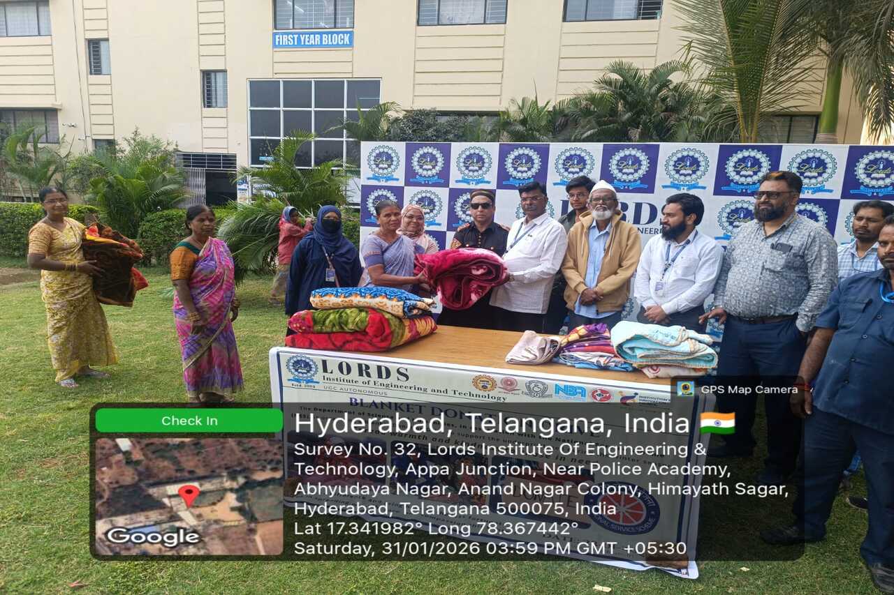 Description: The Department of Science and Humanities, in association with the National Service Scheme (NSS), successfully organized a Blanket Distribution Programme on 31st January 2026 at the Lords Institute of Engineering and Technology campus. Nearly 30 blankets were distributed to underprivileged individuals to provide relief during the winter season. The event was carried out with the active involvement of NSS volunteers and faculty members, ensuring smooth coordination and effective execution. This humanitarian initiative highlighted the institution’s commitment to social responsibility and community welfare. The programme created a positive impact and brought comfort and warmth to the beneficiaries.