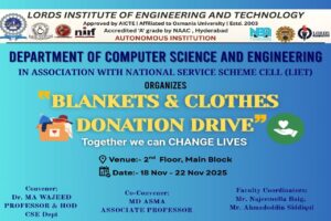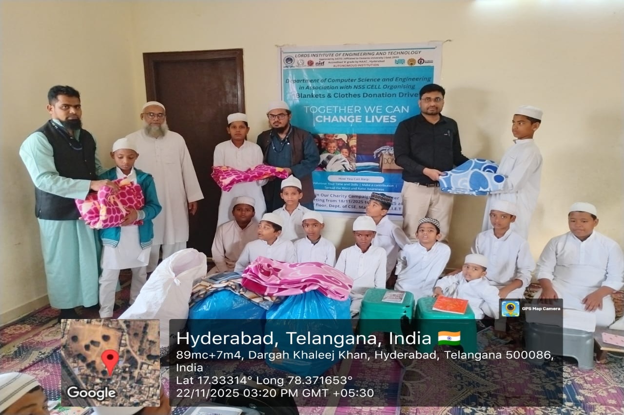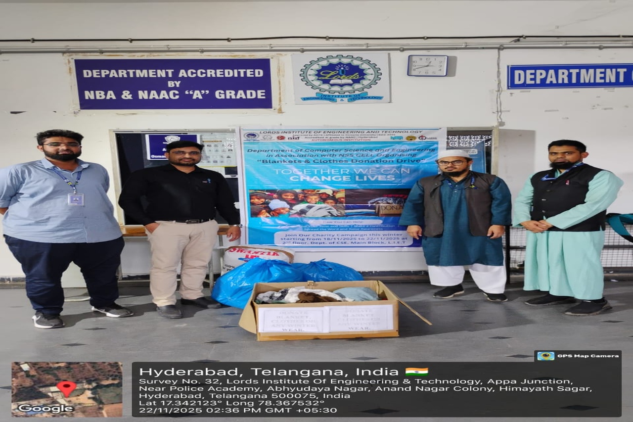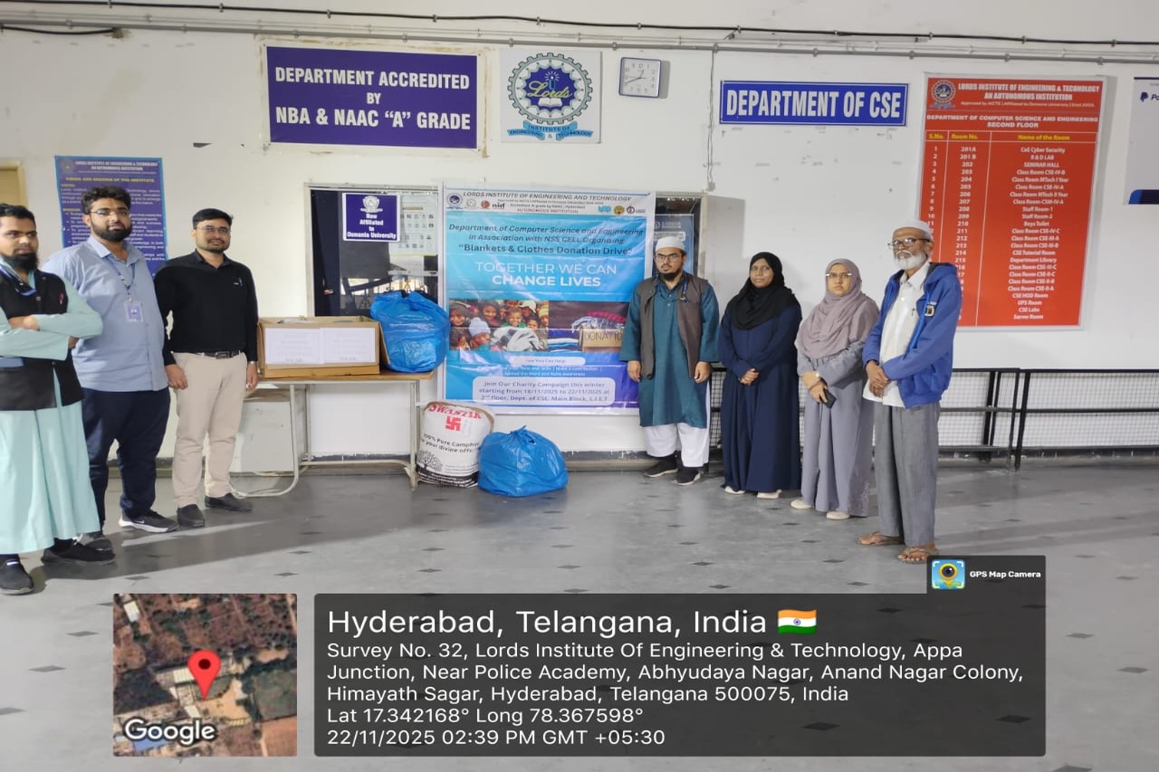 Description: The Department of Computer Science and Engineering at LIET organized a Blankets & Clothes Donation Drive from 18th November to 22nd November 2025. The drive was conducted at the 2nd Floor, Dept. of CSE, Main Building, with collection timings from 12:30 pm to 1:30 pm and 3:30 pm to 4:30 pm each day.This initiative aimed to support underprivileged individuals and families in need, especially with the winter season approaching. Students, faculty, and staff members actively participated by contributing warm clothing, blankets, and other essential wearables. The event encouraged a spirit of compassion and social responsibility within the campus community.