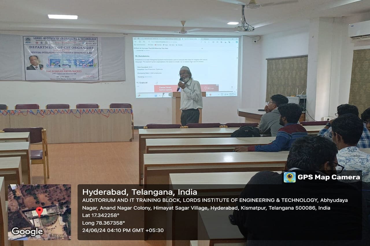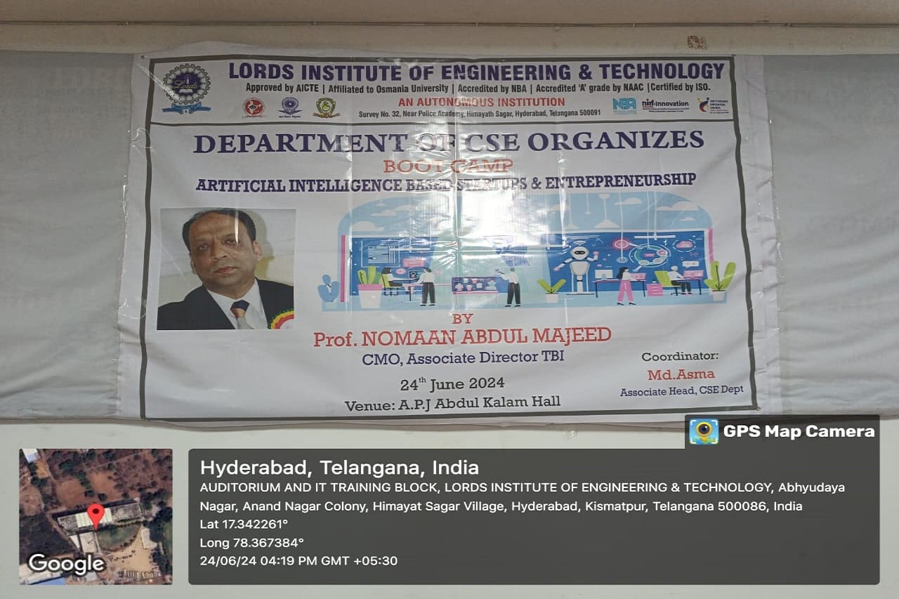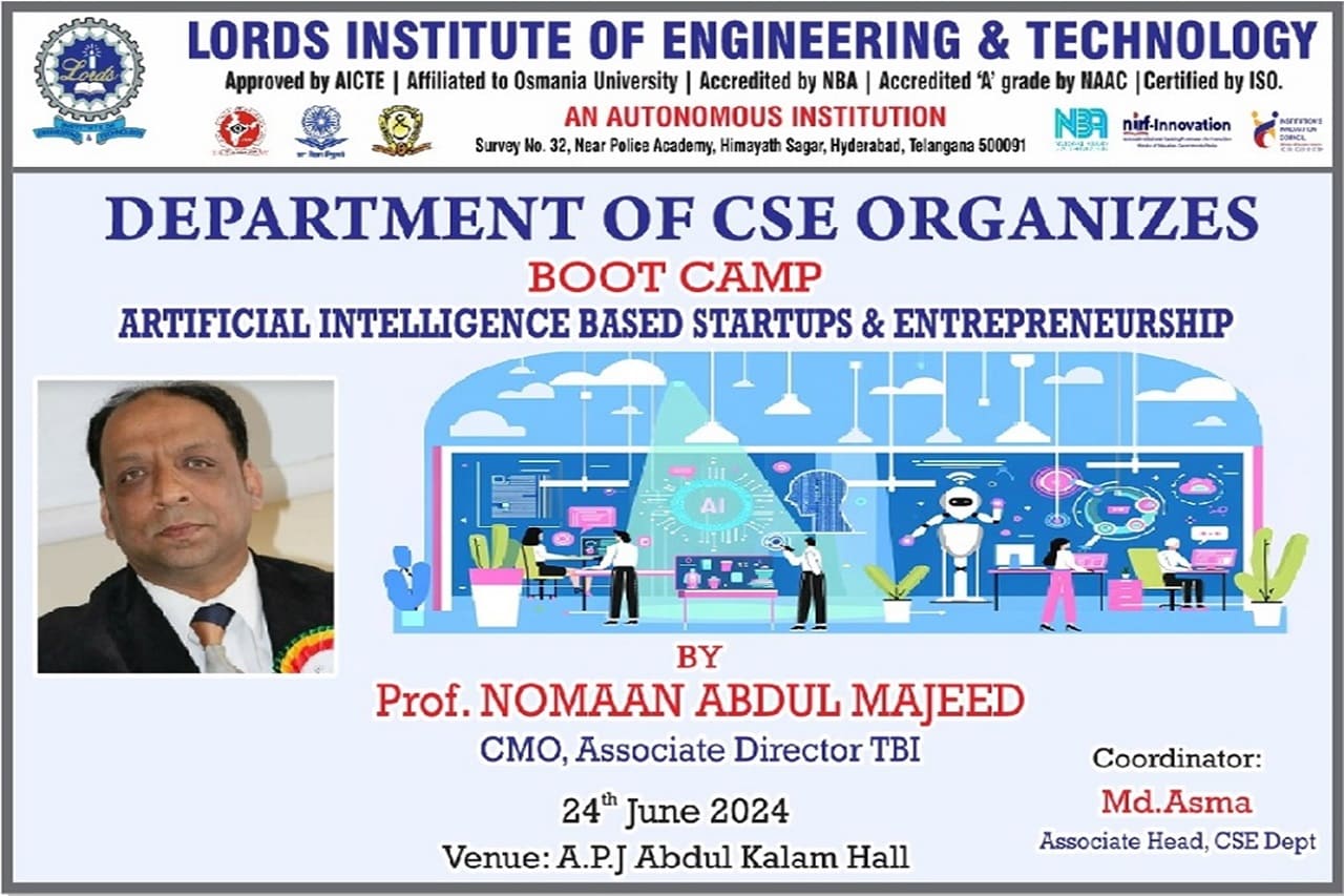 Description about the Event:(50 Words): Department of the CSE has conducted a one day Boot Camp on Artificial Intelligence based startups & Entrepreneurship was conducted on 24-06-2024 at A.P.J Abdul Kalam Seminar Hall, II floor, Dr. Ravi Kishore Singh, Principal LIET, Dr T. k. Shavali Hod- CSE graced the event. Associate Hod -CSE has welcomed all the participants and the guest faculty.
