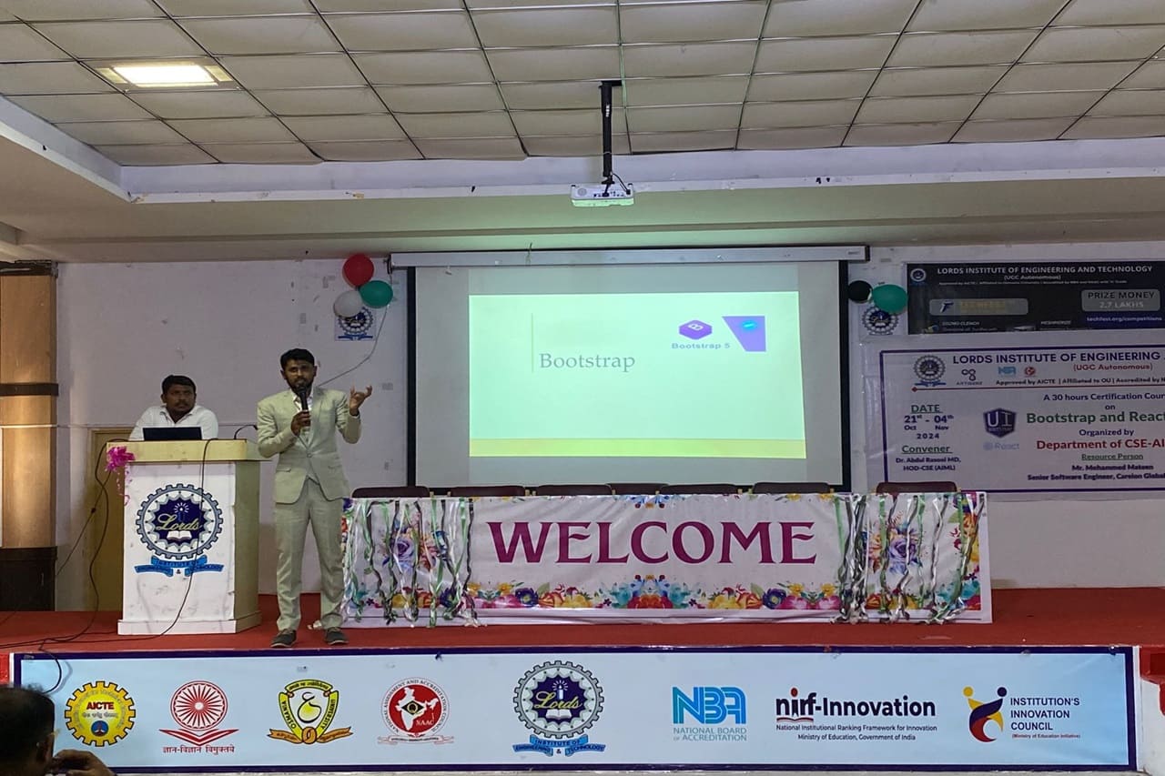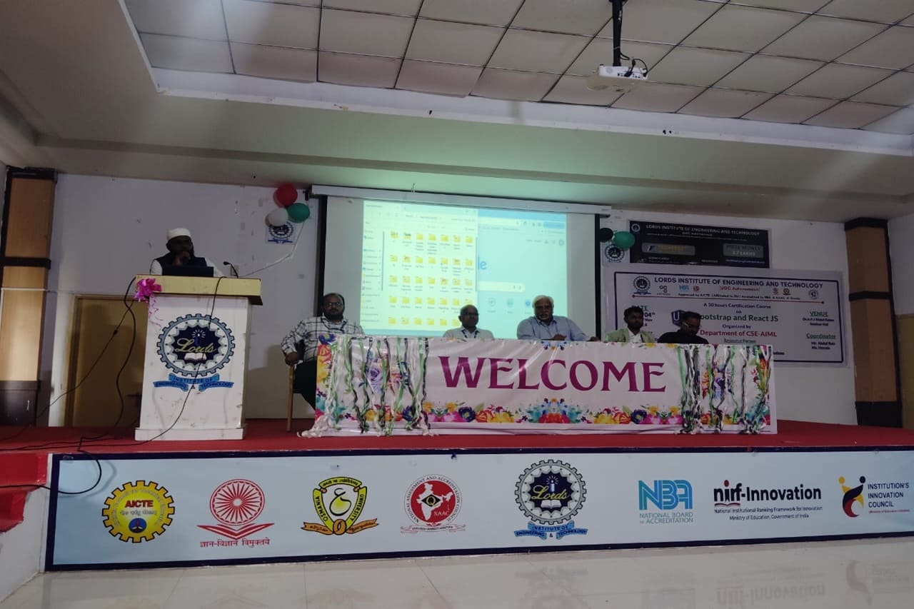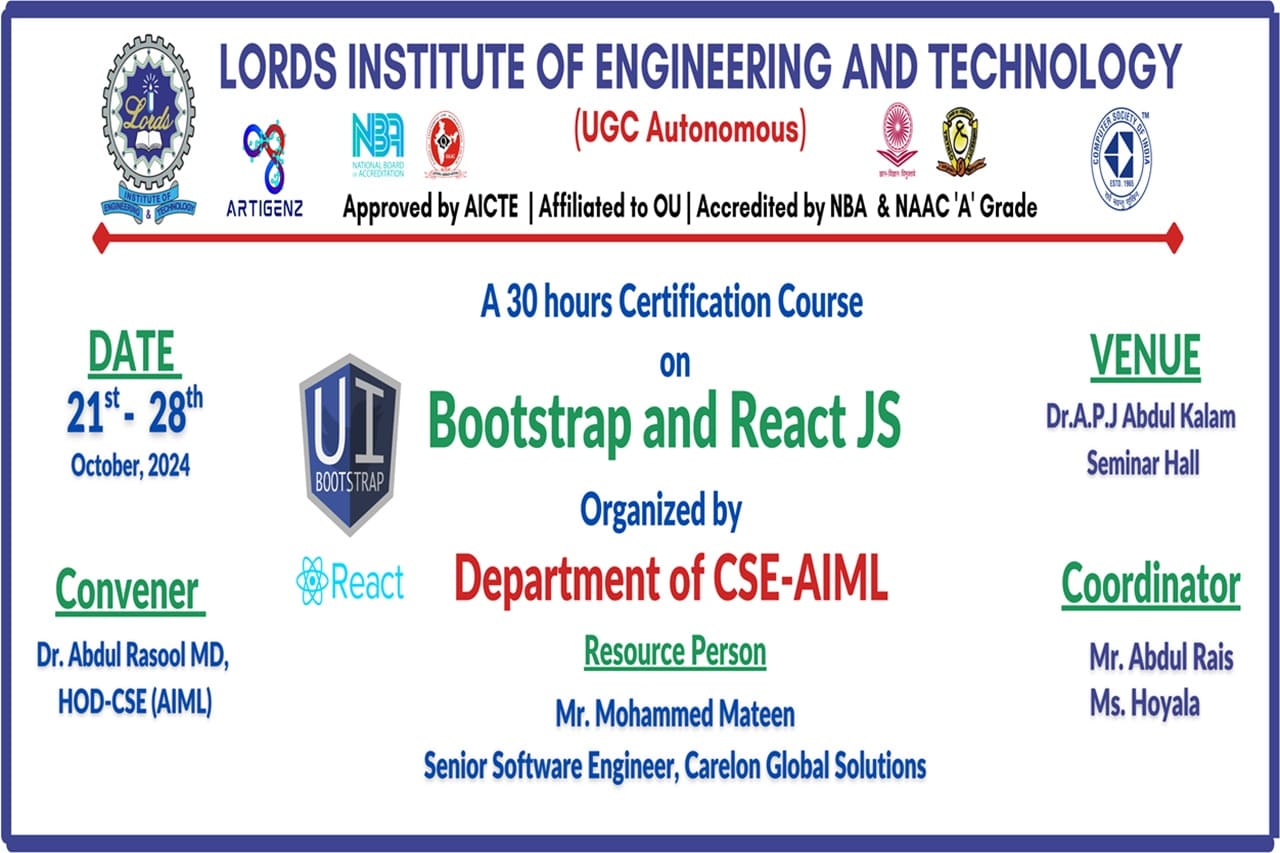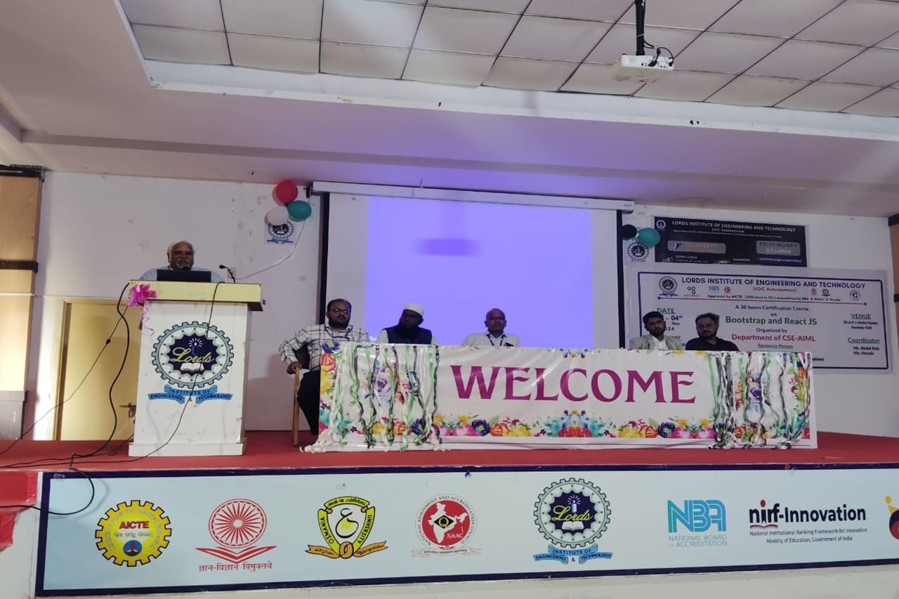 Description: The Department of CSE-AIML at Lords Institute of Engineering and Technology (A) organized a 30-hour certification course on Bootstrap and React JS, held from 21st October 2024 to 4th November, 2024. The course was conducted by Mr. Mohammed Mateen, Senior Software Engineer at Carelon Global Solutions. Aimed at 3rd-year students, this course provided hands-on experience and essential knowledge for building responsive and dynamic web applications using modern technologies. The event saw the participation of 60 students.