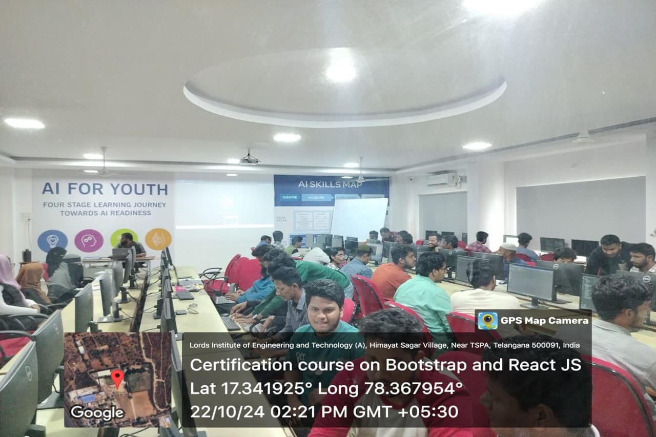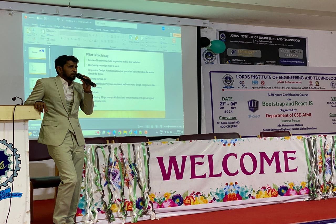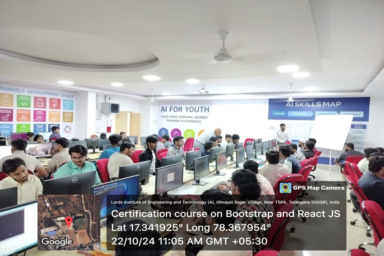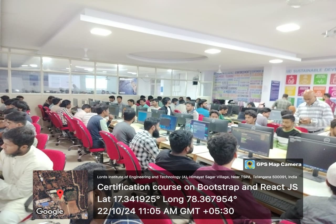 Description: The Department of CSE-AIML at Lords Institute of Engineering and Technology (A) organized a 30-hour certification course on Bootstrap and React JS, held from 21st October 2024 to 4th November, 2024. The course was conducted by Mr. Mohammed Mateen, Senior Software Engineer at Carelon Global Solutions. Aimed at 3rd-year students, this course provided hands-on experience and essential knowledge for building responsive and dynamic web applications using modern technologies. The event saw the participation of 60 students.