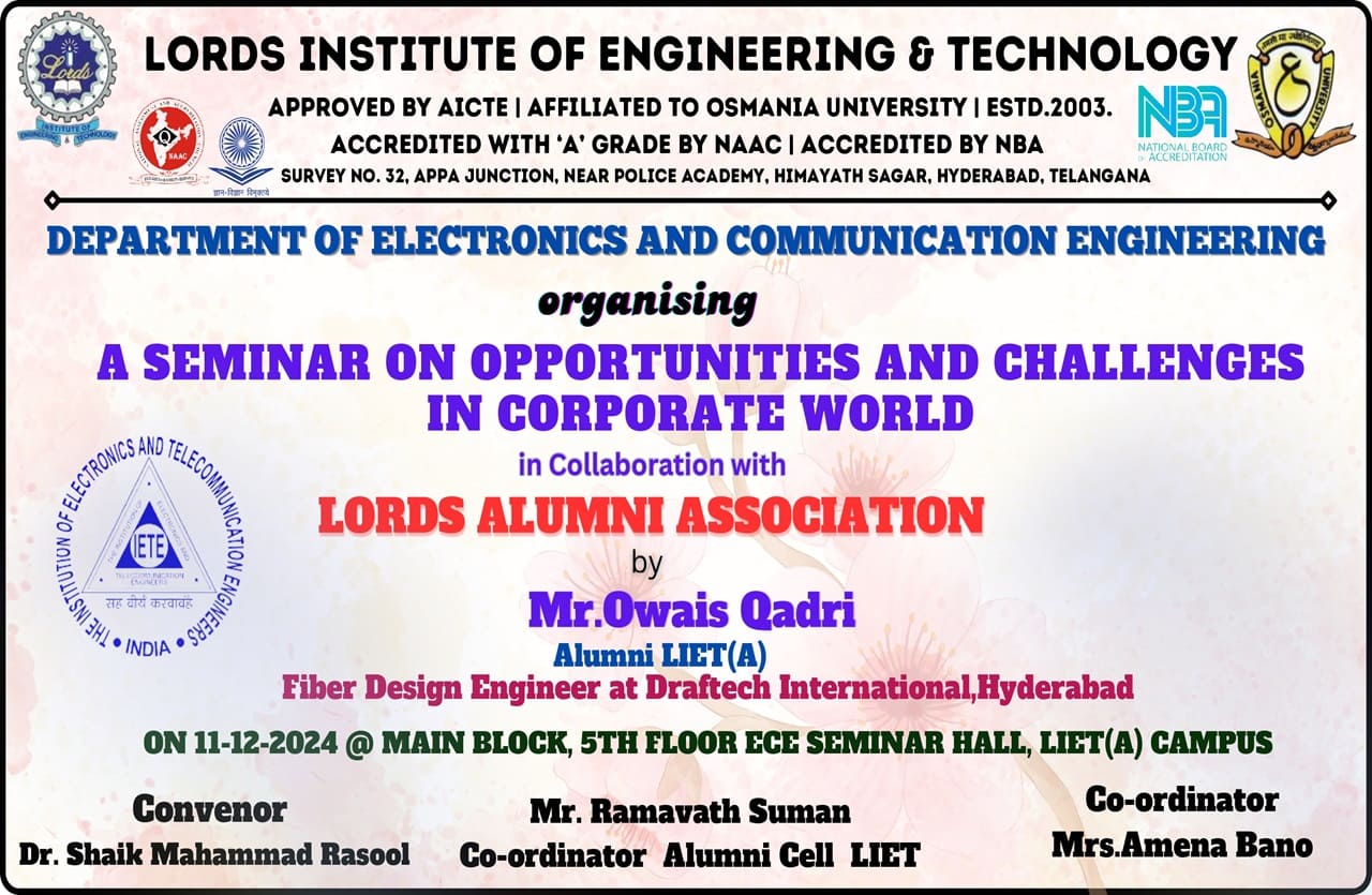 Description: Department of Electronics and communication engineering, LIET (A) organised a seminar on ” Opportunities and challenges in Corporate world” on 11 December2024 by MR OWAIS QUADRI Alumni LIET(A) Fiber Design Engineer at Draftech International, Hyderabad. The corporate world presents a dynamic landscape of opportunities and challenges.The event has active participation of 30 students.The speaker convinced students to focus on corporate world and students were benefited for campus and placement.Sir also told the student that the corporate world also poses significant challenges, including intense competition, adaptability to rapid change, and maintaining a healthy work-life balance.