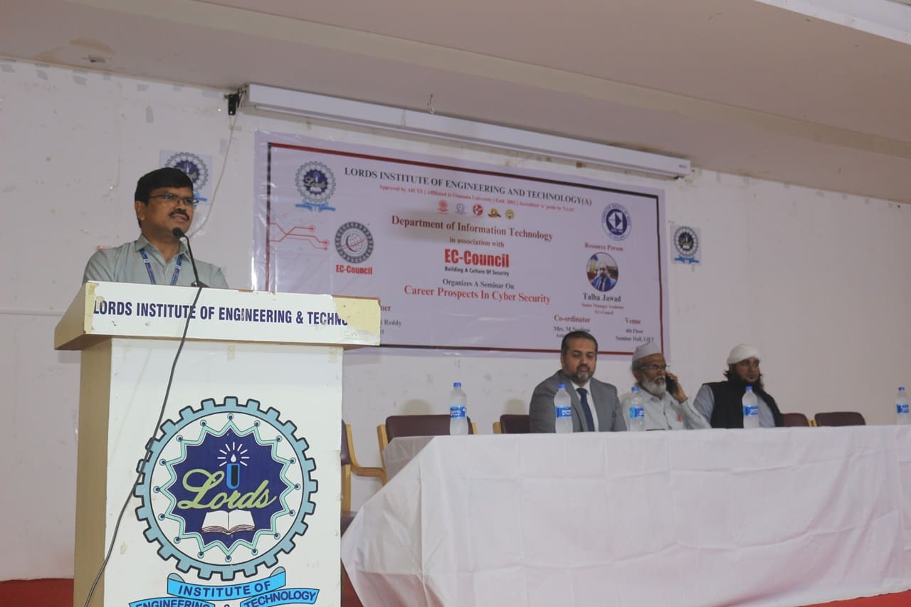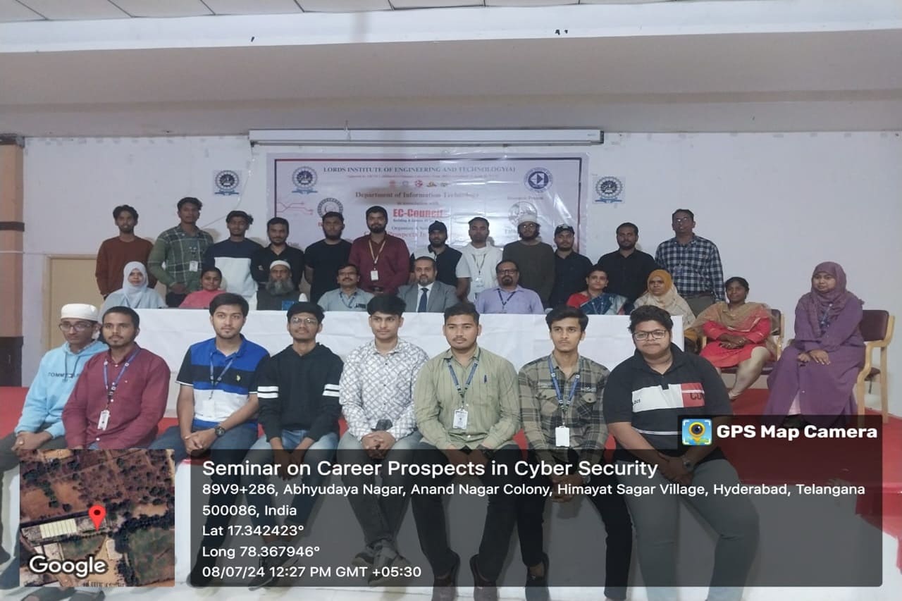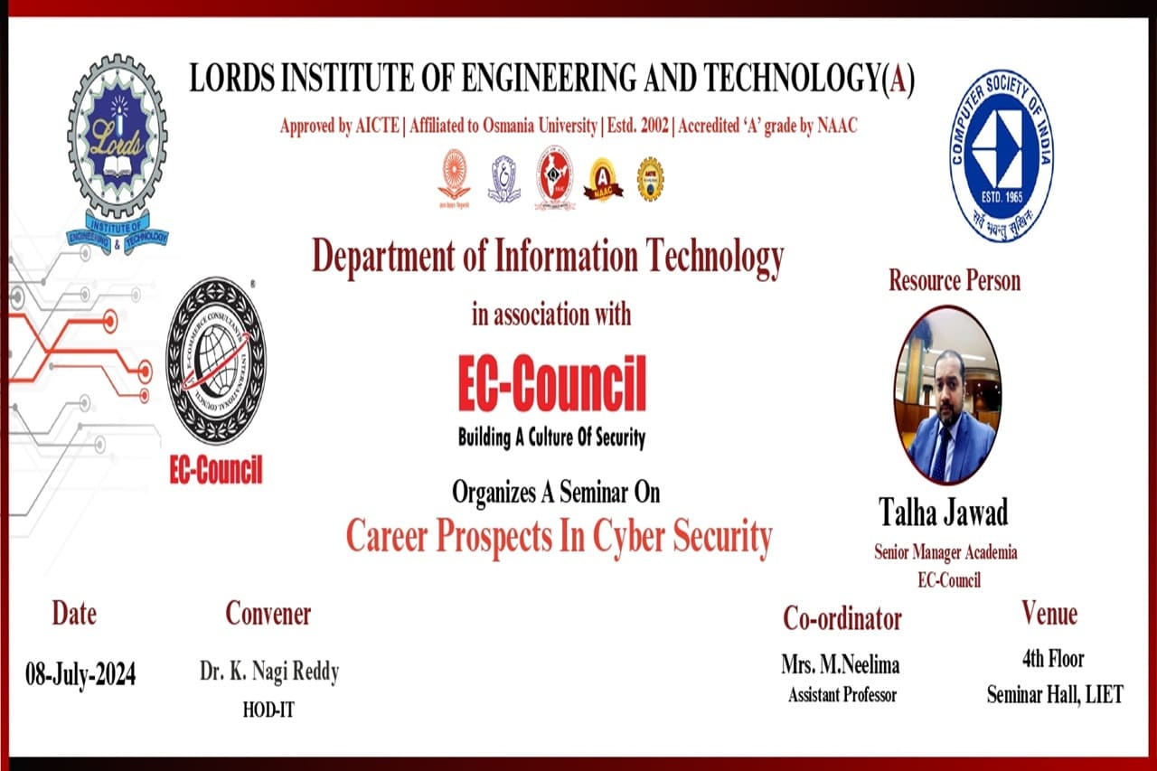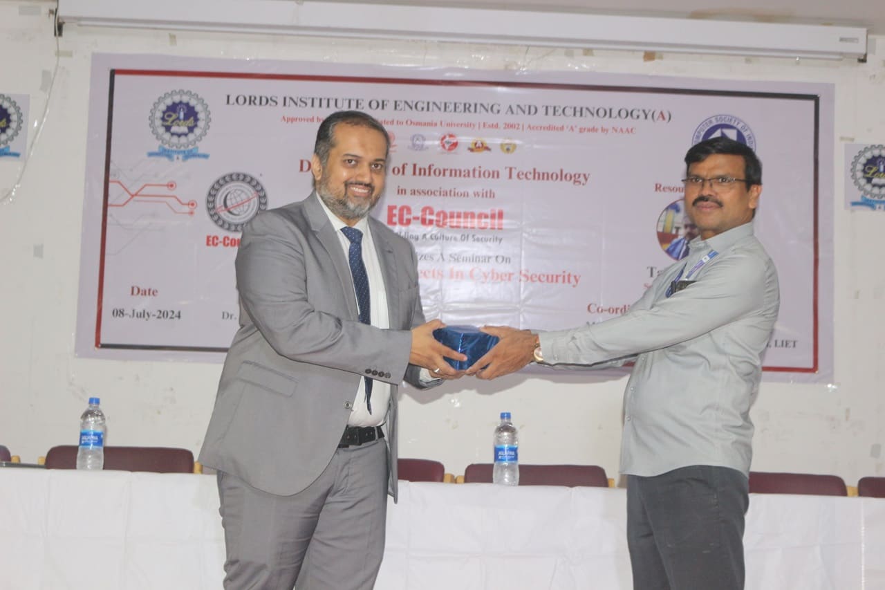 Description: The Seminar on “Career Prospects in Cyber Security” was organized by Department of IT in association with EC-Council on 08th July 2024 from 10:30AM to 12:30 PM at Lords Institute of Engineering and Technology. The Seminar on “Career Prospects in Cyber Security” was conducted for the benefit of Second-Year Students. The resource person of the seminar was Mr.Talha Jawad, Senior Manager Academia,EC Council.Total 189 registered students from IT & CSE Allied departments have attended the seminar. The main Objective of the event is to explore high demand world of Cyber Security and safeguard the digital world. The Session was very much appreciated by the student’s fraternity and the faculty members.