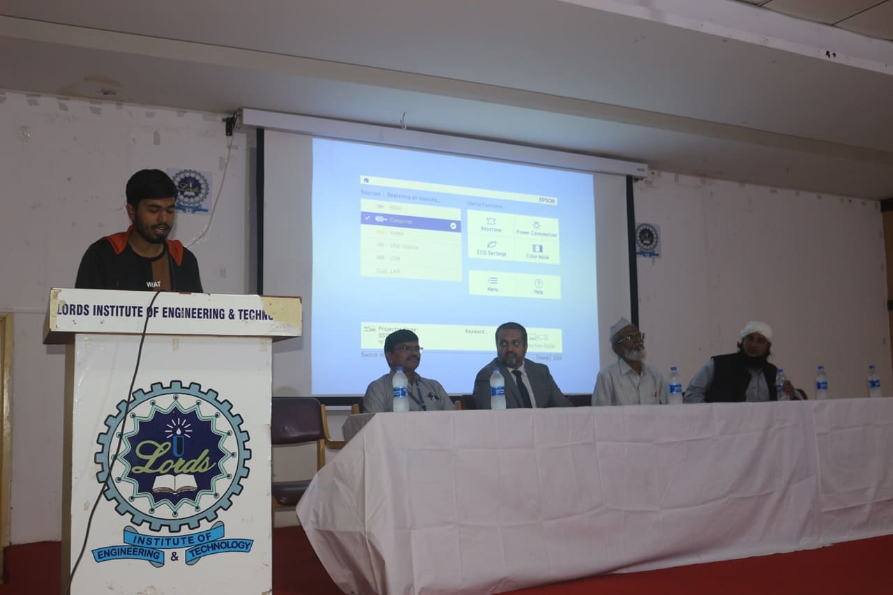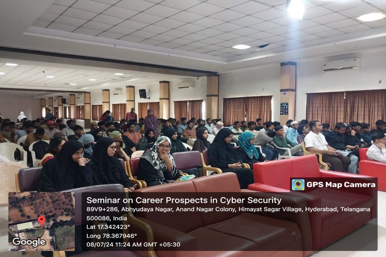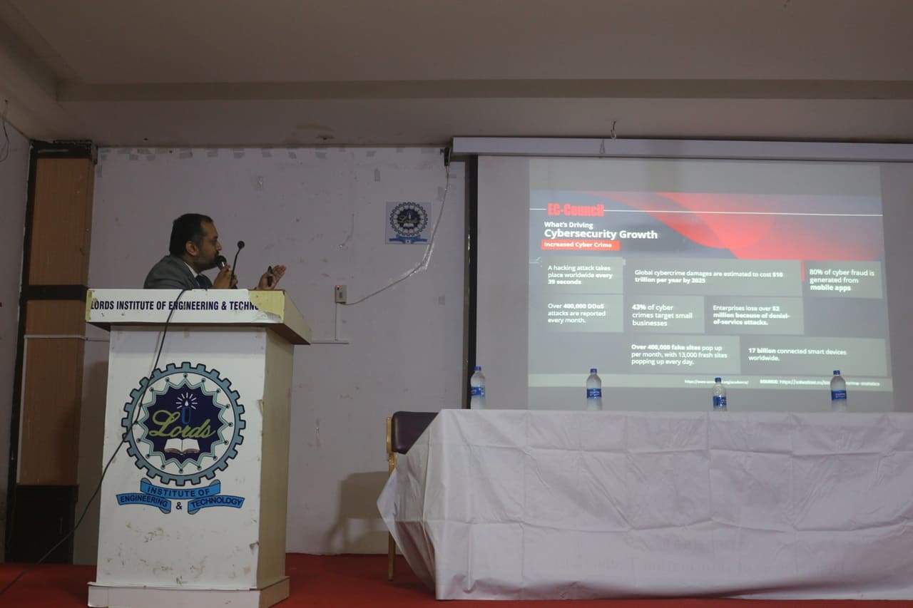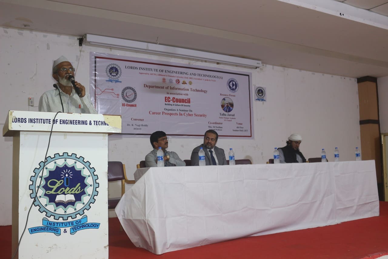 Description: The Seminar on “Career Prospects in Cyber Security” was organized by Department of IT in association with EC-Council on 08th July 2024 from 10:30AM to 12:30 PM at Lords Institute of Engineering and Technology. The Seminar on “Career Prospects in Cyber Security” was conducted for the benefit of Second-Year Students. The resource person of the seminar was Mr.Talha Jawad, Senior Manager Academia,EC Council.Total 189 registered students from IT & CSE Allied departments have attended the seminar. The main Objective of the event is to explore high demand world of Cyber Security and safeguard the digital world. The Session was very much appreciated by the student’s fraternity and the faculty members.
