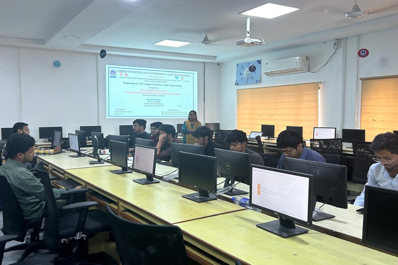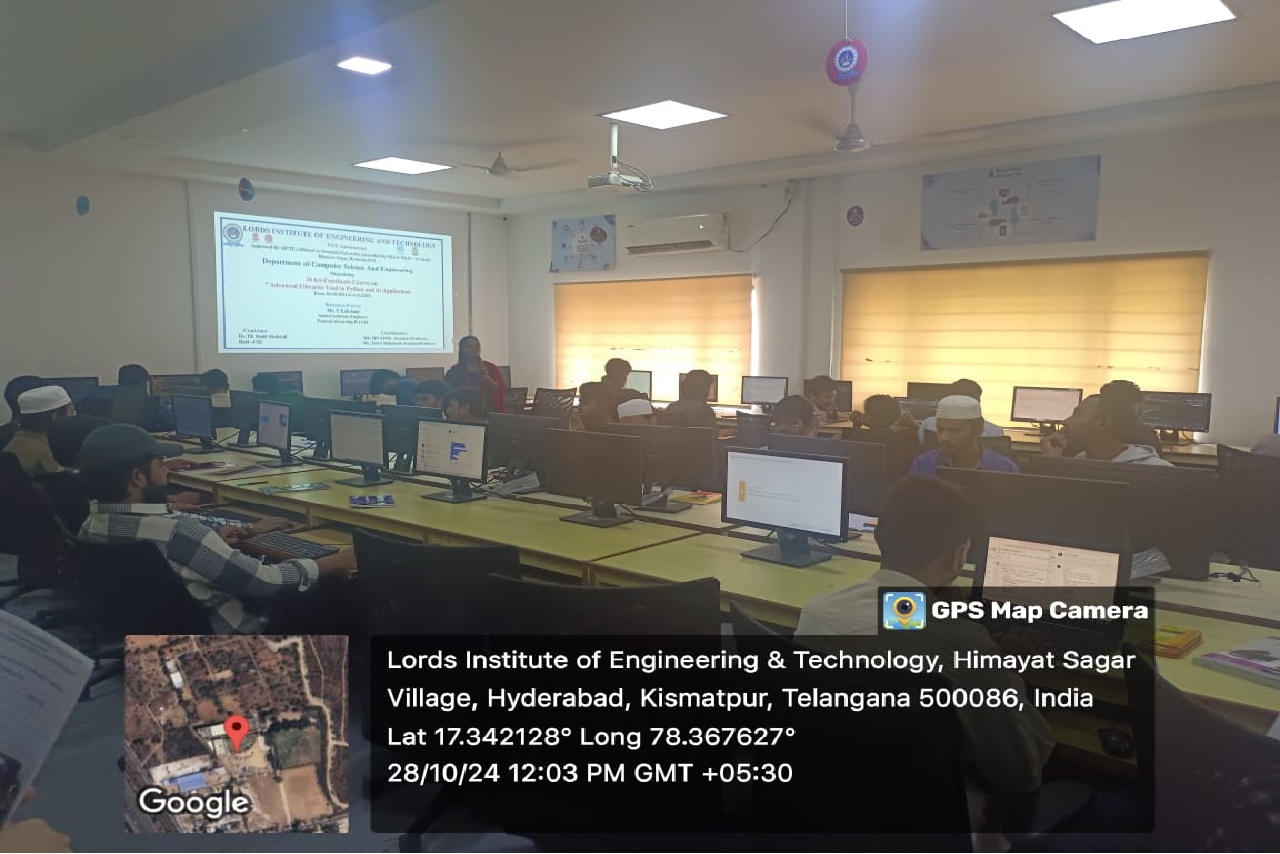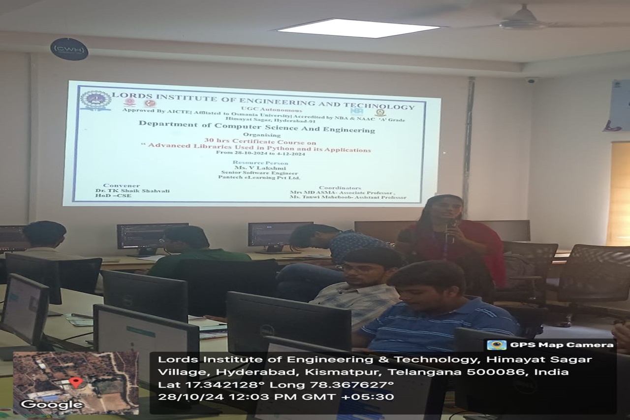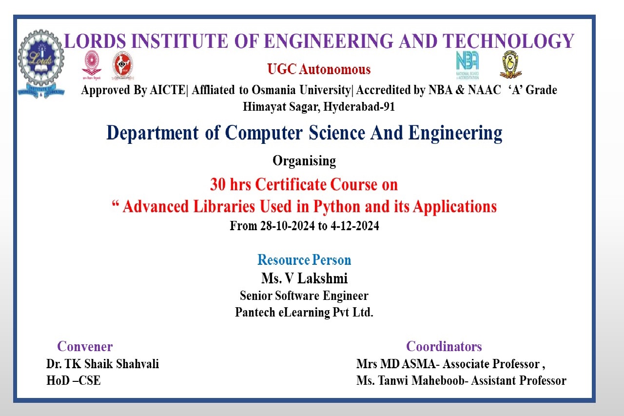 Description about the Event: Department of the CSE was conducted a 30hrs Certificate Course on ” Advanced Libraries used in Python and its Applications “was conducted on 28-10-2024 to 04-12-2024 at A.P.J Abdul Kalam Seminar Hall, II floor, Dr. Ravi Kishore Singh, Principal LIET, Dr T. k. Shavali Hod- CSE graced the event. Associate Hod -CSE has welcomed all the participants and the guest faculty.By the end of the session students got the valuable Knowledge on Python libraries as it is a collection of related modules. It contains bundles of code that can be used repeatedly in different programs.TensorFlow, Matplotlib, Pandas, Numpy, SciPy, Scrapy, Scikit-learn, PyGame, PyTorch, PyBrain are some advanced libraries used in python.Python being so popular and so technologically advanced has multiple use cases and has real-life applications like Web Development,Data Science, Web Scrapping and Automation, CAD, Artificial Intelligence and Machine Learning etc