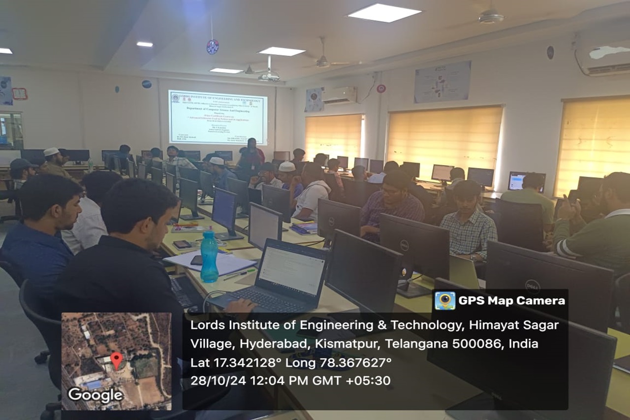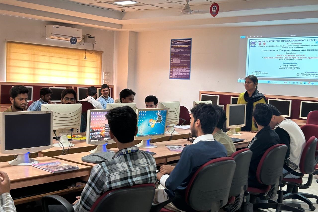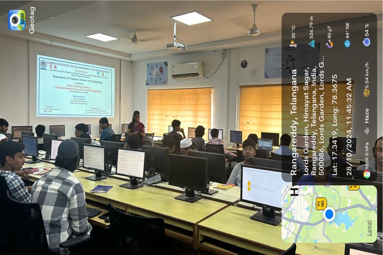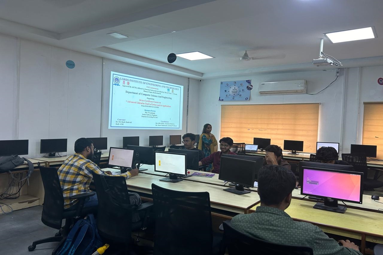 Description about the Event: Department of the CSE was conducted a 30hrs Certificate Course on ” Advanced Libraries used in Python and its Applications “was conducted on 28-10-2024 to 04-12-2024 at A.P.J Abdul Kalam Seminar Hall, II floor, Dr. Ravi Kishore Singh, Principal LIET, Dr T. k. Shavali Hod- CSE graced the event. Associate Hod -CSE has welcomed all the participants and the guest faculty.By the end of the session students got the valuable Knowledge on Python libraries as it is a collection of related modules. It contains bundles of code that can be used repeatedly in different programs.TensorFlow, Matplotlib, Pandas, Numpy, SciPy, Scrapy, Scikit-learn, PyGame, PyTorch, PyBrain are some advanced libraries used in python.Python being so popular and so technologically advanced has multiple use cases and has real-life applications like Web Development,Data Science, Web Scrapping and Automation, CAD, Artificial Intelligence and Machine Learning etc