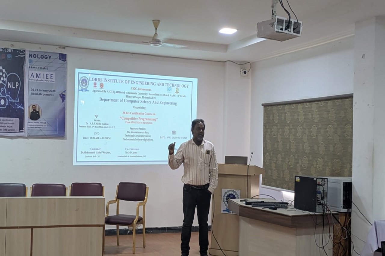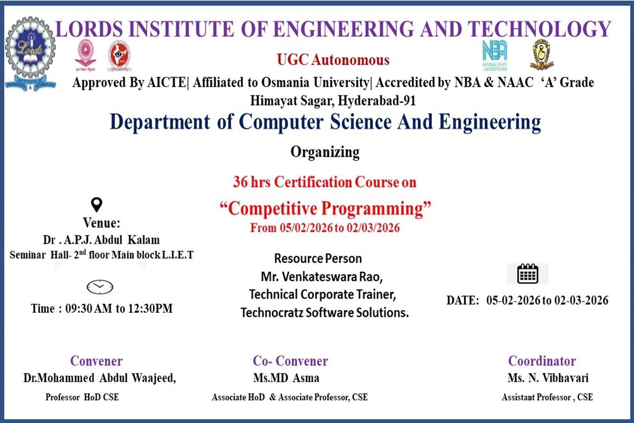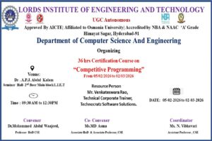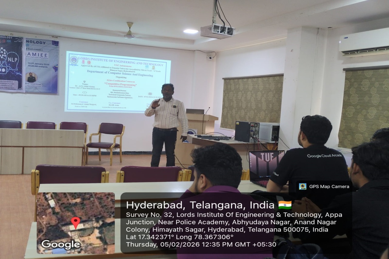 Description: The Department of Computer Science and Engineering organized a 36-hour Certification Course on “Competitive Programming” from 05 February 2026 to 02 March 2026 at Dr. A.P.J. Abdul Kalam Seminar Hall, L.I.E.T. The sessions were conducted by Mr. Venkateswara Rao, Technical Corporate Trainer from Technocratz Software Solutions. The course helped students improve their problem-solving skills, logical thinking, and coding techniques required for competitive programming and technical interviews.