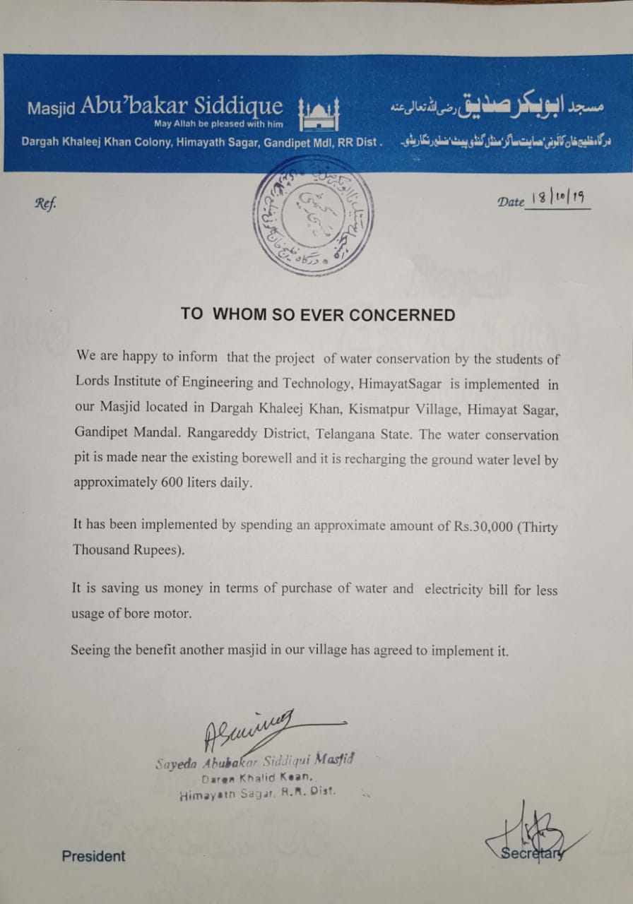 Rain Water Harvesting Pit designed and executed by students for Masjid in HimayatsagarPhoto Gallery