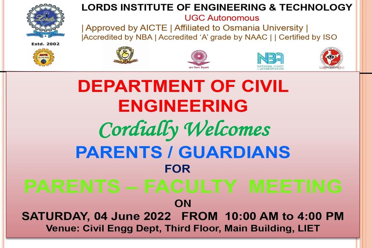 Events Civil PTM 2022 admin June 1, 2022 Title:Parent-Teacher Meeting 2022 Department / Cell: Civil Engineering Date : 04/06/2022 Venue: Department Library, Main Building No.of parents Attended: 19 ← CSM Parent Teacher Meet Workshop on MAD →