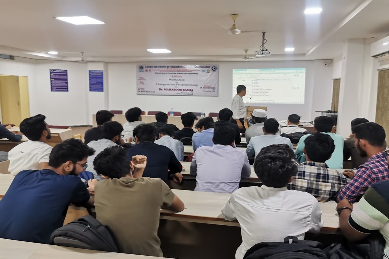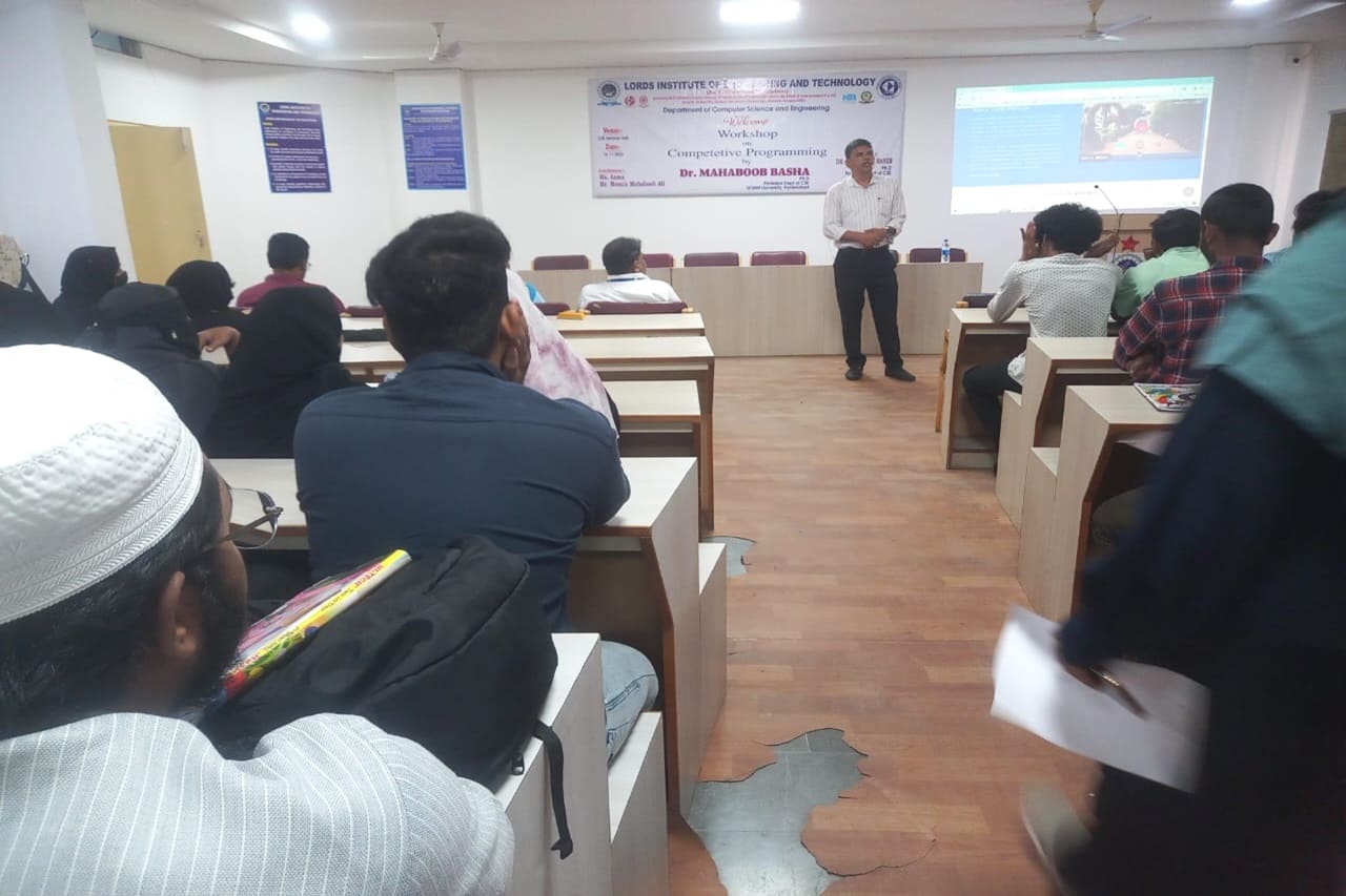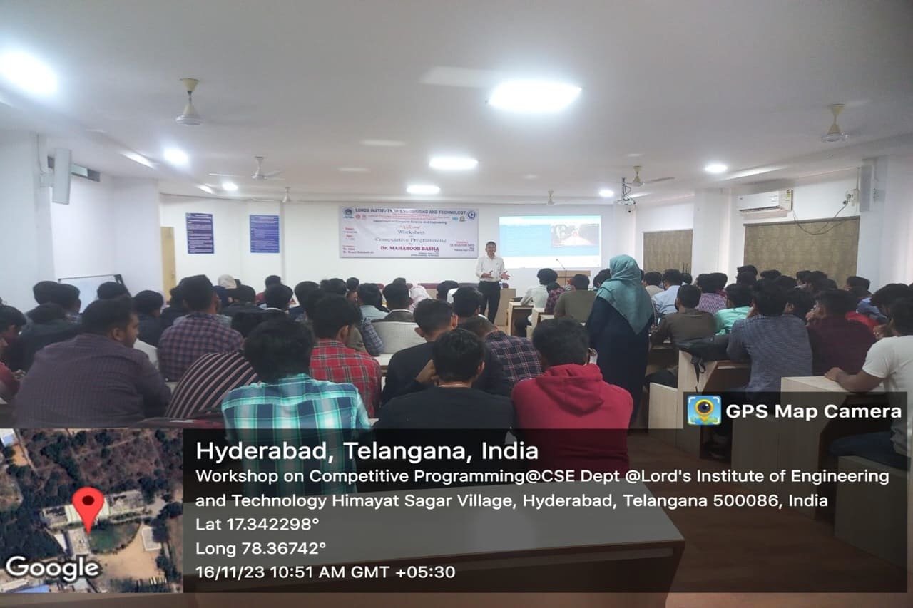 Description: A one-day Workshop was conducted on “Competitive Programming” by the department of Computer Science and Engineering -Lords college of engineering and technology. This event was conducted at CSE Seminar Hall with students participating. The speakers Dr. Mahaboob Basha Shaik(Professor, GITAMs University) has delivered hands on session about , Python Programming -Competitive concepts, how Lists/Tuples/Sets, Dictionaries differs from each other, solved problems on list comprehension, Built-in functions , modules and described the importance of third -Party modules.