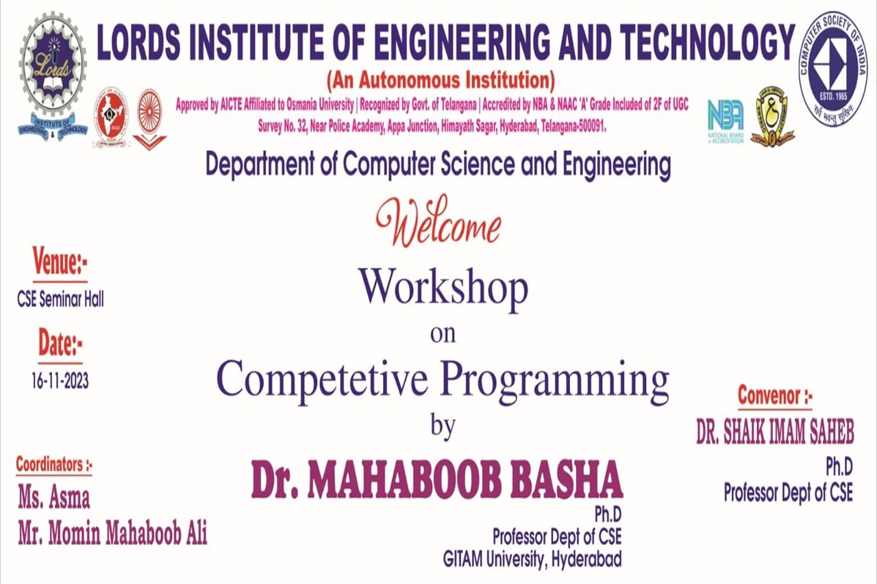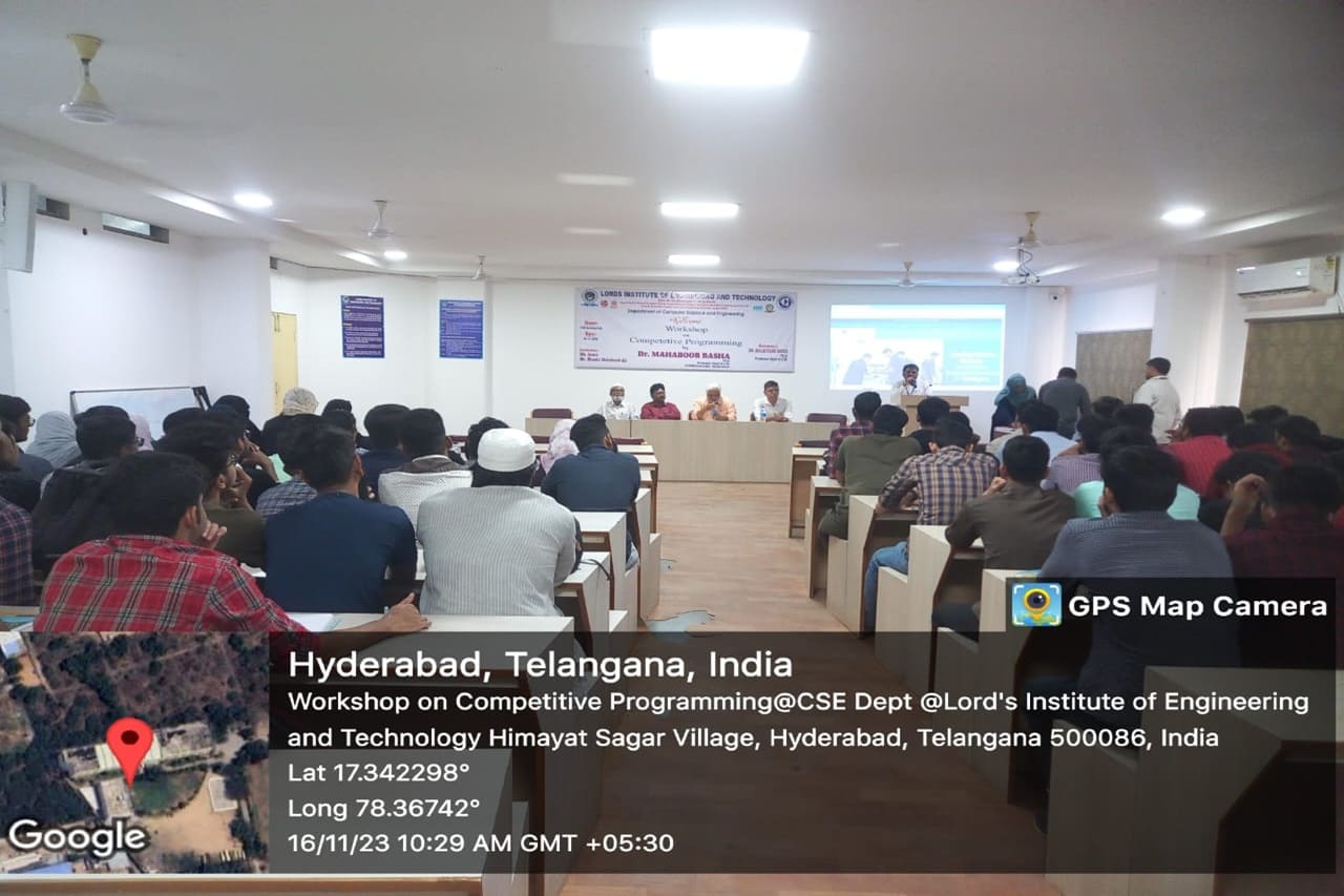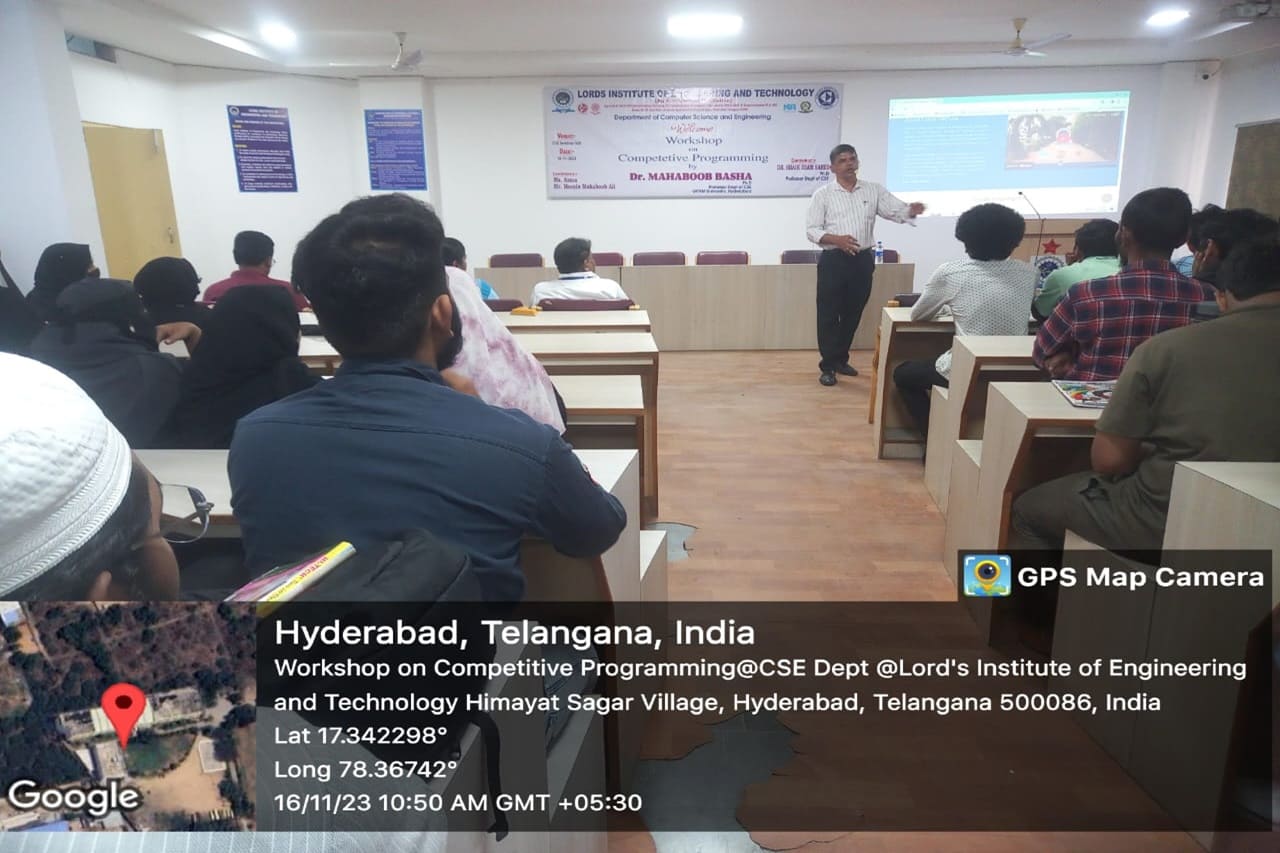 Description: A one-day Workshop was conducted on “Competitive Programming” by the department of Computer Science and Engineering -Lords college of engineering and technology. This event was conducted at CSE Seminar Hall with students participating. The speakers Dr. Mahaboob Basha Shaik(Professor, GITAMs University) has delivered hands on session about , Python Programming -Competitive concepts, how Lists/Tuples/Sets, Dictionaries differs from each other, solved problems on list comprehension, Built-in functions , modules and described the importance of third -Party modules.