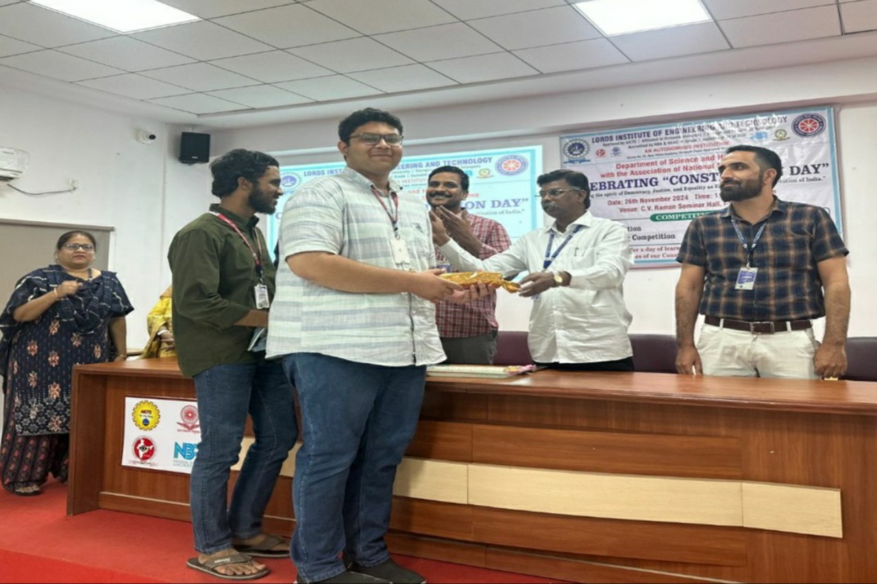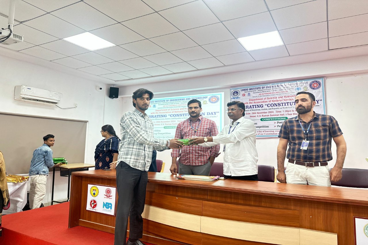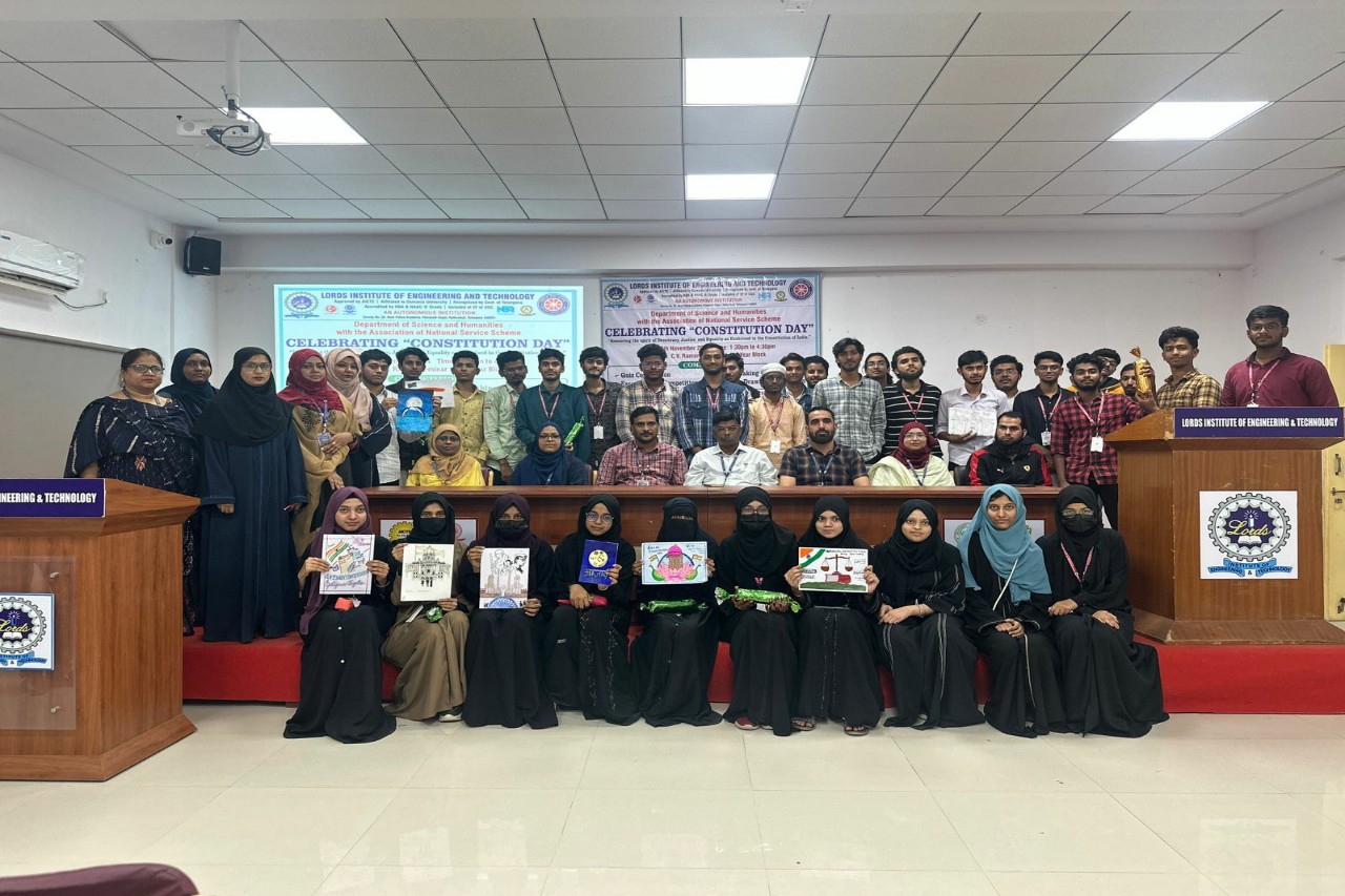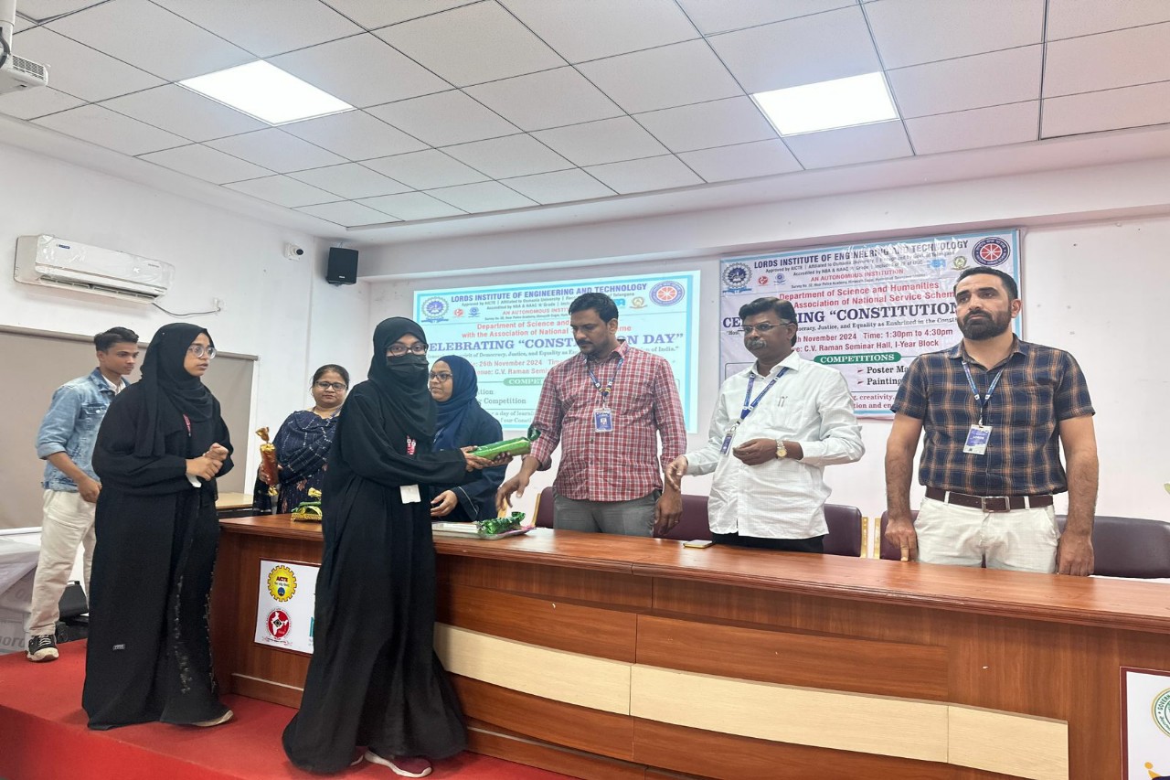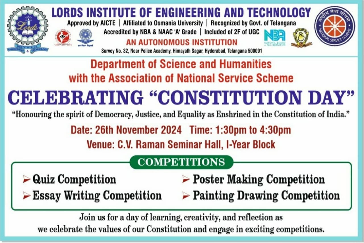 Description: The Department of Science and Humanities with association of National Service Scheme (NSS)at Lords Institute of Engineering and Technology in association with the Department of Science and Humanities celebrated “Constitution Day” on 26th November, 2024 from 1.30 to 4.30 pm at C.V.Raman Seminar Hall, First Year Block, LIET(A). There was an active participation from BE First-Year students in various events, including Quiz, Essay Writing, Painting, and Poster Competitions. These activities honored the values of democracy, justice, and equality enshrined in the Indian Constitution. Students showcased their knowledge, creativity, and commitment to constitutional principles, making the event a meaningful tribute to India’s founding ideals. Prizes were awarded to the winners of each competition.