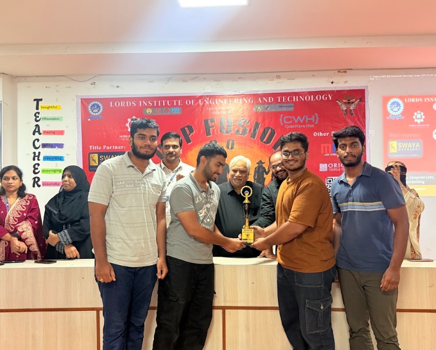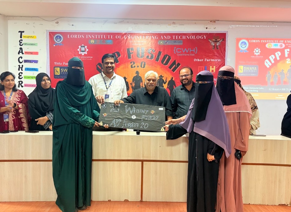 - Congratulations to Mr Yasser Ahmed (160924733246) and Mr Saad Ahmed (160924733420), II CSE students, for securing FIRST place with a cash prize of ₹10,000/- in the AppFussion 2.0 event an Inter college App Development Competition organized by MAD & CWH Club of Lords Institute of Engineering and Technology on 1st November 2025.- Photo-1 | Photo-2