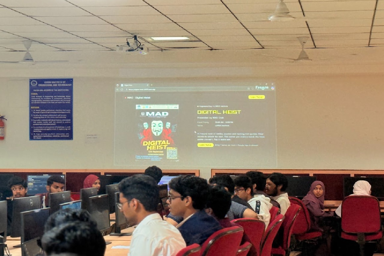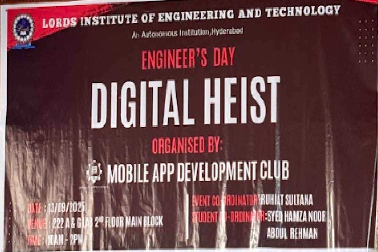 Description: As part of Engineer’s Day 2025 celebrations, Mobile Application development club in the computer lab at Lords Institute of Engineering and Technology (A), conducted a fun-filled and engaging quiz titled “Digital Heist”, comprising 6 exciting rounds on 13 September 2025. The event tested participants’ knowledge in technology, problem-solving, and quick thinking through puzzles and scenario-based challenges on security. Students enthusiastically participated, showcasing their creativity and technical awareness. The event not only provided a competitive spirit but also encouraged learning in an interactive way.