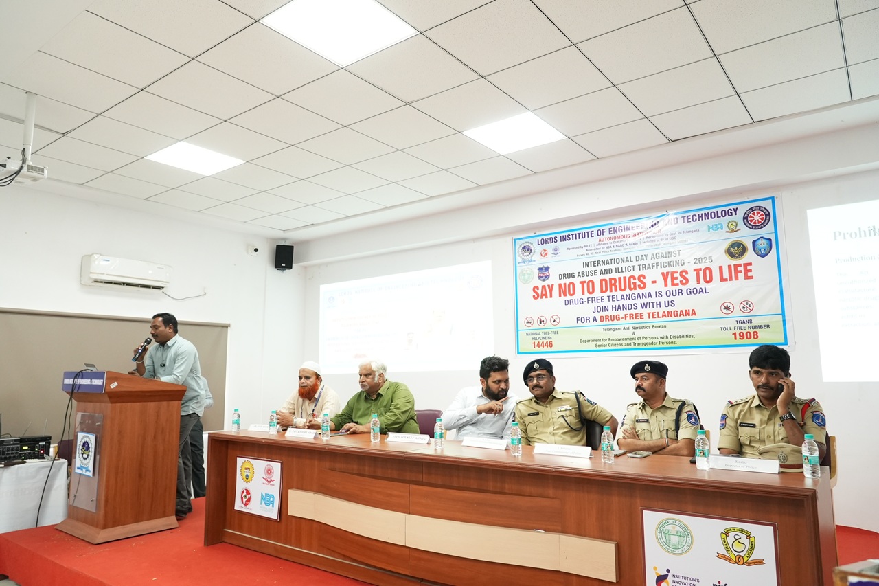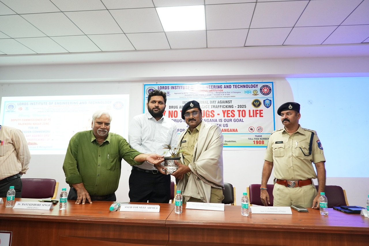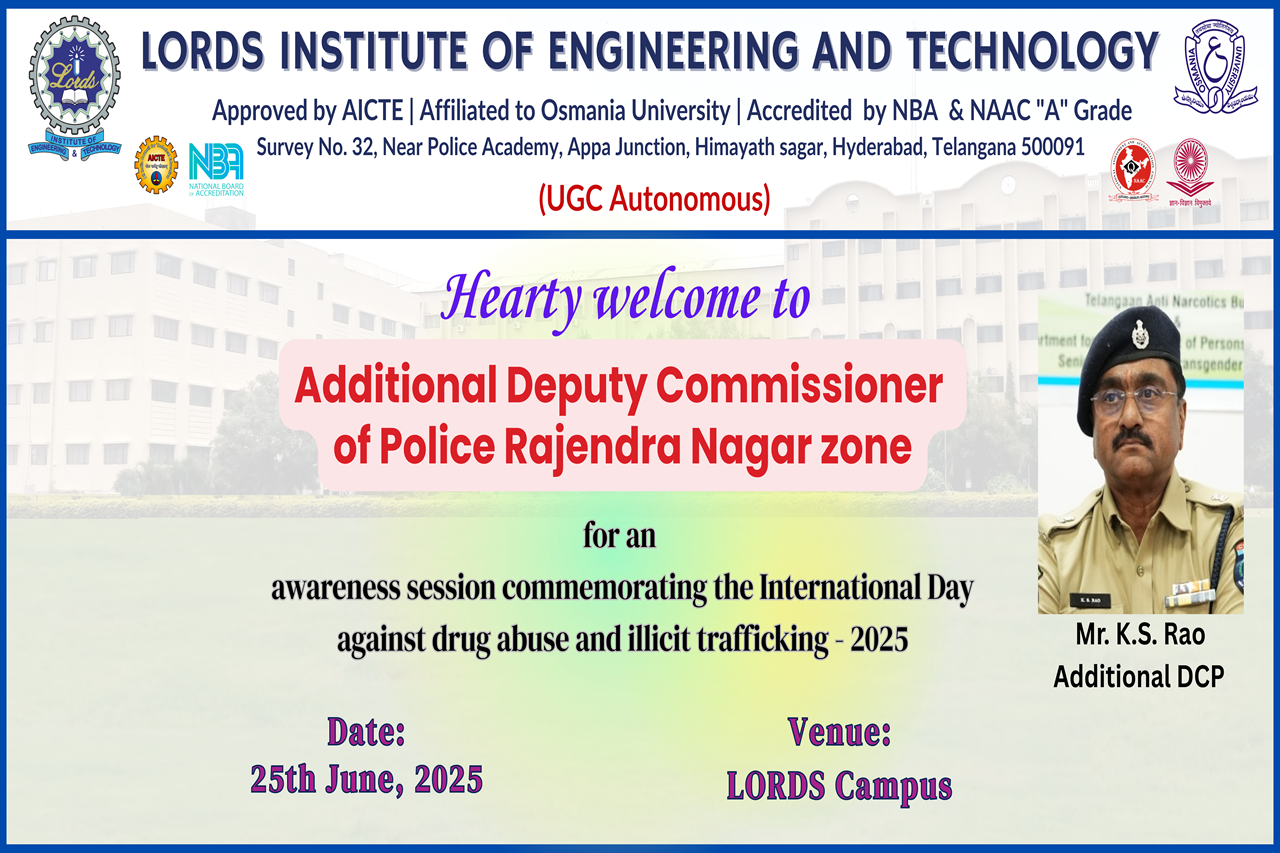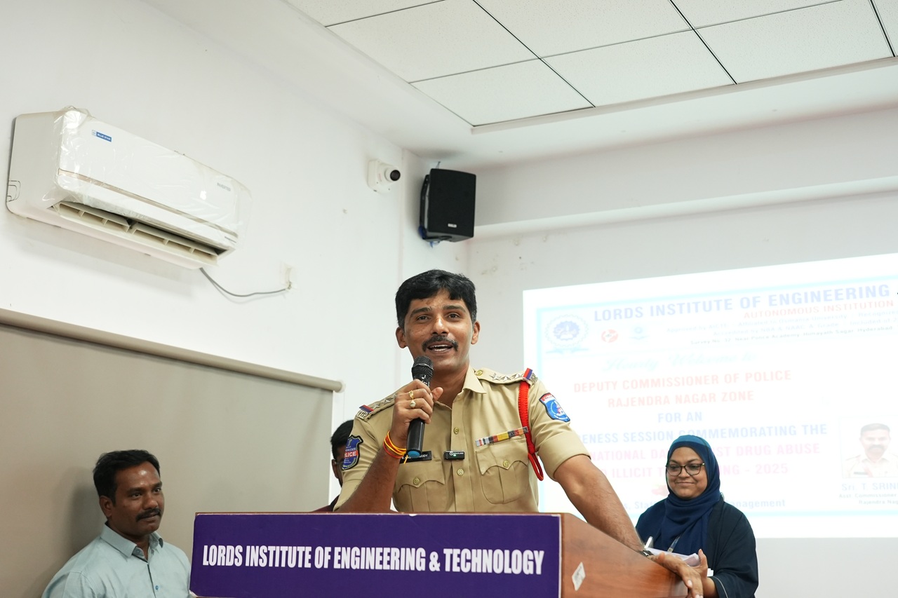 Description: An impactful awareness session was organized by the NSS Cell of Lords Institute of Engineering and Technology on the occasion of the International Day Against Drug Abuse and Illicit Trafficking 2025.The event was honored by the presence of Mr. K.S. Rao, Additional Deputy Commissioner of Police, Rajendra Nagar, who addressed the gathering and delivered a powerful message on the importance of combating drug abuse. The session also witnessed the gracious presence of Sri. CH. Srinivas (DCP, Rajendra Nagar Zone), Sri. T. Srinivas (ACP), and Sri. K. Kastro (Inspector).