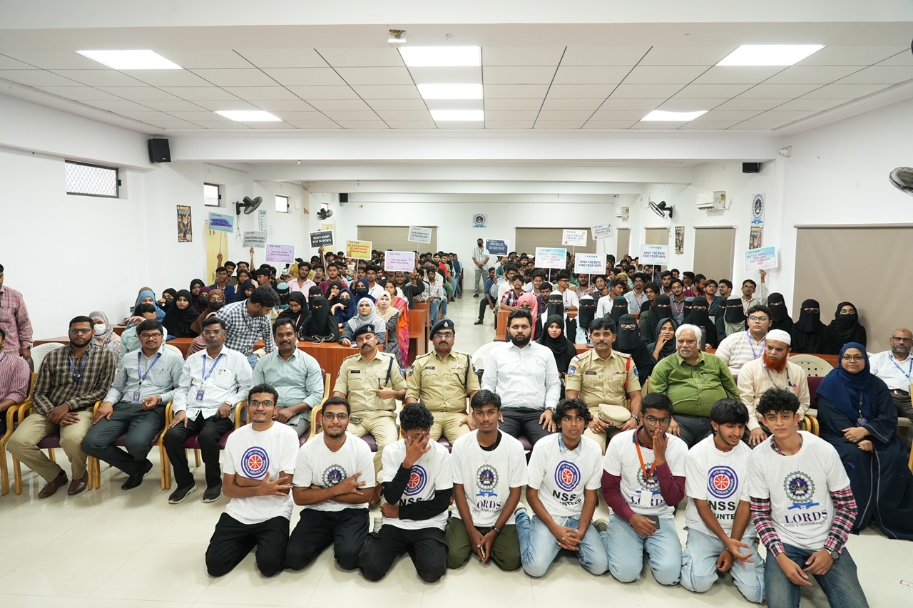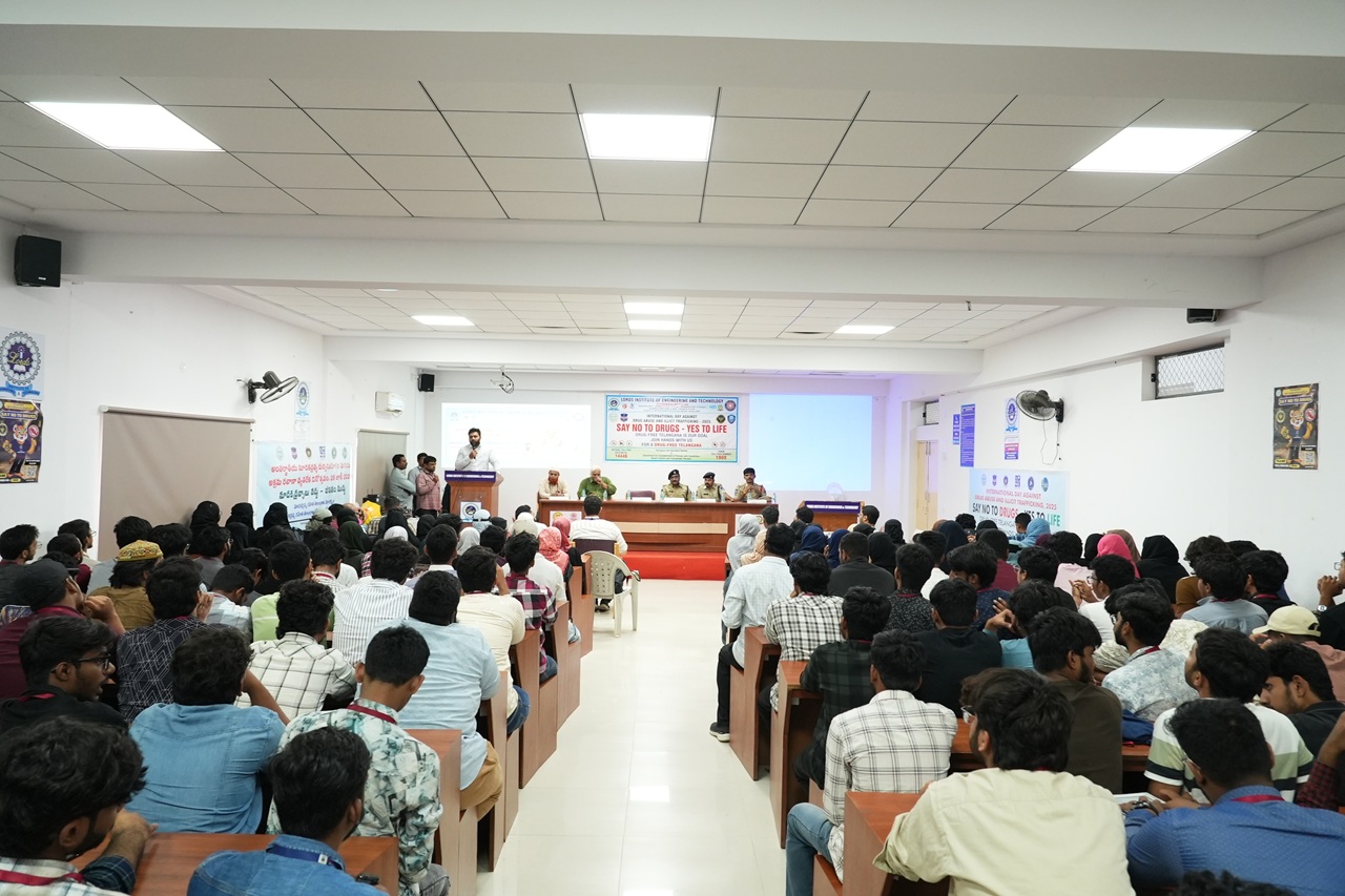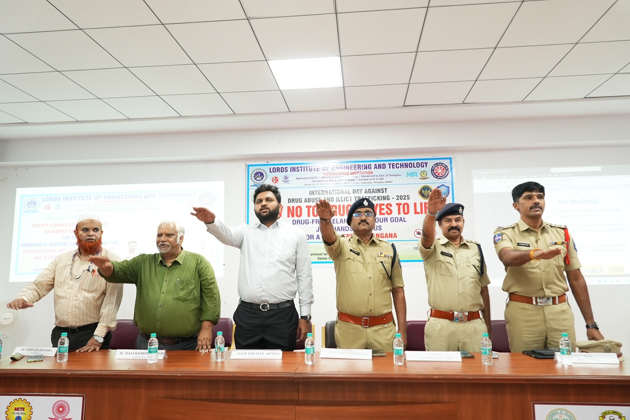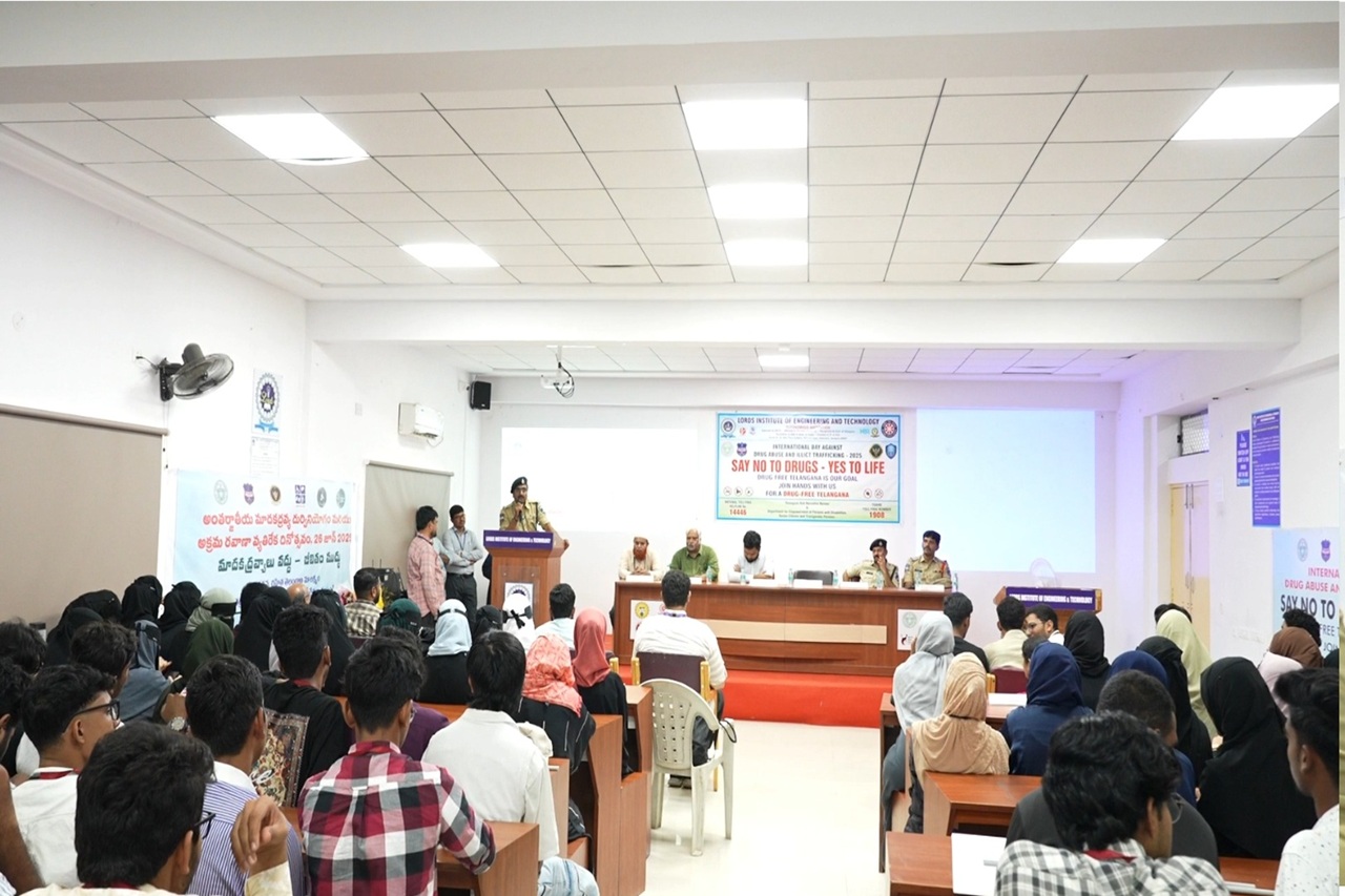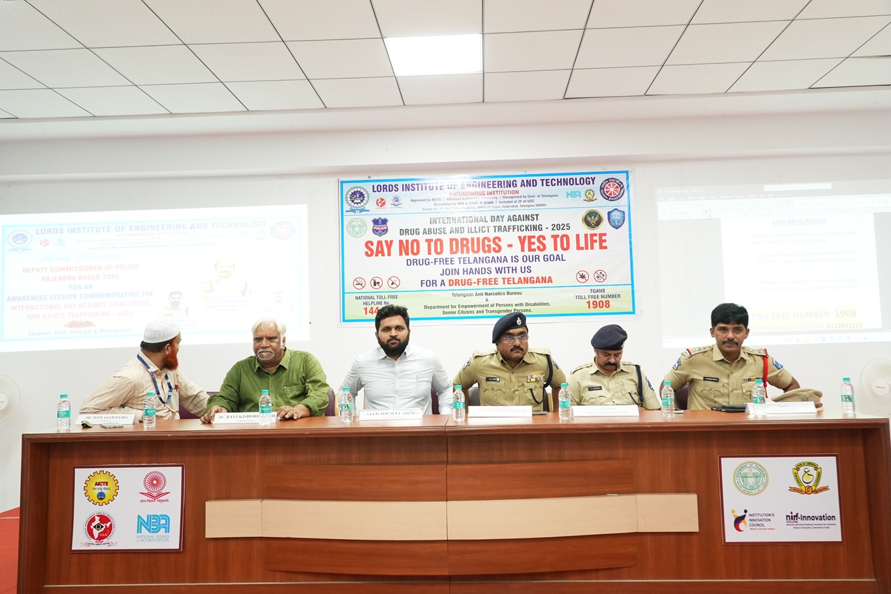Description: An impactful awareness session was organized by the NSS Cell of Lords Institute of Engineering and Technology on the occasion of the International Day Against Drug Abuse and Illicit Trafficking 2025.The event was honored by the presence of Mr. K.S. Rao, Additional Deputy Commissioner of Police, Rajendra Nagar, who addressed the gathering and delivered a powerful message on the importance of combating drug abuse. The session also witnessed the gracious presence of Sri. CH. Srinivas (DCP, Rajendra Nagar Zone), Sri. T. Srinivas (ACP), and Sri. K. Kastro (Inspector).