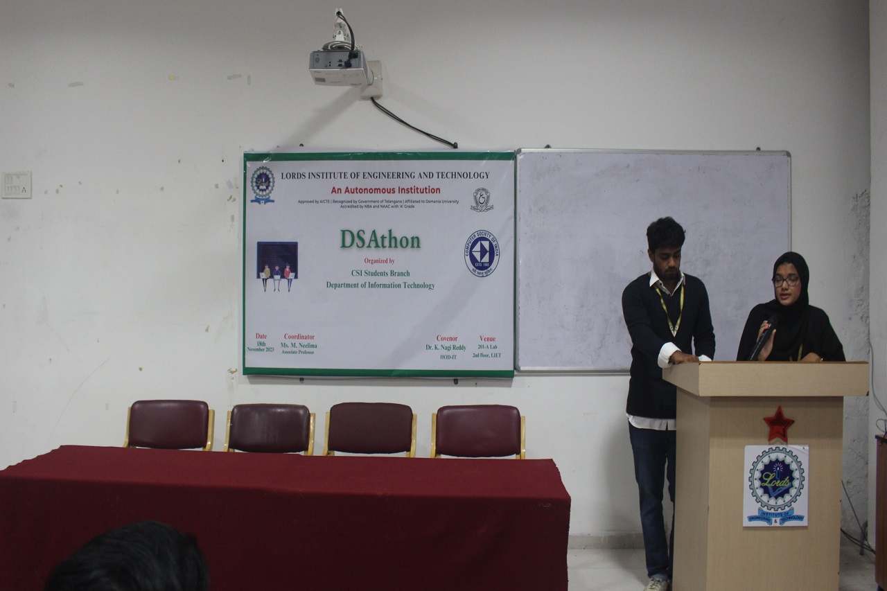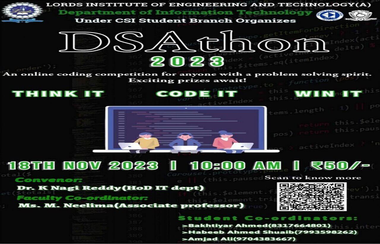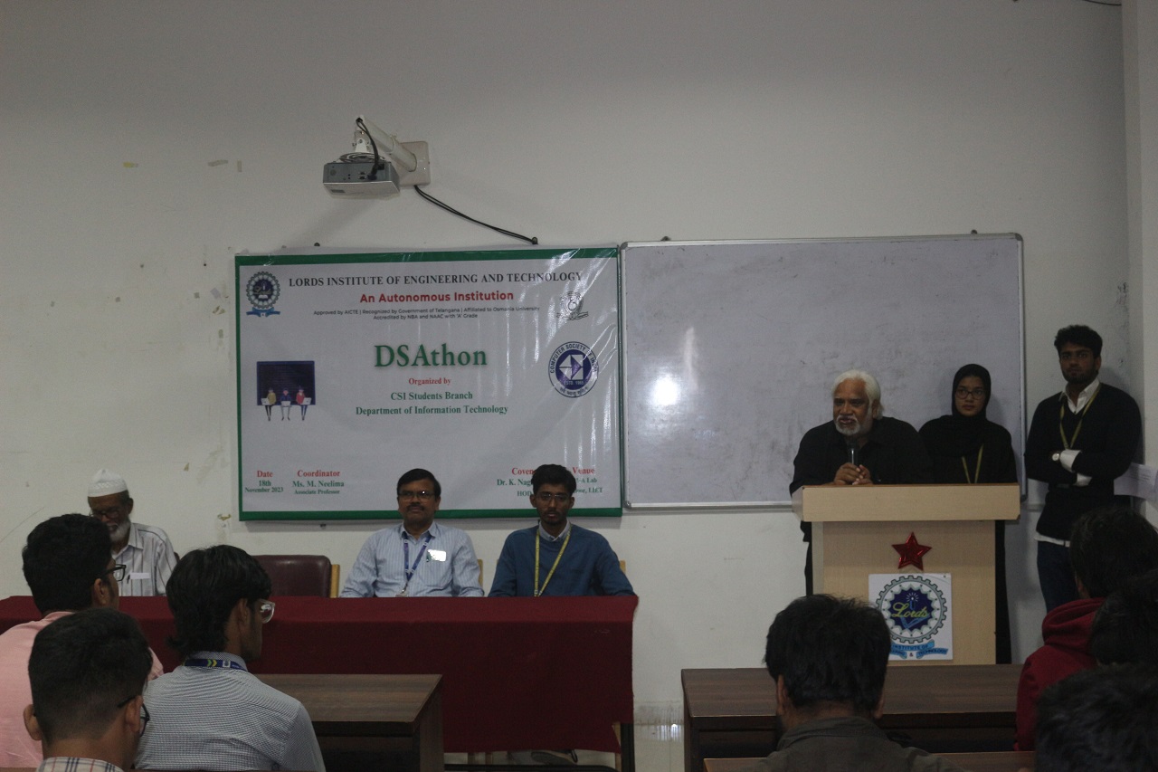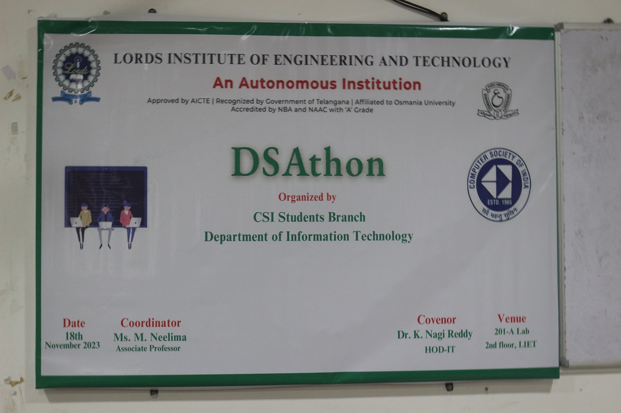 Description: CSI Student Branch, Department of Information Technology organized DSAthon 2023, An online coding competition for anyone with a problem solving spirit on 18th Nov 2023 at IT Smart-Class, IV Floor LIET. The event was graced by Dr. Ravi Kishore Singh, Principal LIET, Dr. T K Shaik Shavali, Dean Students affair and Dr. K Nagi Reddy, HOD-IT. Dr. K Nagi Reddy, convener of the event welcomed all the dignitaries and participants. Ms. M. Neelima was the coordinator of the eventTotal 46 students participated in the event