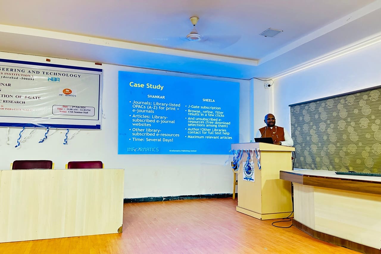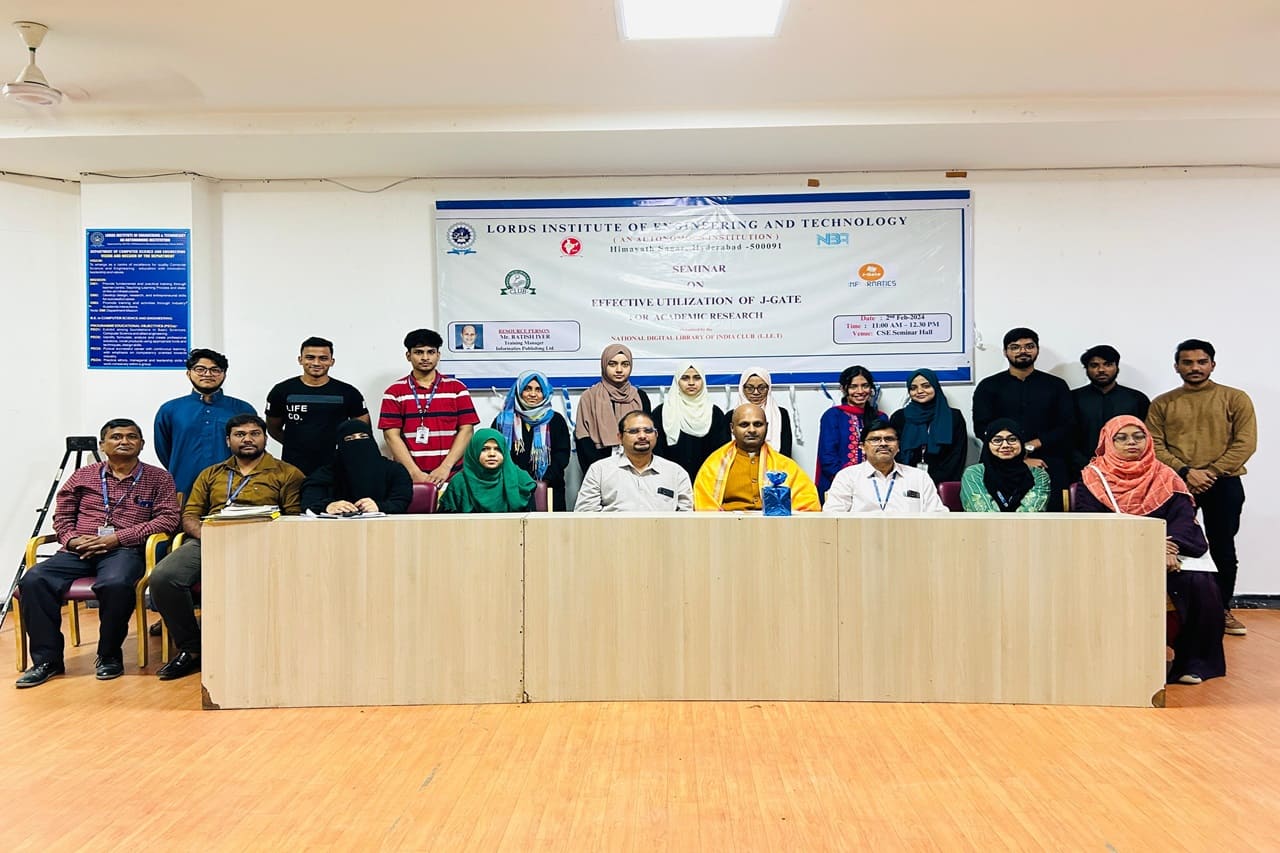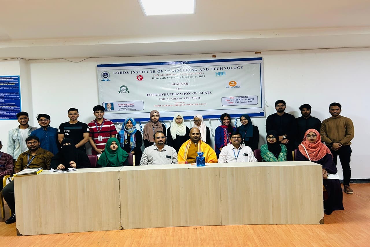 Description: A Seminar on Effective Utilization of J-Gate for Academic Research was organized by Central Library of LIET with the coordination of Central Library Monitoring committee under NDLI Club on 2nd Feb. 2024 (Friday) at Lords Institute of Engineering and Technology, II Floor, CSE Seminar Hall from 11:00 AM to 1:00 PM.